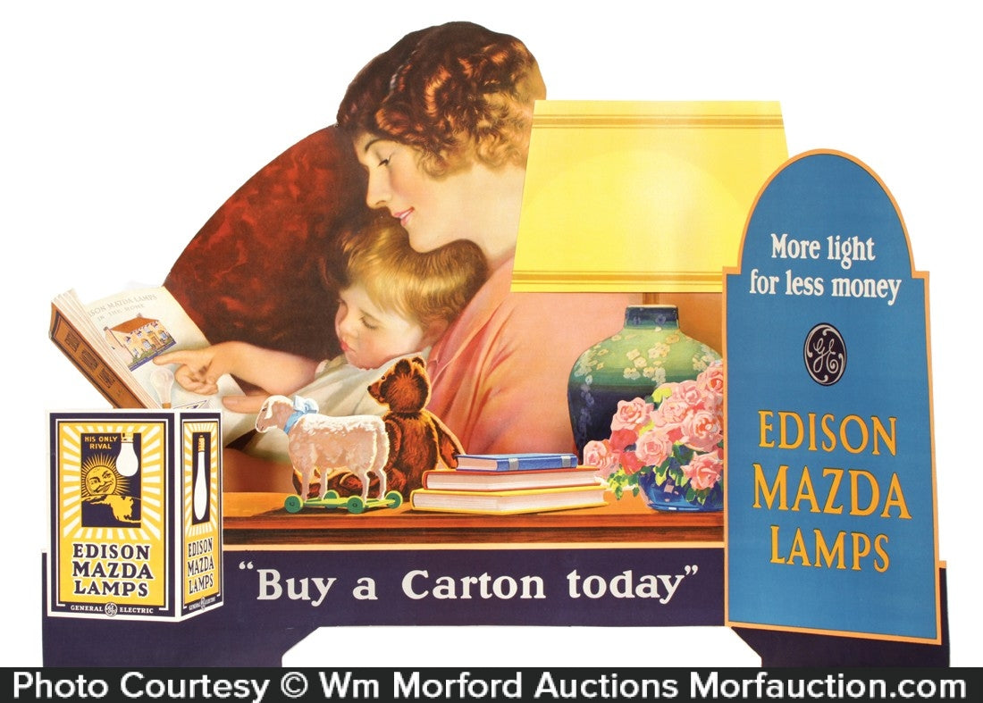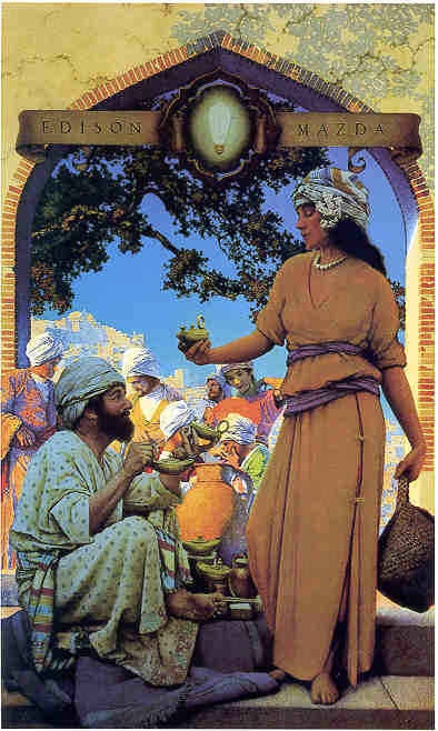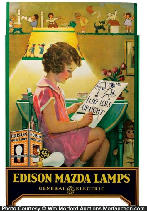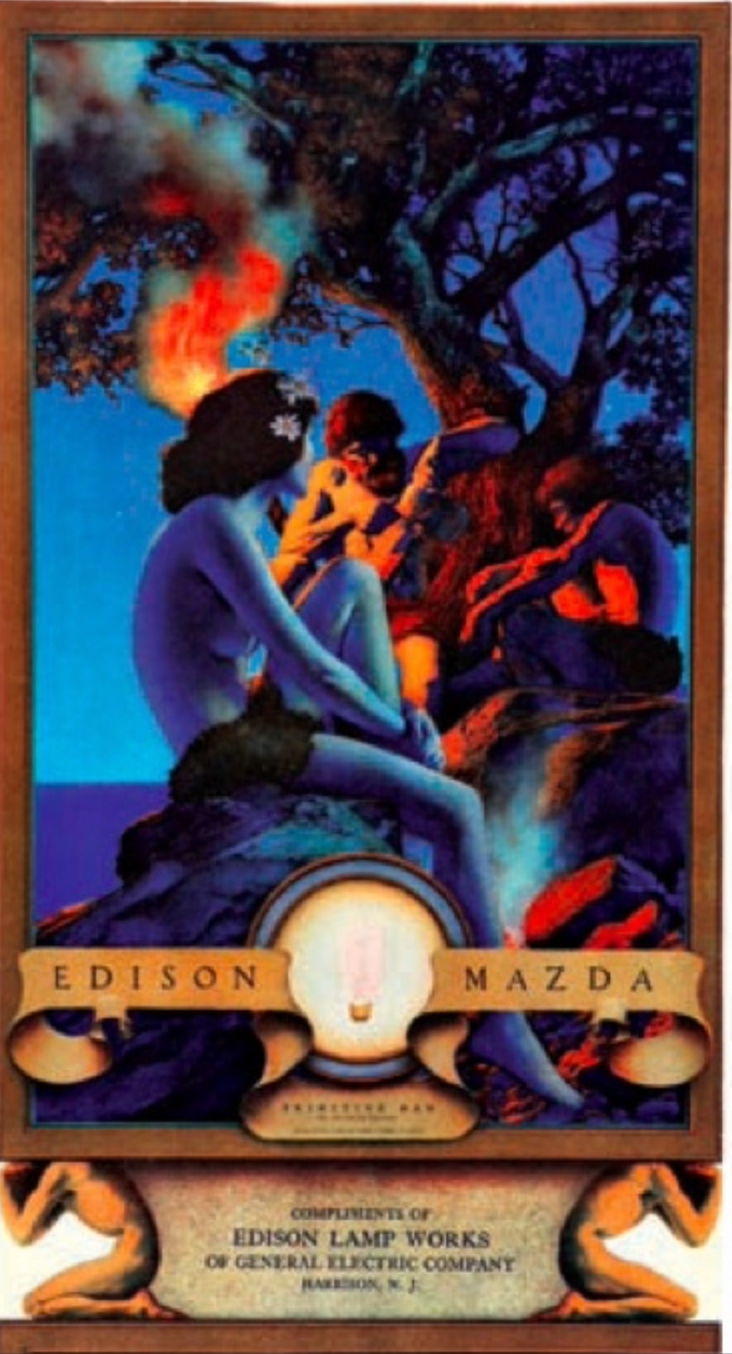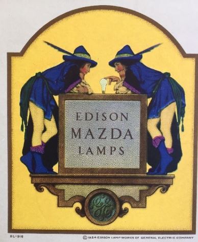 General Electric heavily advertised their MAZDA trademark in one of the most successful advertising campaigns in history. About 1920, the Edison Mazda division of General Electric commissioned world famous artist Maxfield Parrish to create a series of calendars and other advertising based loosely on major events in the history of lighting across the centuries. Parrish's beautiful and most effective works of art created for this advertising campaign are highly collectible and sought after today.