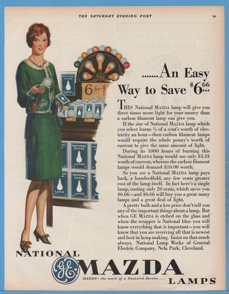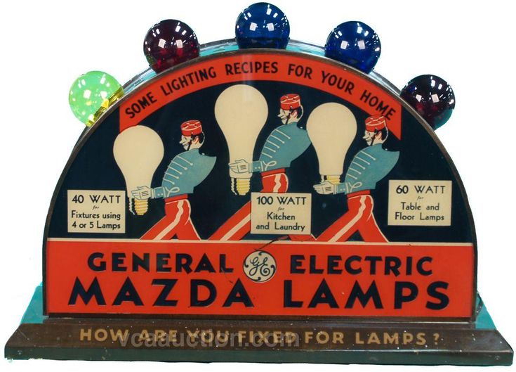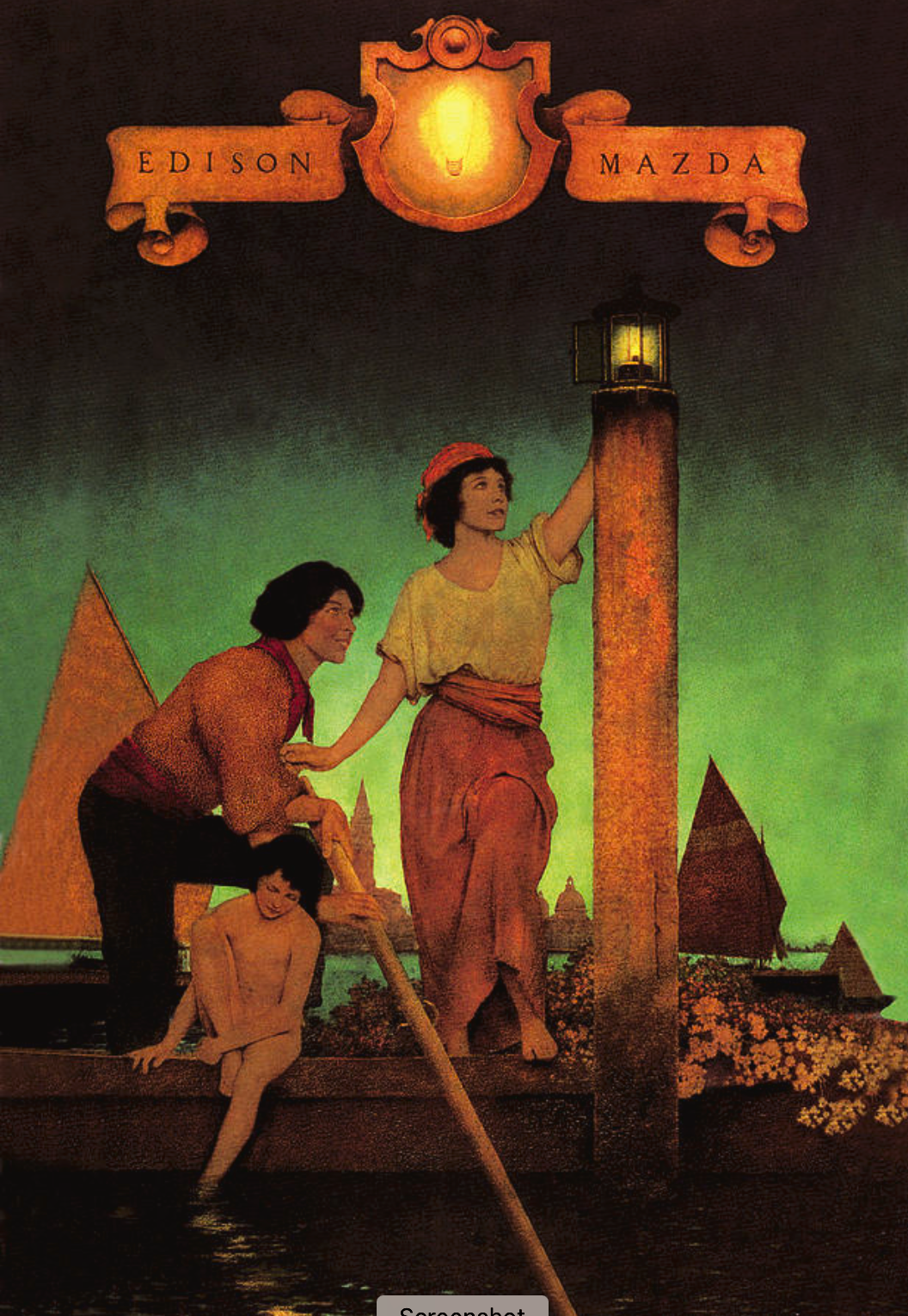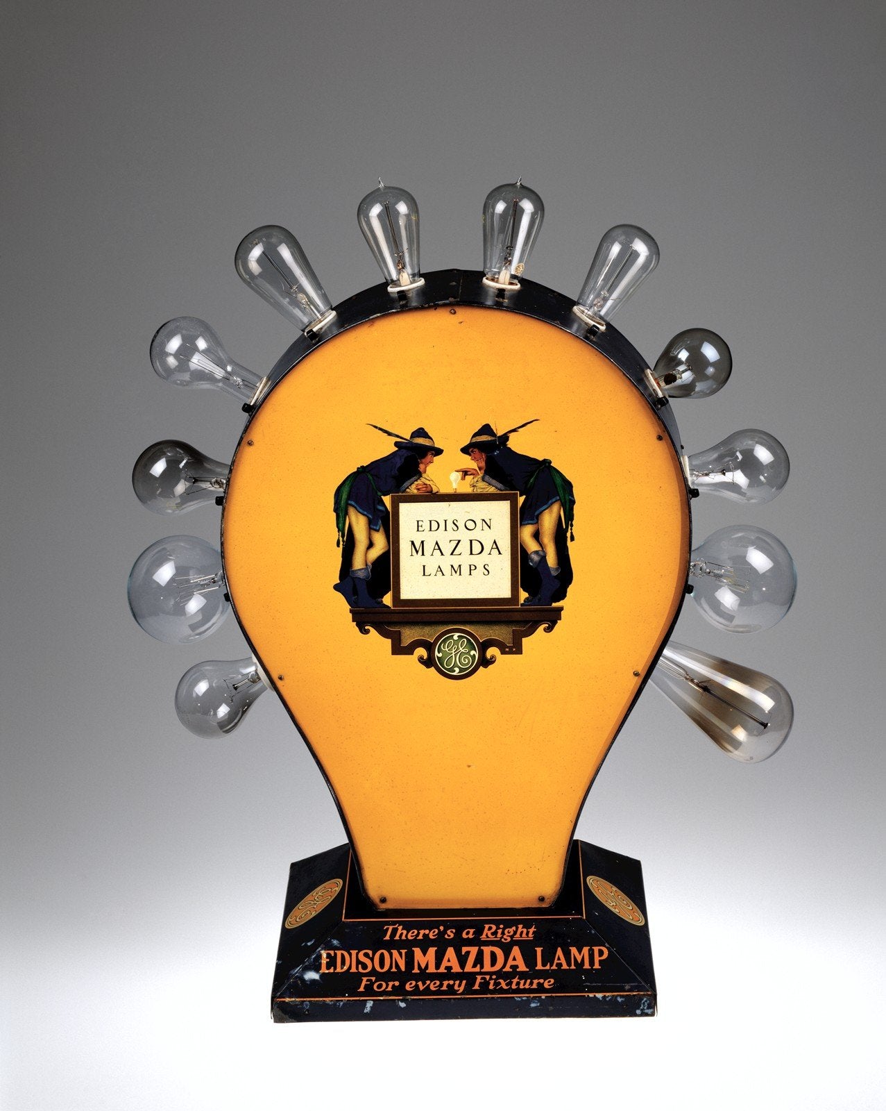 General Electric heavily advertised their MAZDA trademark in one of the most successful advertising campaigns in history. About 1920, the Edison Mazda division of General Electric commissioned world famous artist Maxfield Parrish to create a series of calendars and other advertising based loosely on major events in the history of lighting across the centuries. Parrish's beautiful and most effective works of art created for this advertising campaign are highly collectible and sought after today.