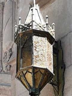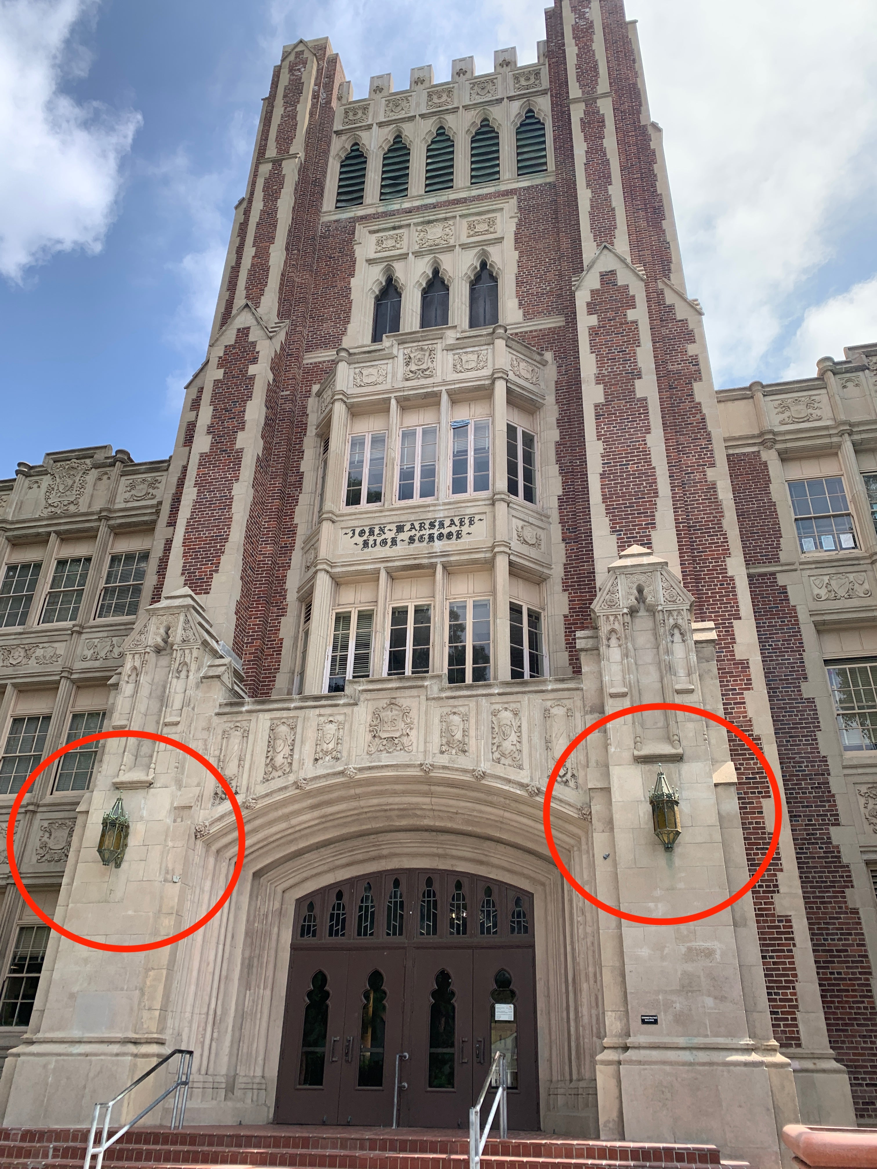 There are two massive lanterns that flank the main entrance to the school. Each one is 100 pounds of bronze and glass. 36" tall and original to the school.