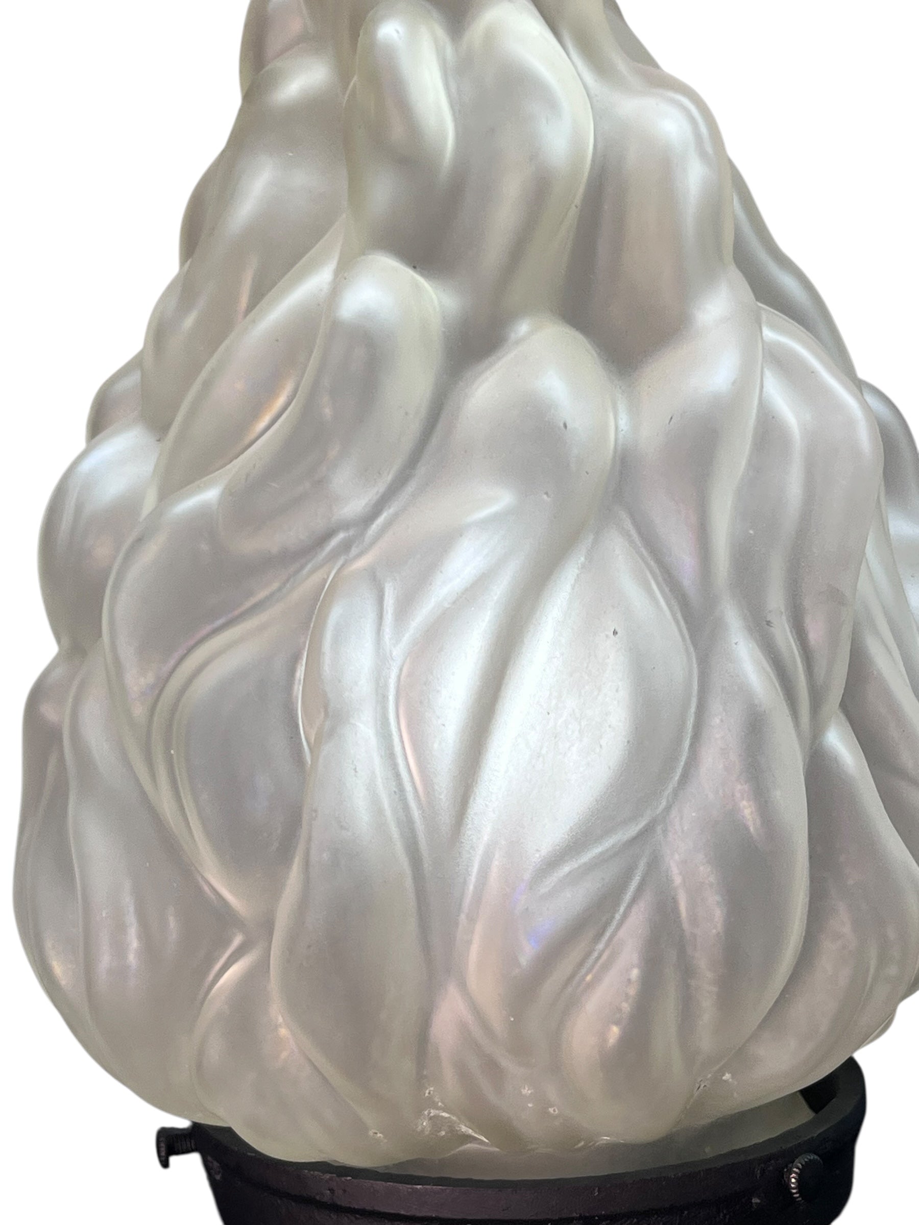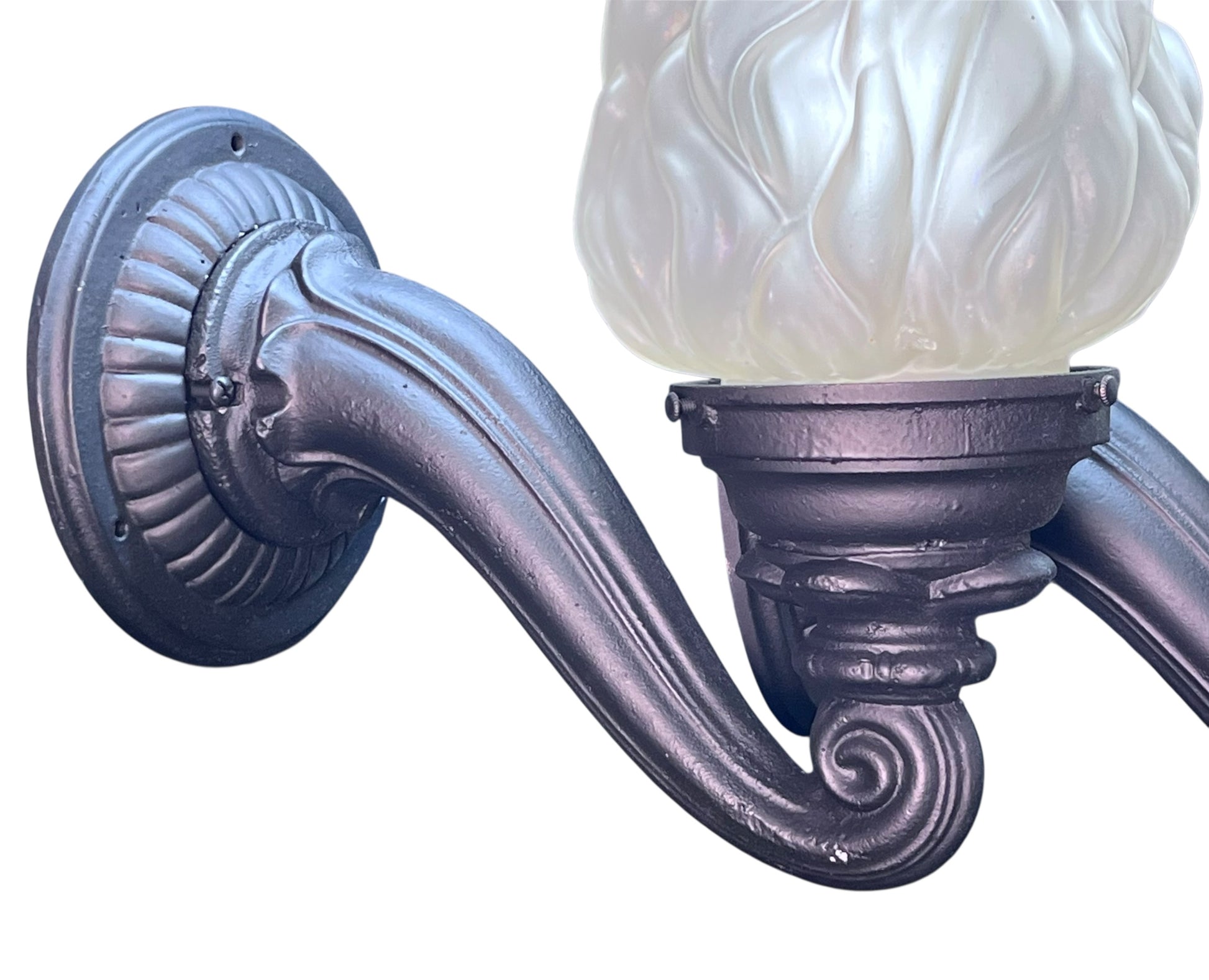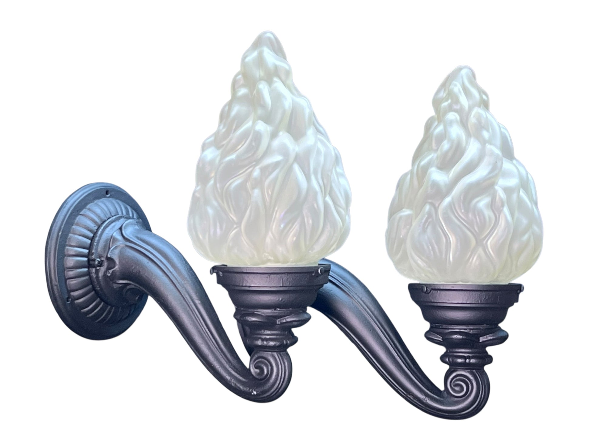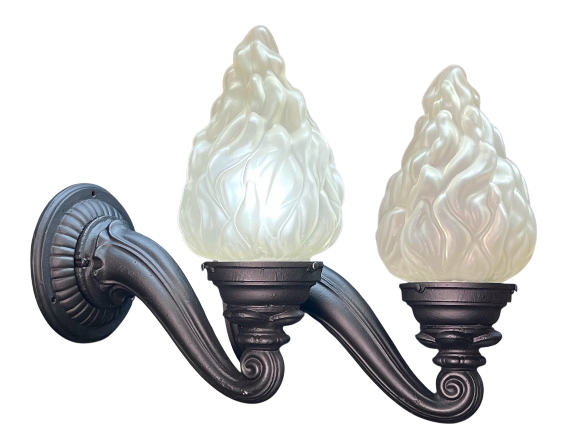 1910s Curved Arm Exterior Sconces with Antique Flame Shades #2552
