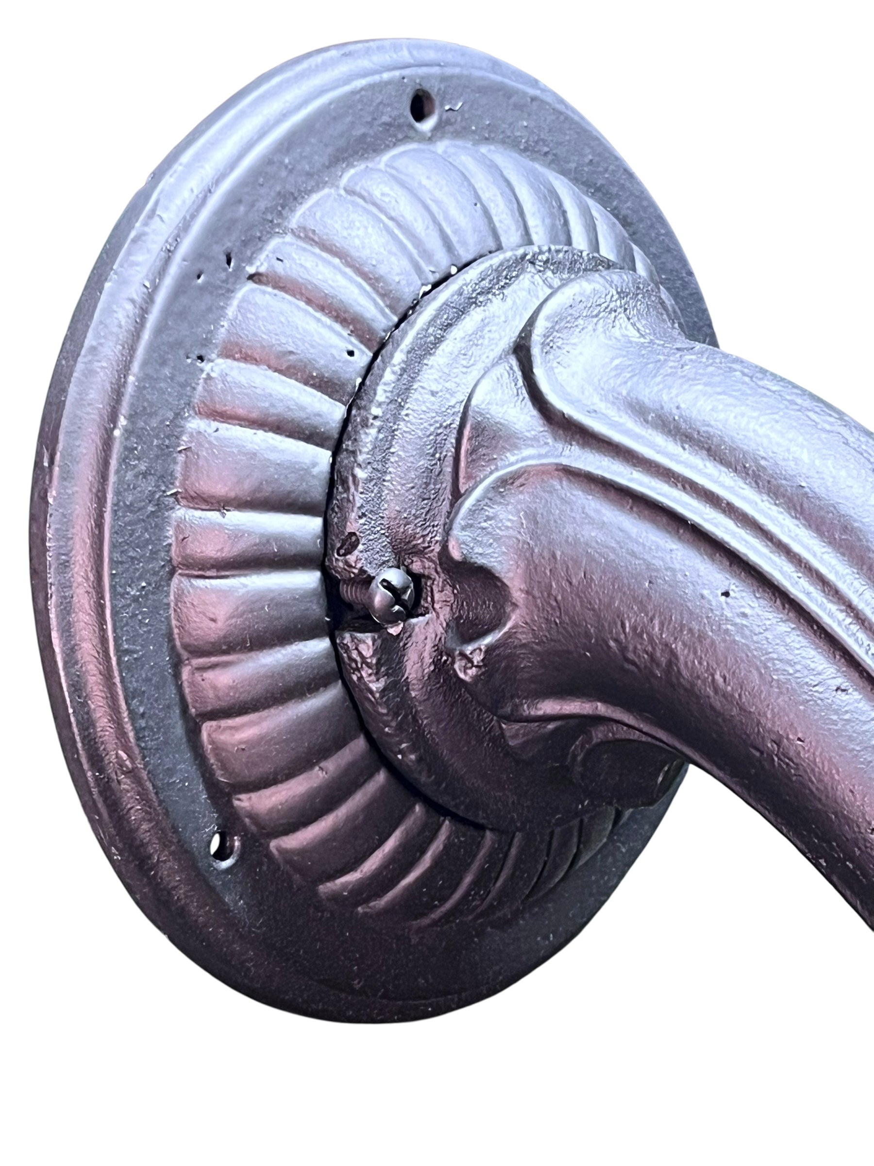 Curved arm sconces in cast iron have new black paint and electrical. Shades are vintage, not the modern equivalent you usually see. These screw to wall instead of attaching to a junction box.