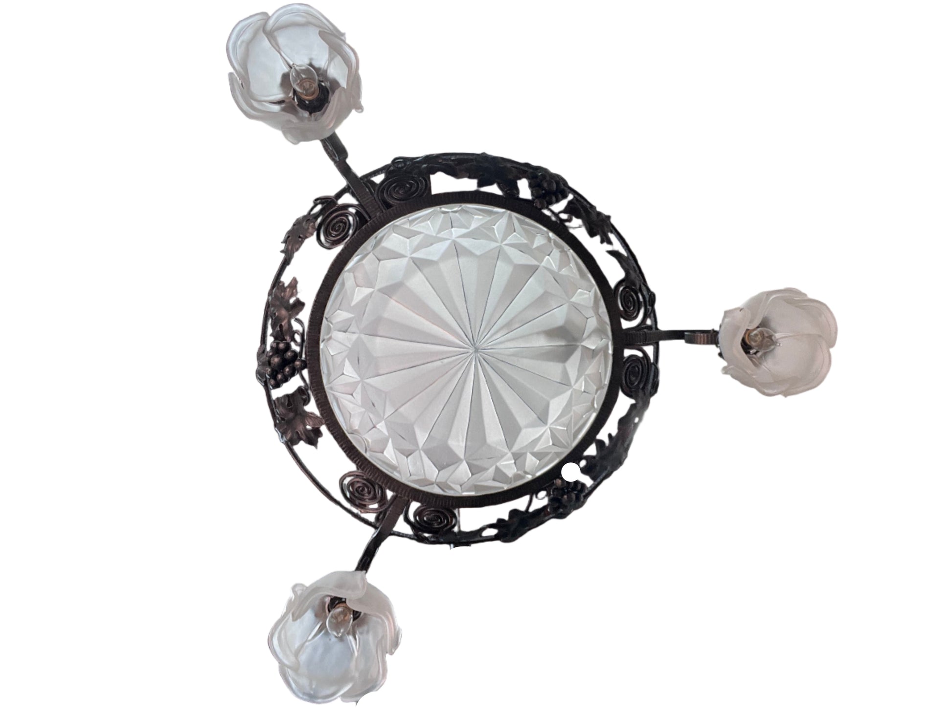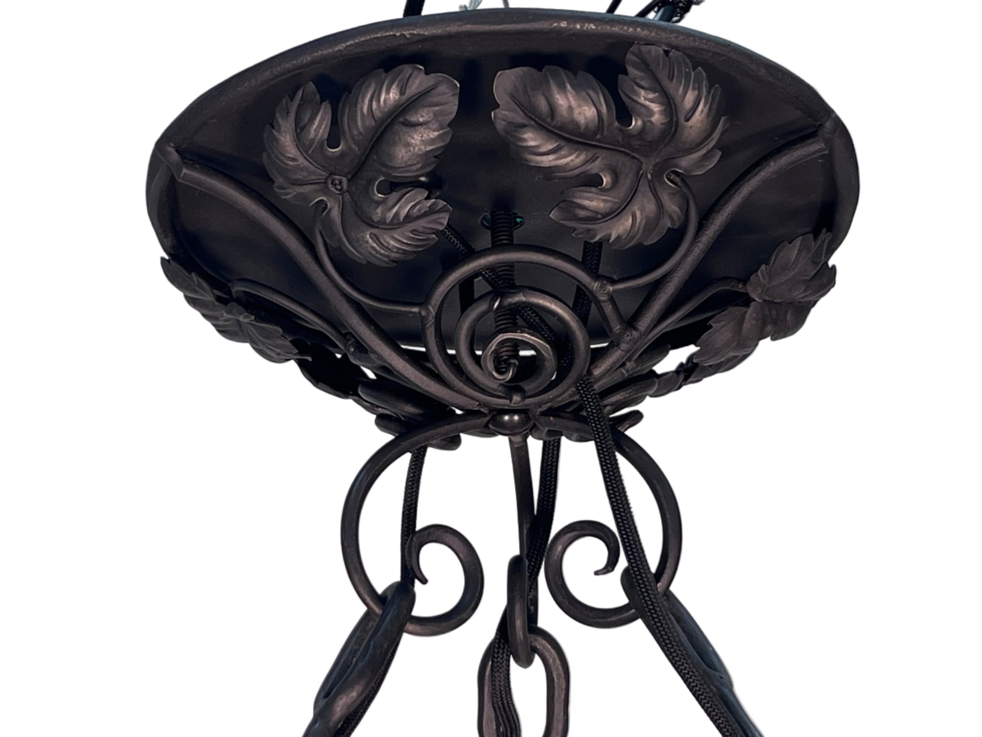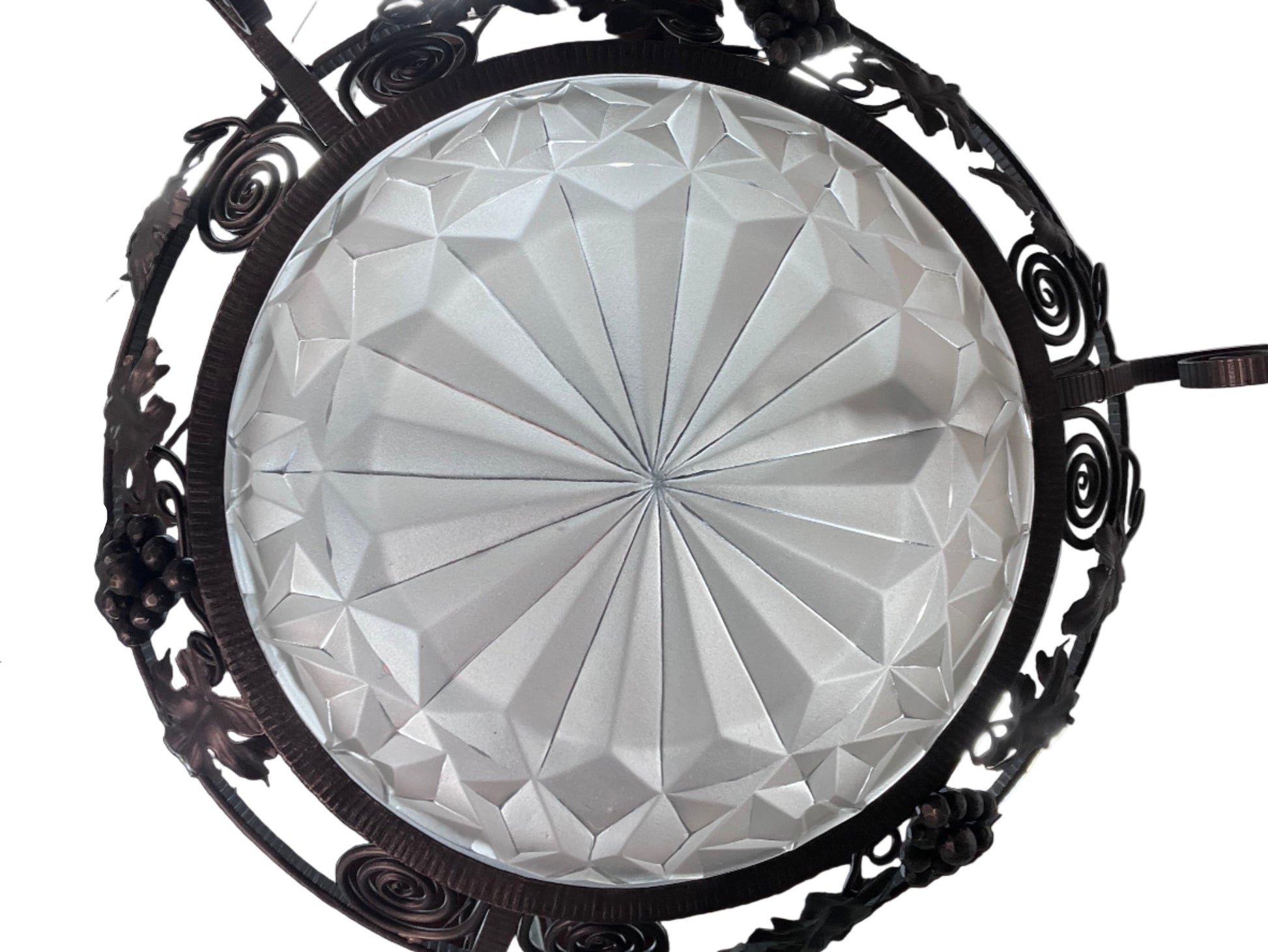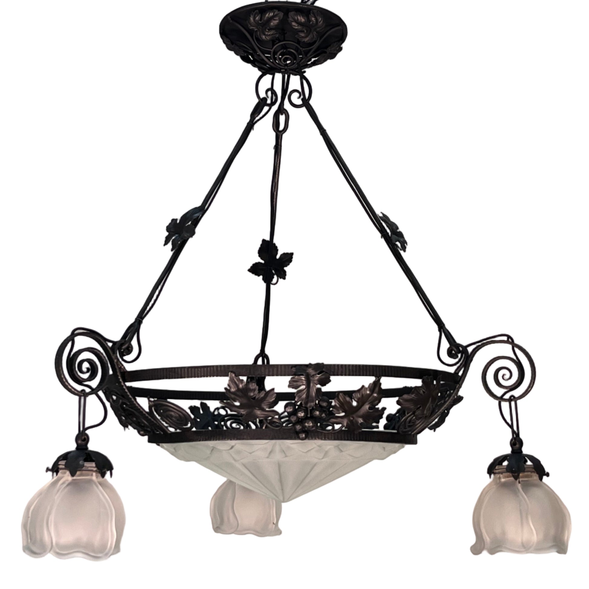 Lovely forged iron chandelier from France has a new blackened patina with hand rubbed highlights. Glass shades are frosted clear glass, with a bowl in the center. Outer shades are made form panels of molded leaves of glass held together with springs---unusual. All new wiring.