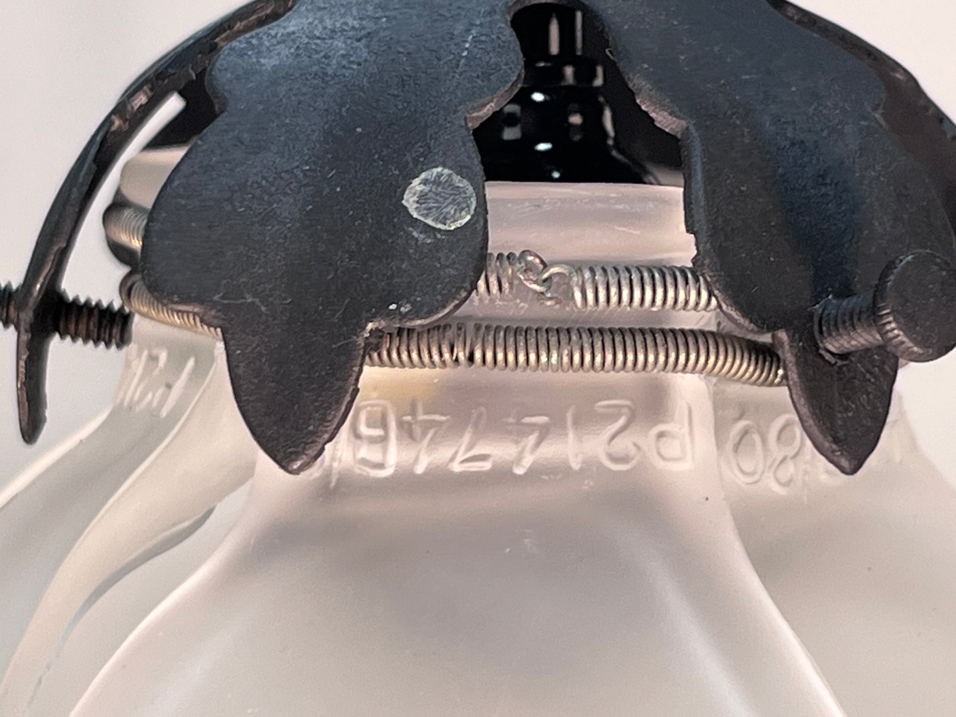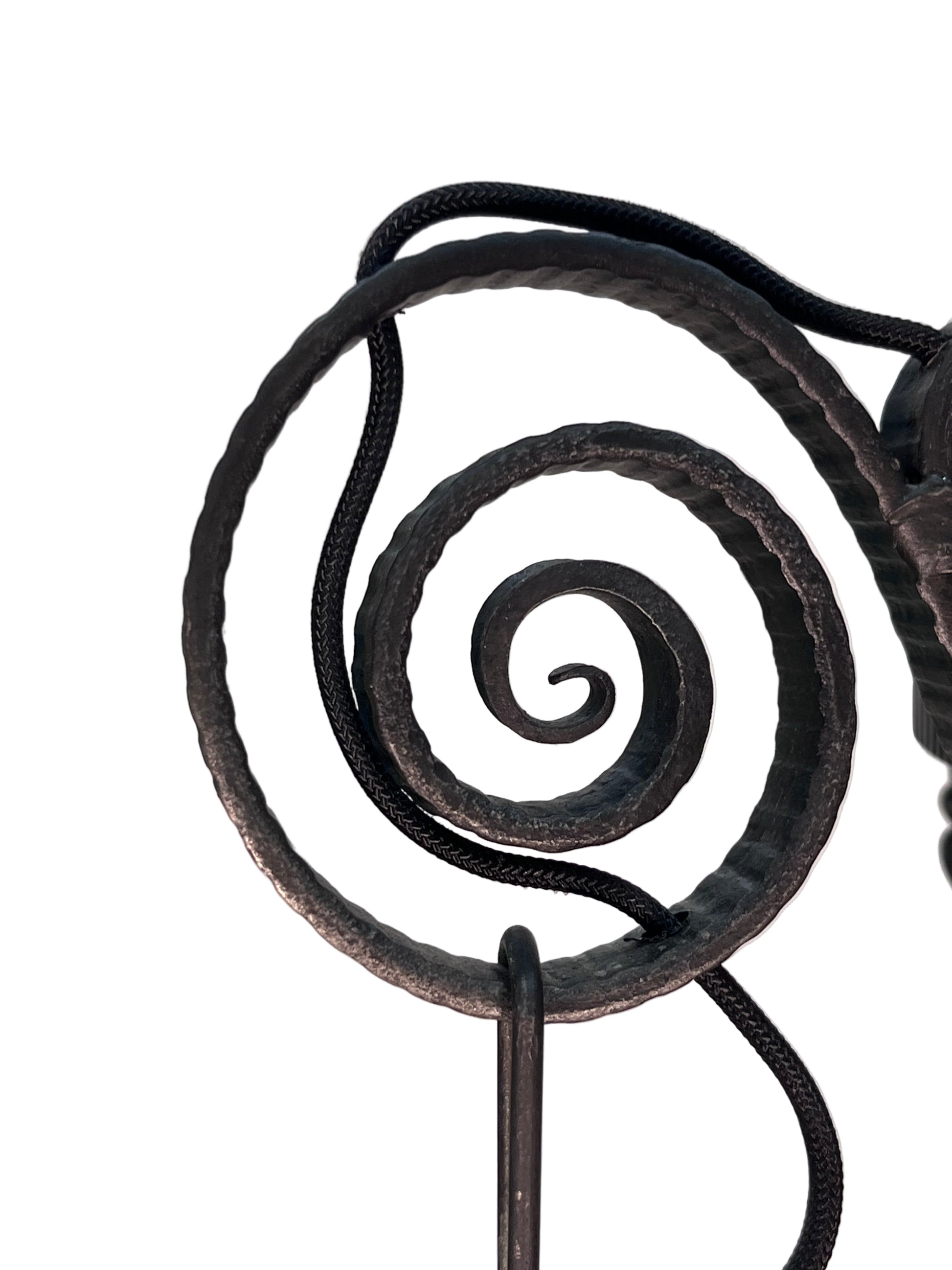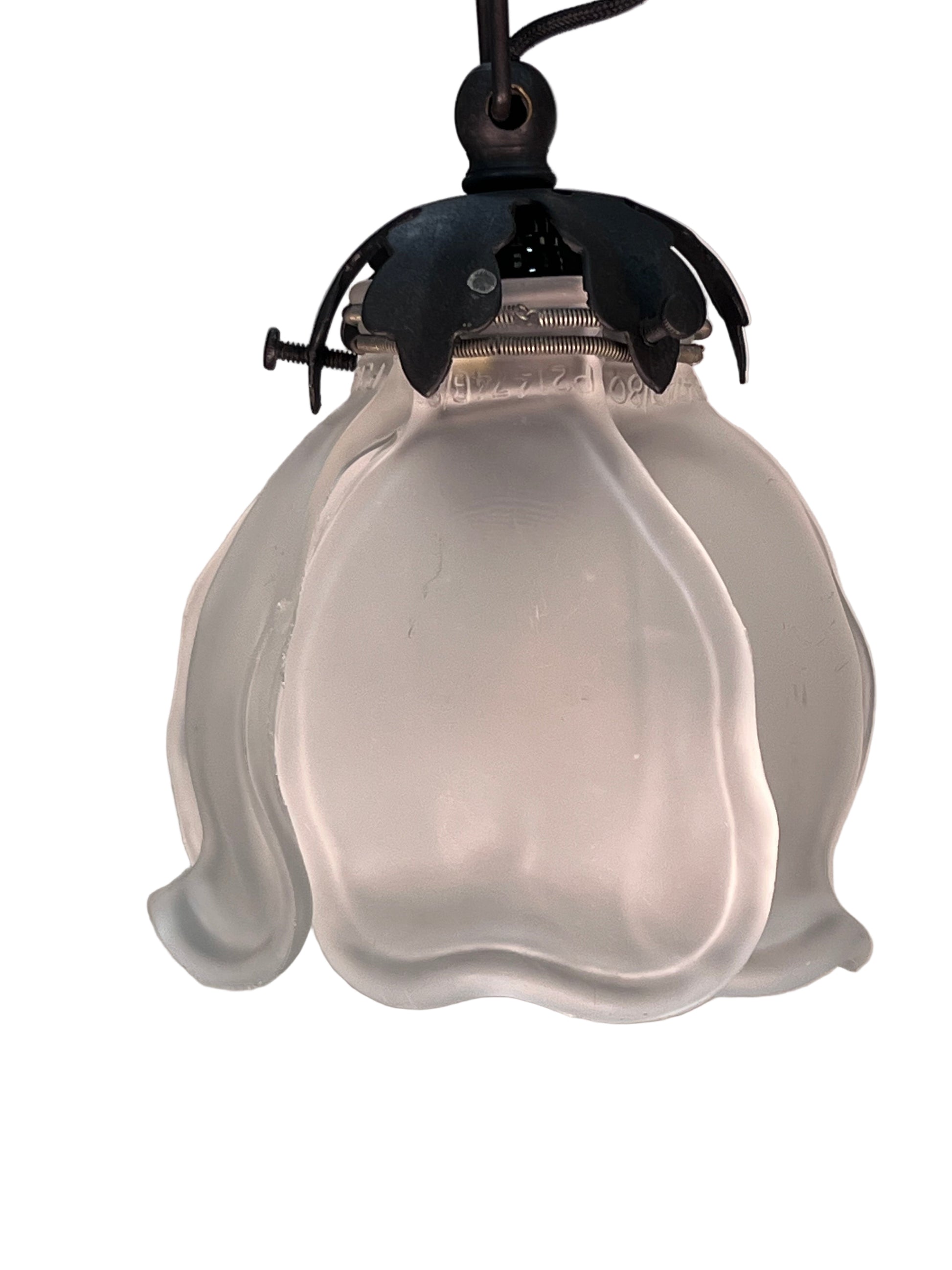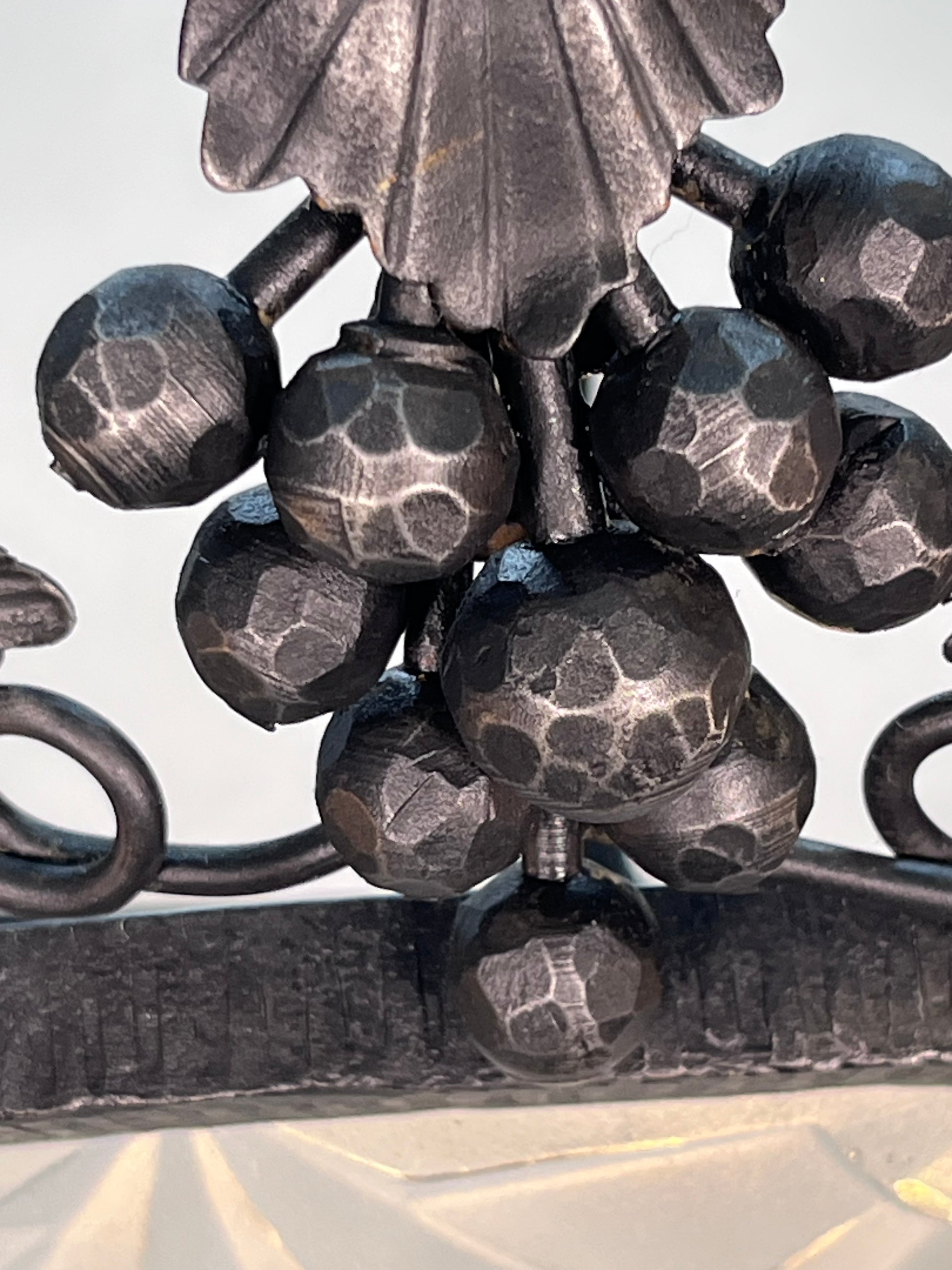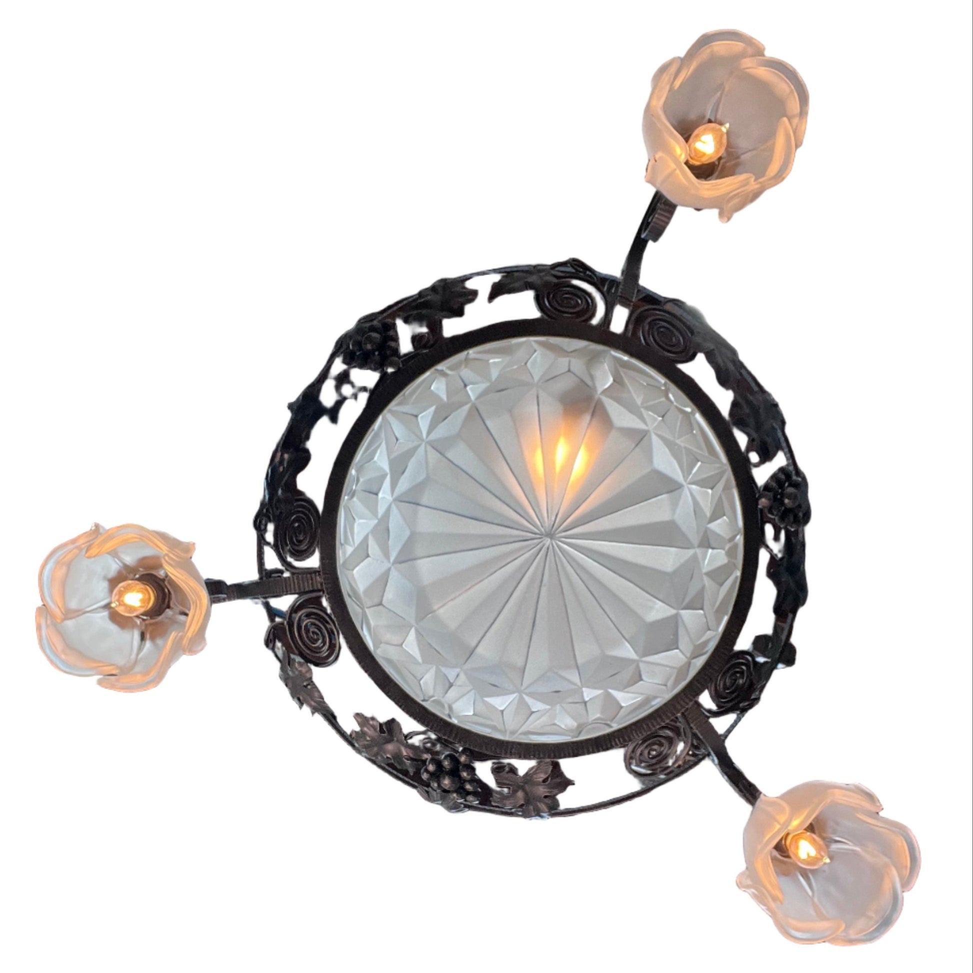 Lovely forged iron chandelier from France has a new blackened patina with hand rubbed highlights. Glass shades are frosted clear glass, with a bowl in the center. Outer shades are made form panels of molded leaves of glass held together with springs---unusual. All new wiring.