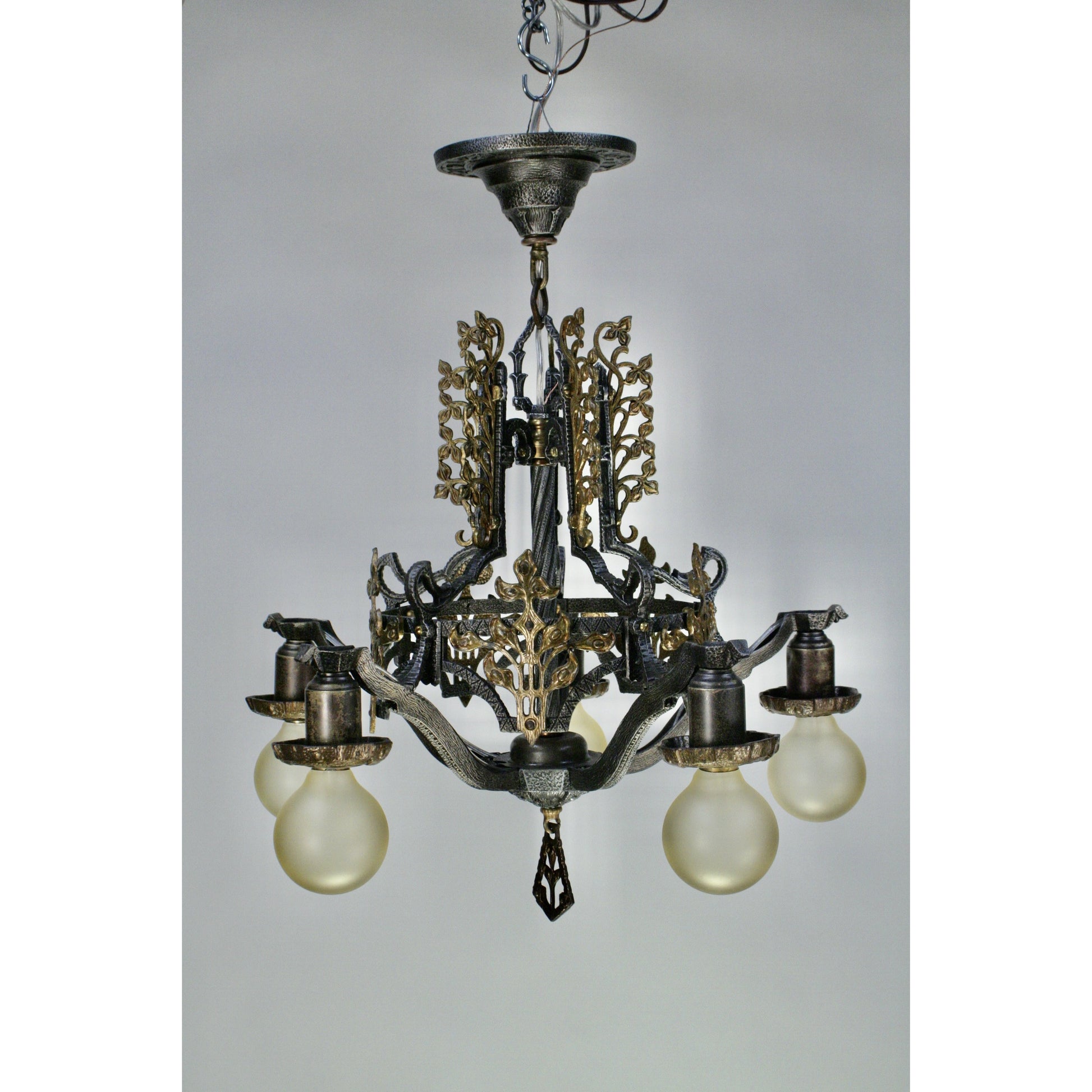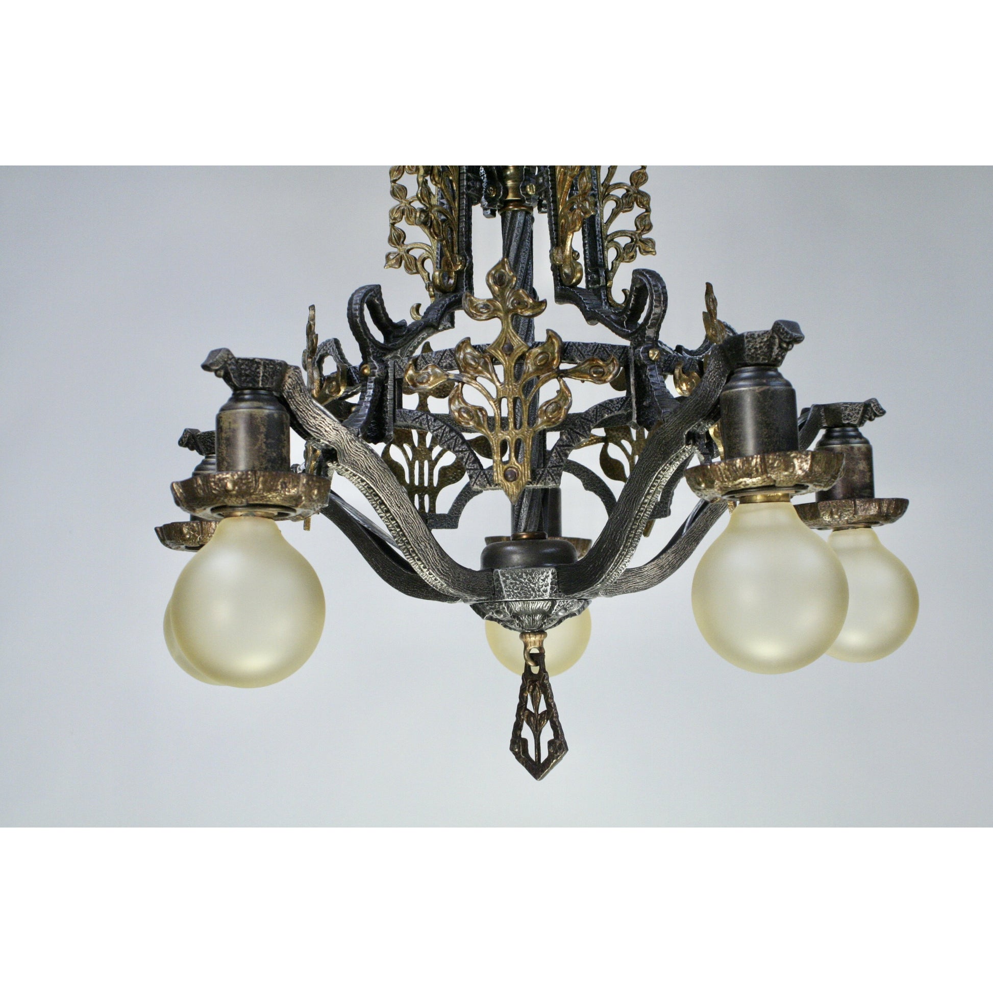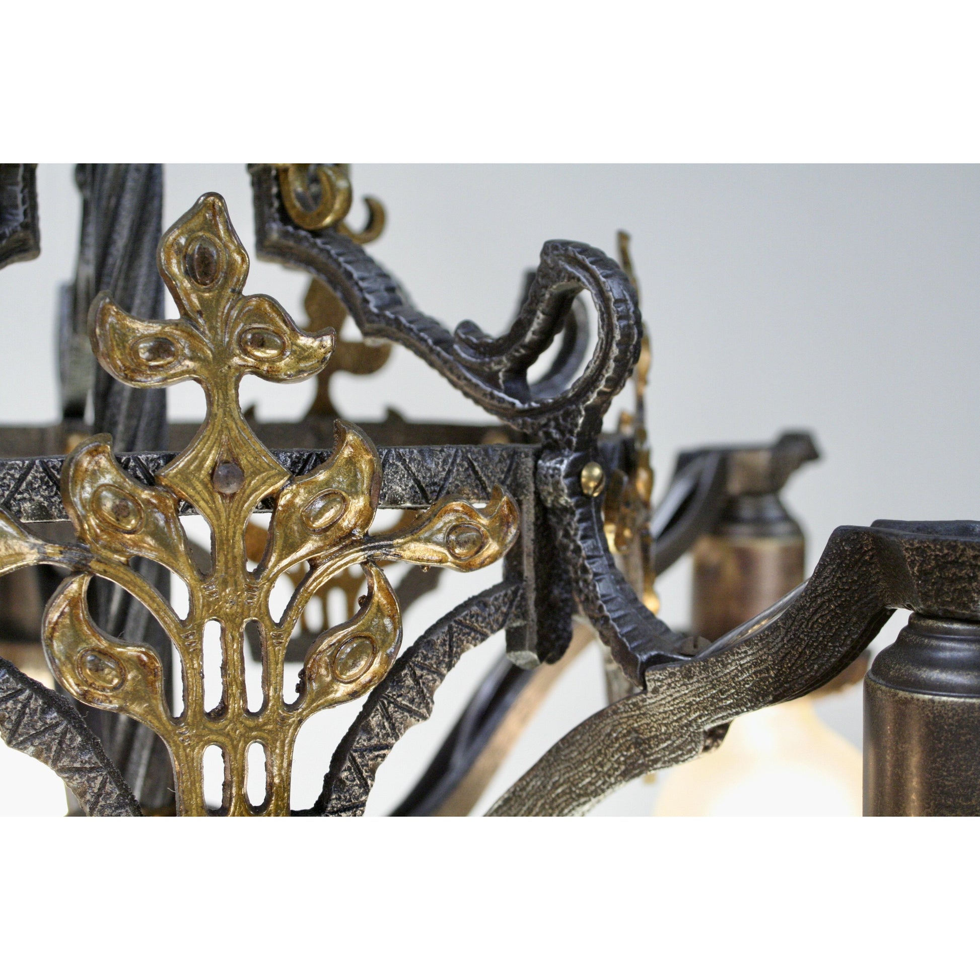 Fabulous 1920s chandelier with hammered texture and solid cast brass embellishments. Wonderful hammered texture on cast iron with revived original finish. Downward facing bare bulbs great for a soft glow over a dining table. Here shown with our hand painted "Mazda" bulb reproductions, in 2.5" and 25w, but also available in 3" diameter 25w or 40w. Add on at checkout if desired.