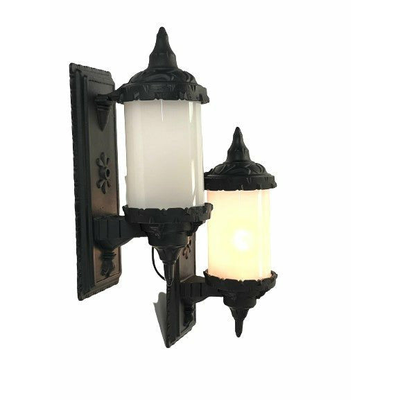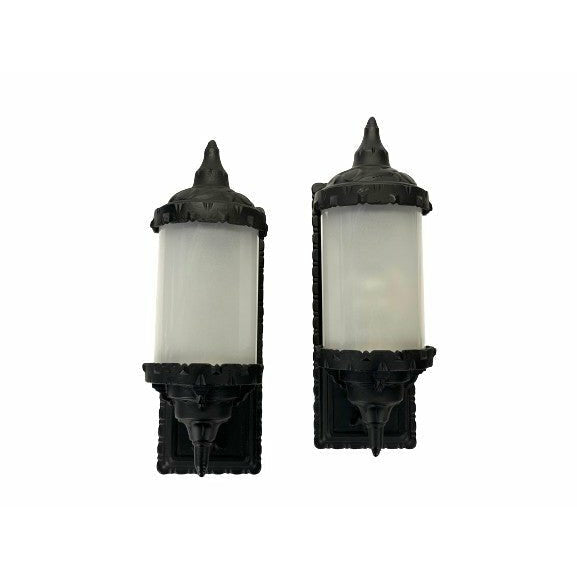 Pair outdoor wall sconces with new black paint. 1920s? Cylinder glass shades are new and installed a rubber gasket to protect glass. Top hinges up to replace bulb.