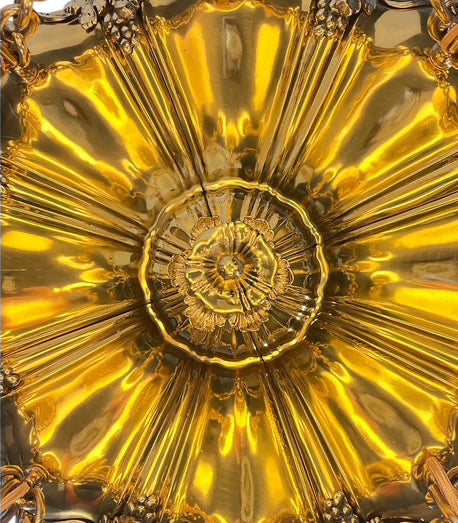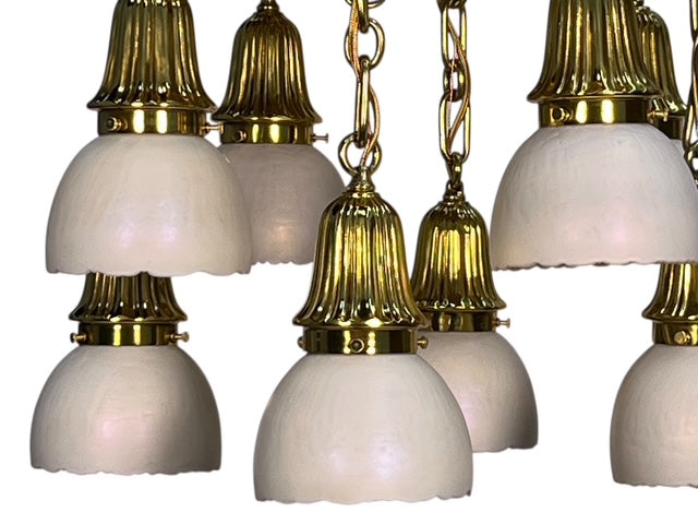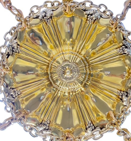 Truly stunning brass pan with sheffield pattern, circa 1910. Around the perimeter are solid cast brass grapevines with bunches of grapes, and decorative swag chains. All done in solid brass. Below, 8 matching Sheffield shade holders hold the 8 Steuben calcite art glass shades. Inside the antique fatboy porcelain sockets have been refurbished and rewired, and ground wire added.