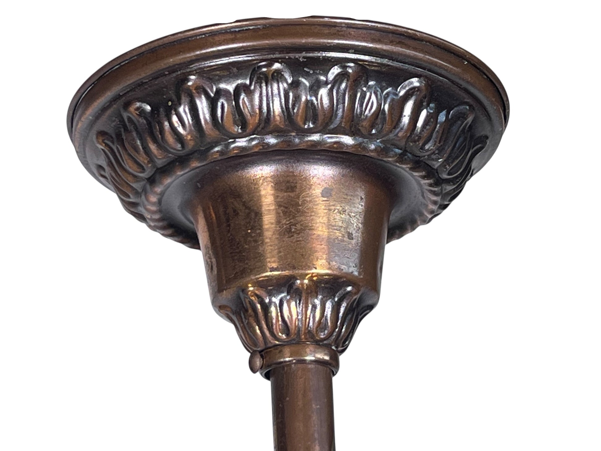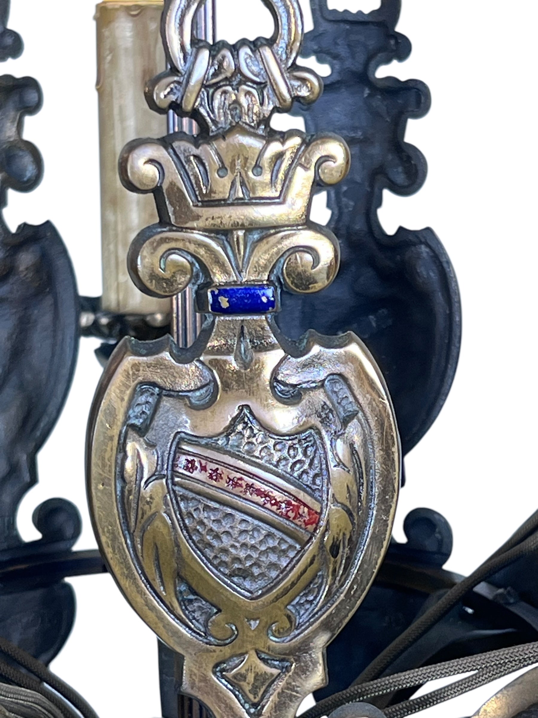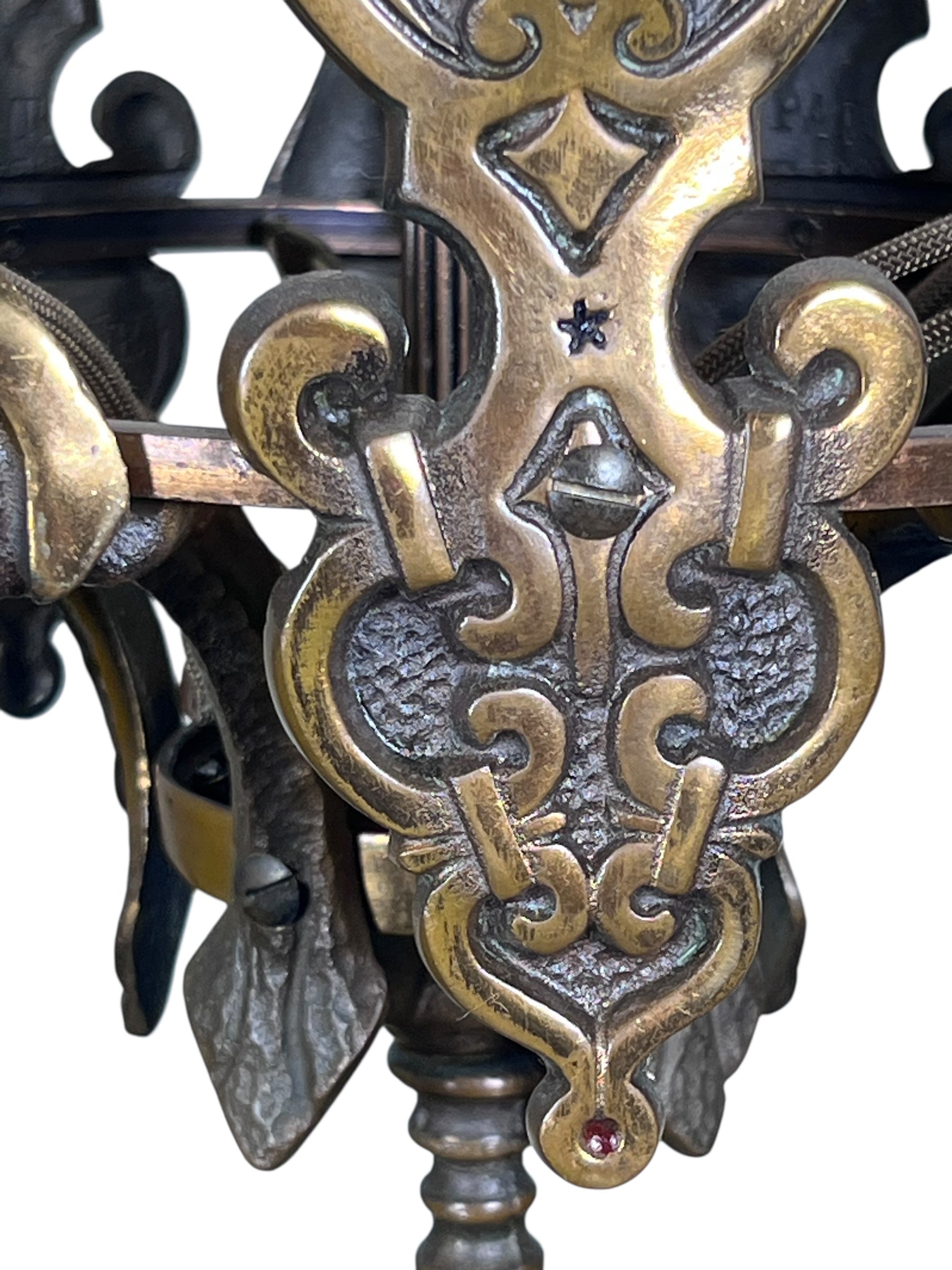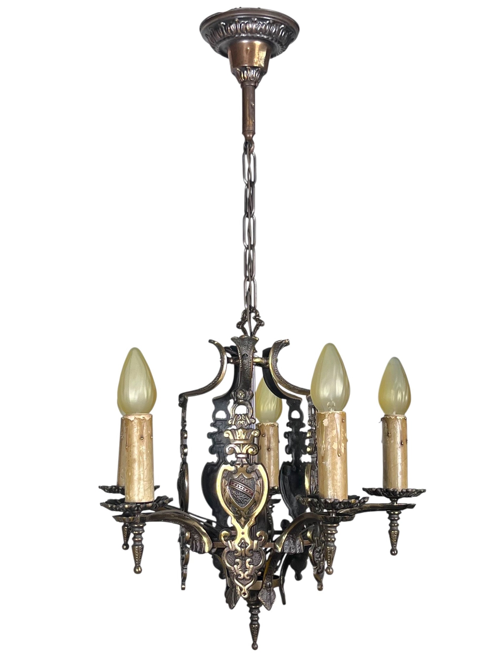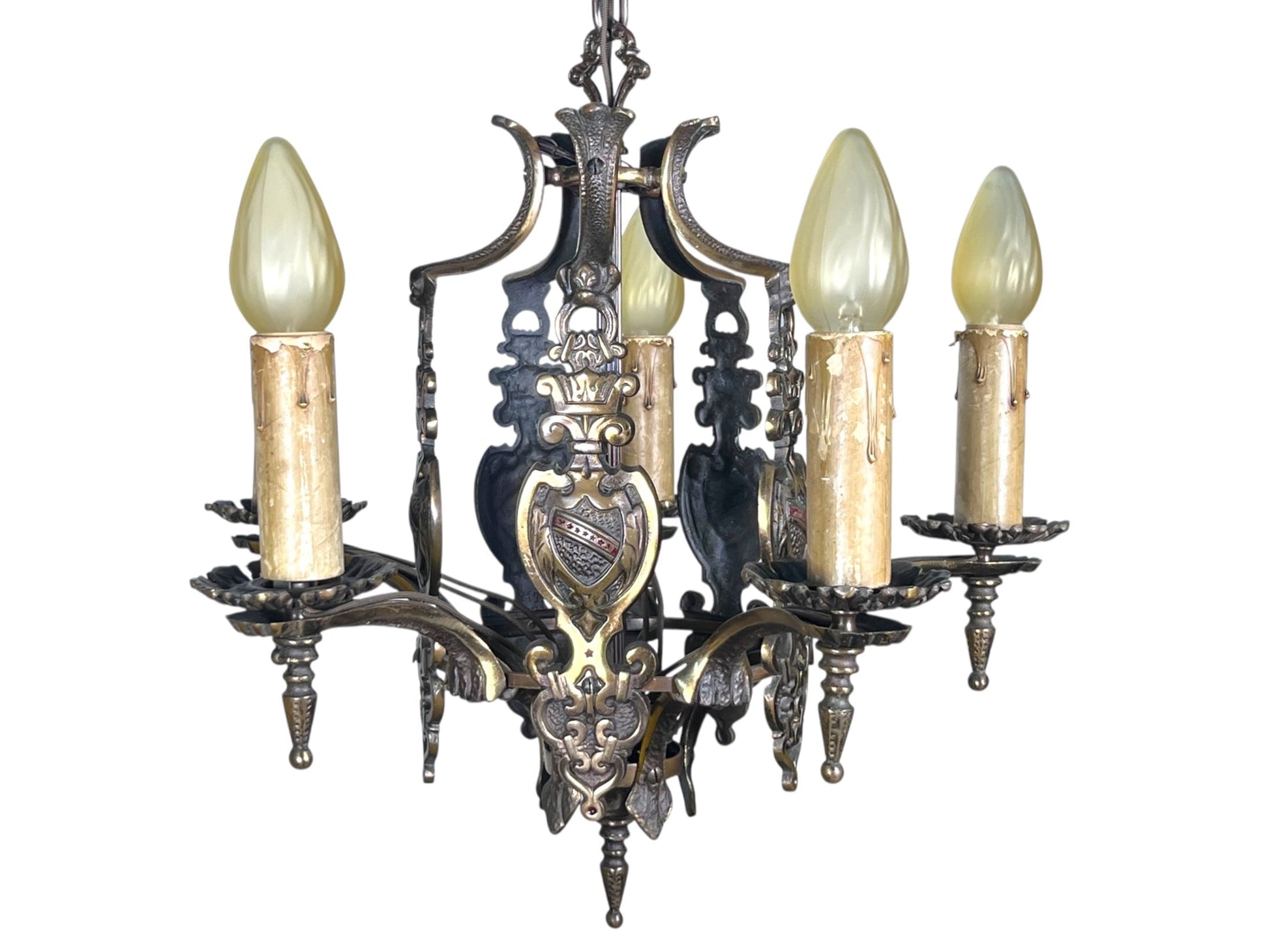 Lovely solid bronze 5 light with original finish. 1920s or 1930s with red and blue painted accents, also original candle sleeves, worn, but look great. Instant old! Can be replaced if desired.