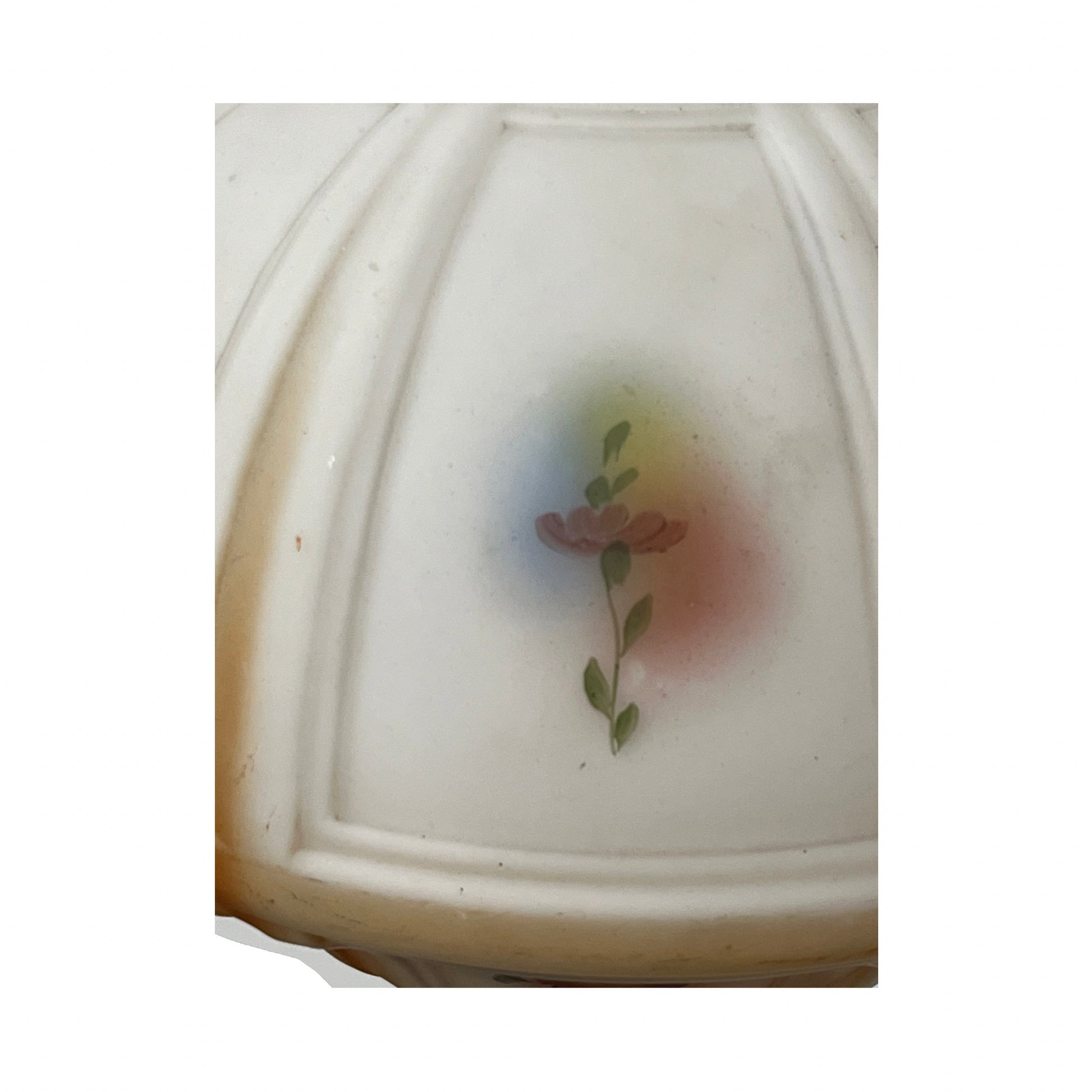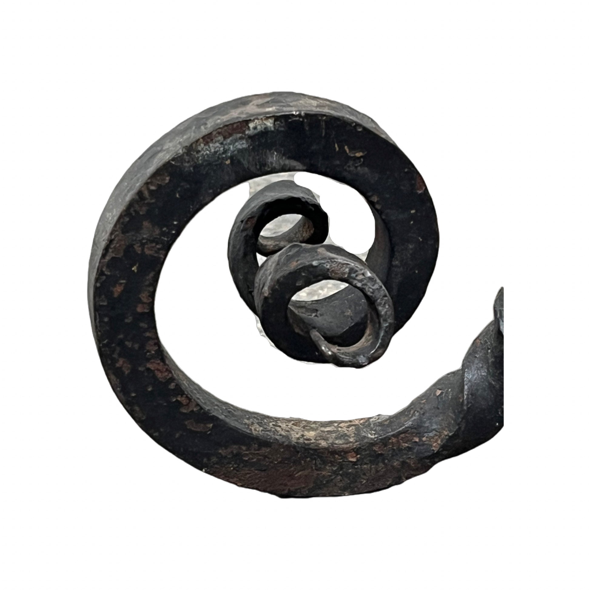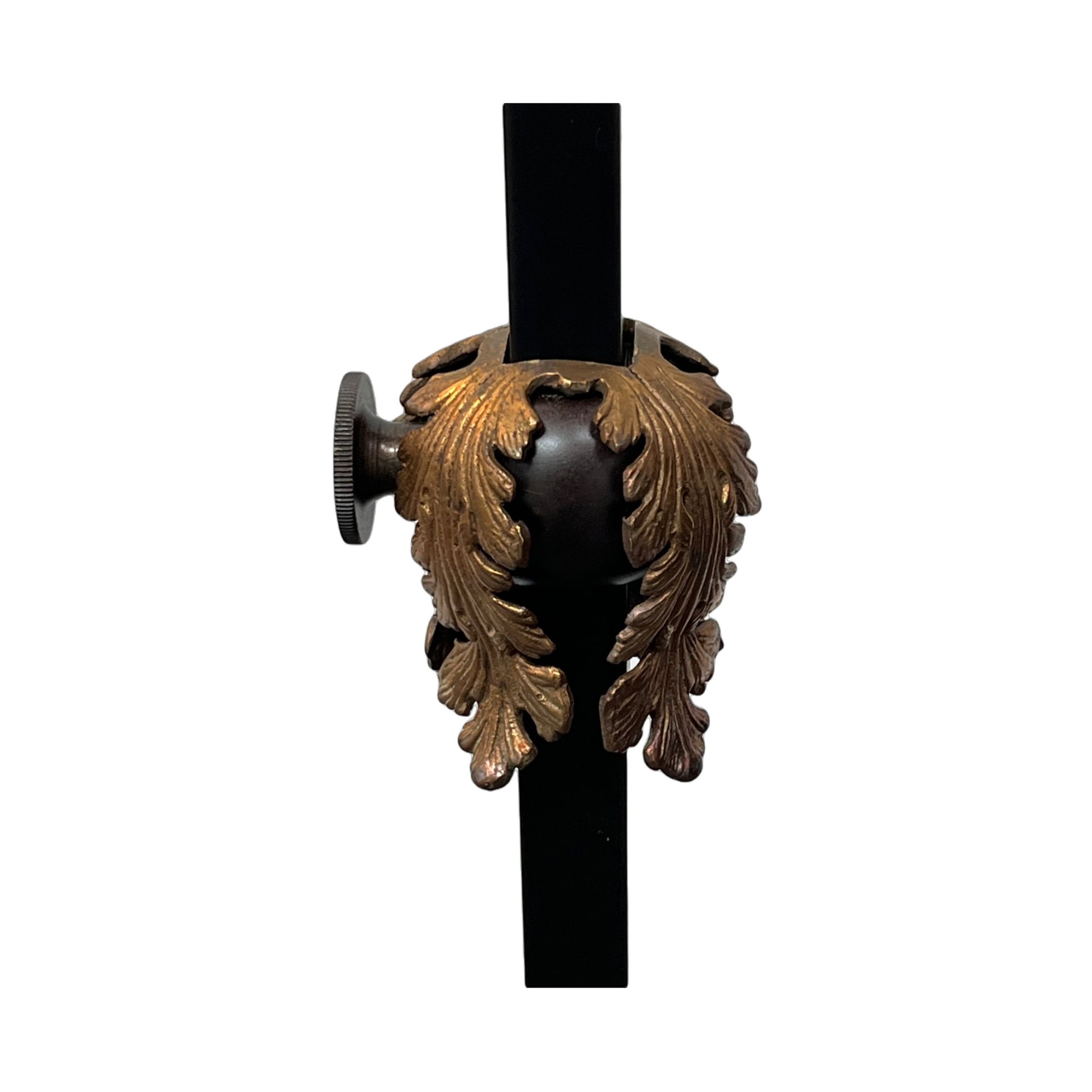 Love this amazing and highly decorative floor lamp! Not fortune that the best part is the base and feet--in this case they are hand wrought out of iron and were once decorated with pin striping. The upper curved arms are all brass with a wrought iron top finial. Shade pictured shade is glass and has its original turnkey paddle socket.