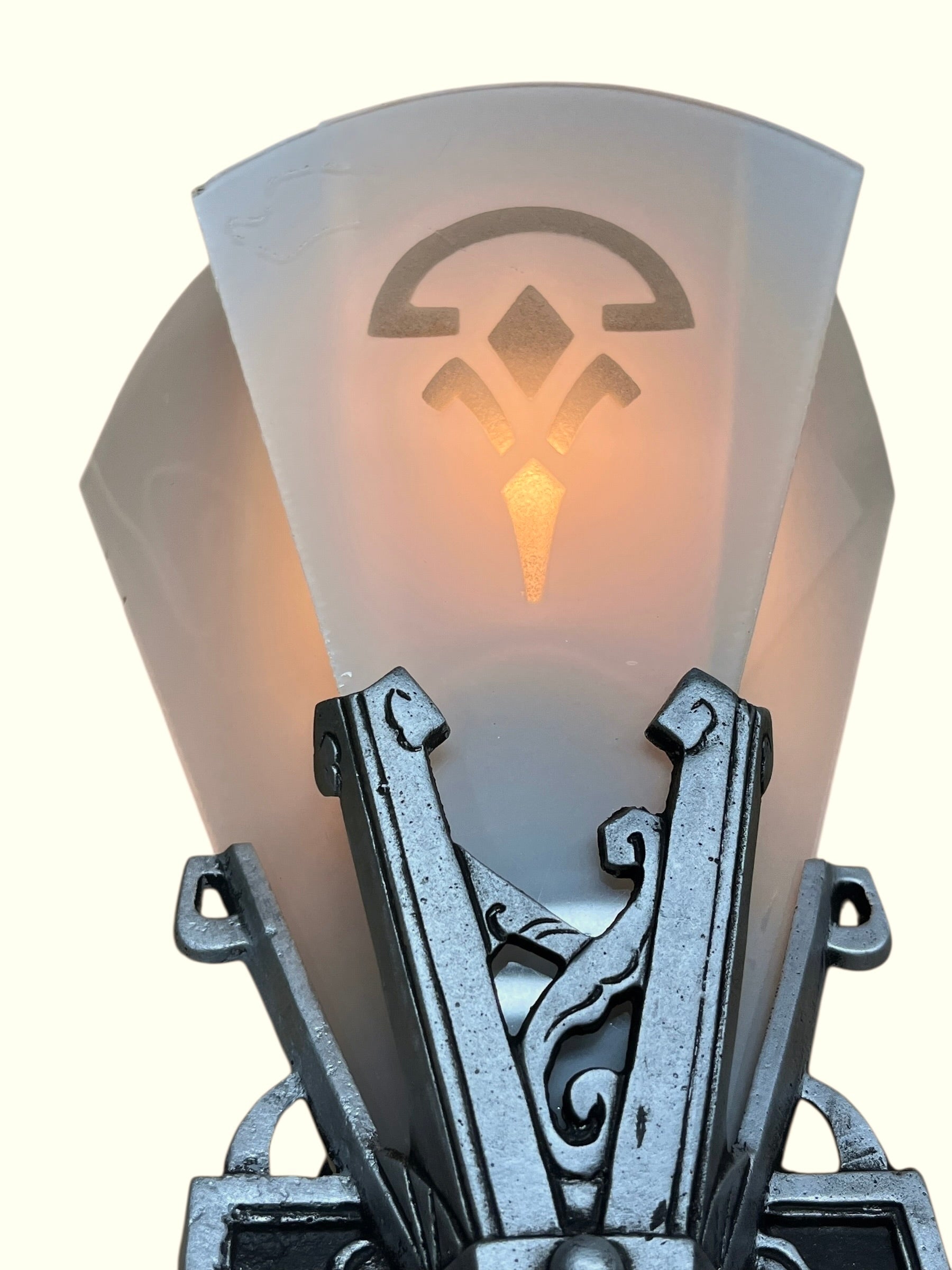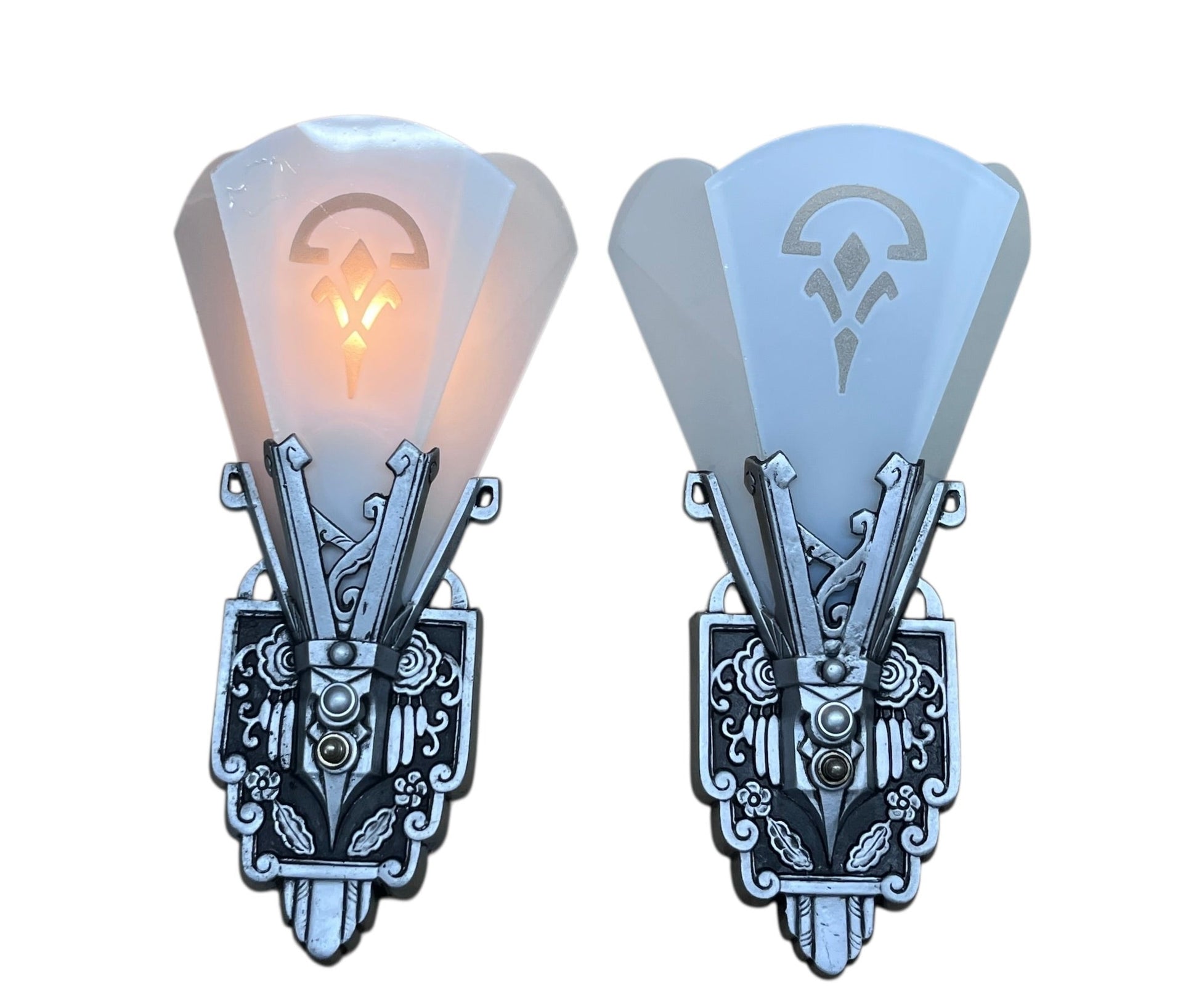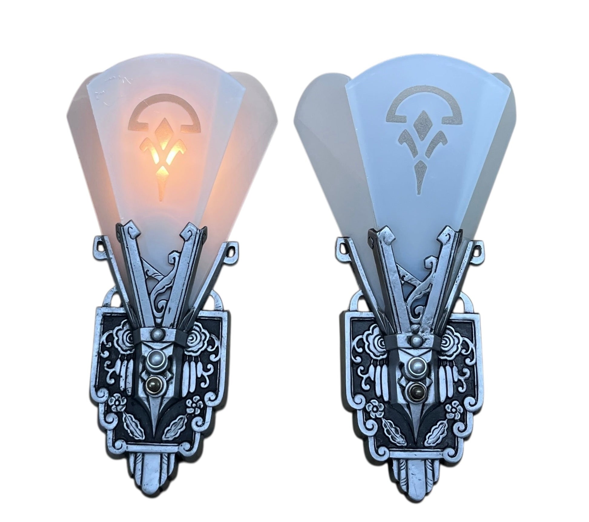 Lovely pair of sconces by Lincoln Manufacturing of Detroit. Two pair are available. Flat panels are white flash glass, which is a thin layer of white and clear laminated together. The design is etched through the white layer. Takes a single standard bulb inside. Original on-board switch. One pair with original glass, one has reproduction. Matches several ceiling five light chandeliers we have. Priced per pair.