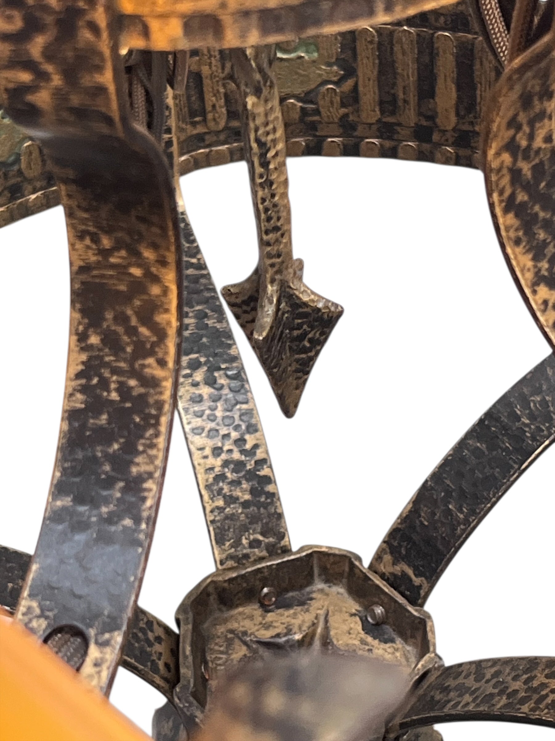Frankelite was a small manufacturer of lighting fixtures and this is a fine example of their own designs, but today are also well remembered for making their own versions of other companies' successful designs. This comes with its original gold and black finish with green accents and amber glass shades. An excellent choice for an arts and crafts or Spanish Revival interior. Look for the matching wall sconces in our Sconces collection.