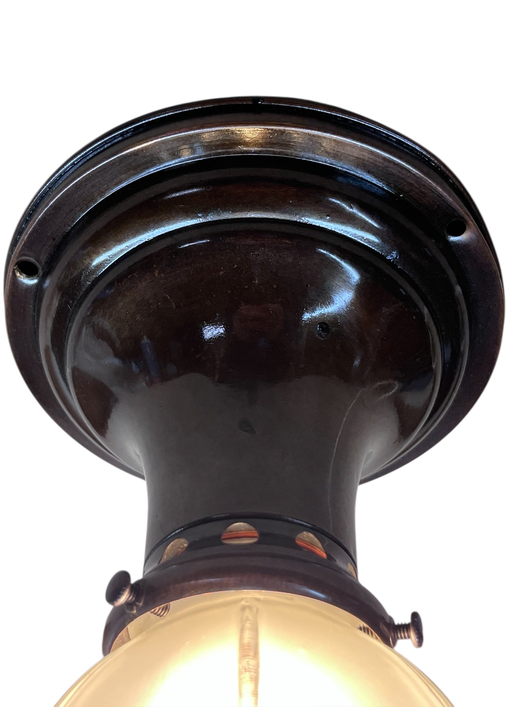 Small light for smaller areas like closets and hallways. New porcelain socket in original fixture. Finish uneven but looks great. Screws to ceiling with three screws instead of using a modern crossbar.