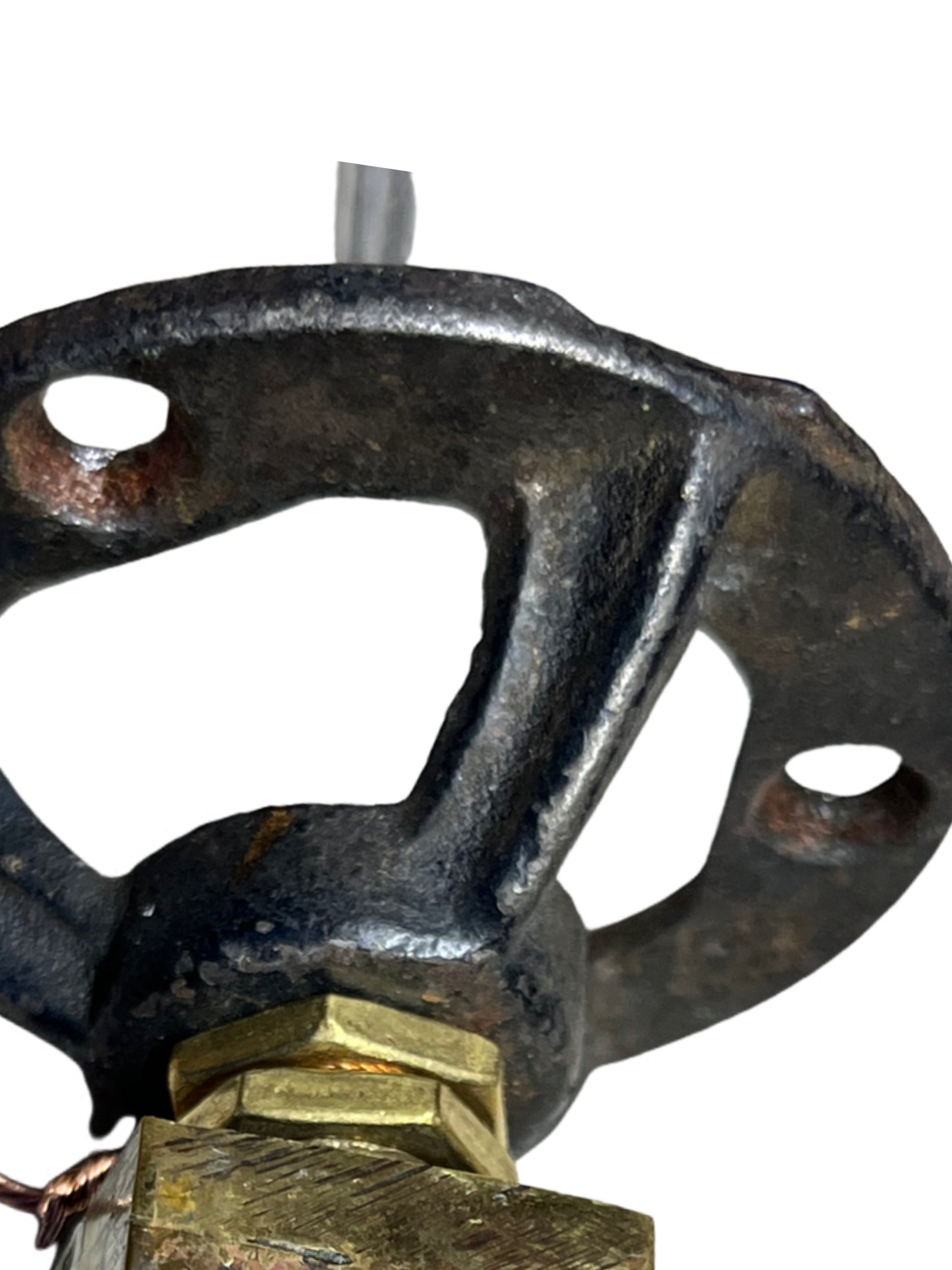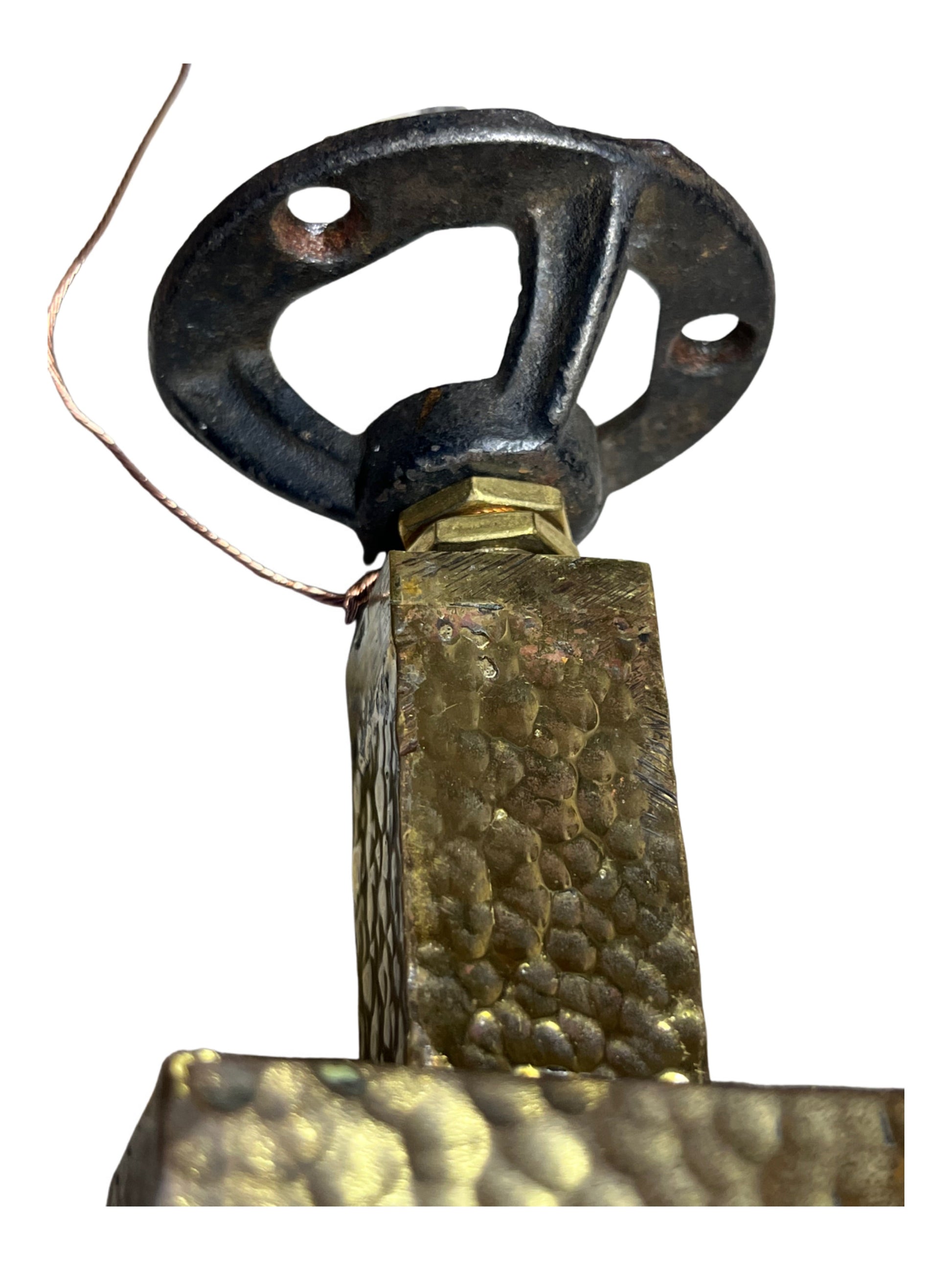 Love the oddity of this unusual sconce with hammered texture overall. Notice the lanterns round openings and rivets. The hammered canopy is 3" square (so won't cover a modern junction box). This comes with a old style mounting option where the canopy simply screws to wall with provided bracket. Glass might not be original to piece. Can easily be replaced with mica.