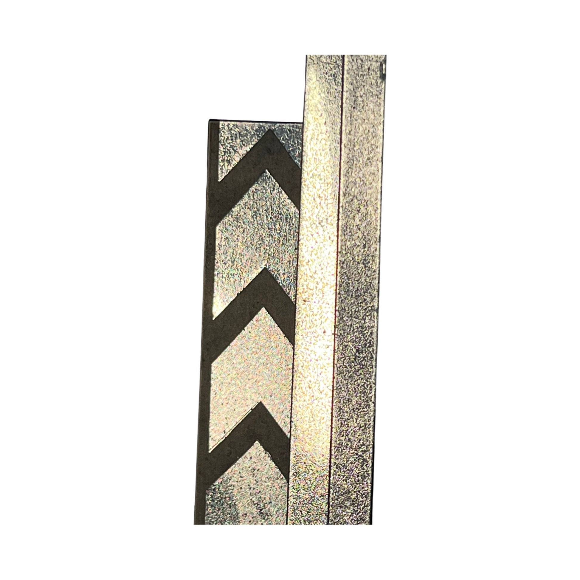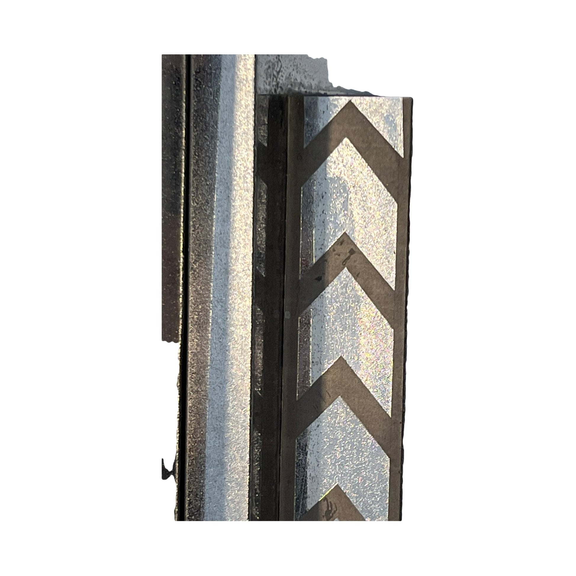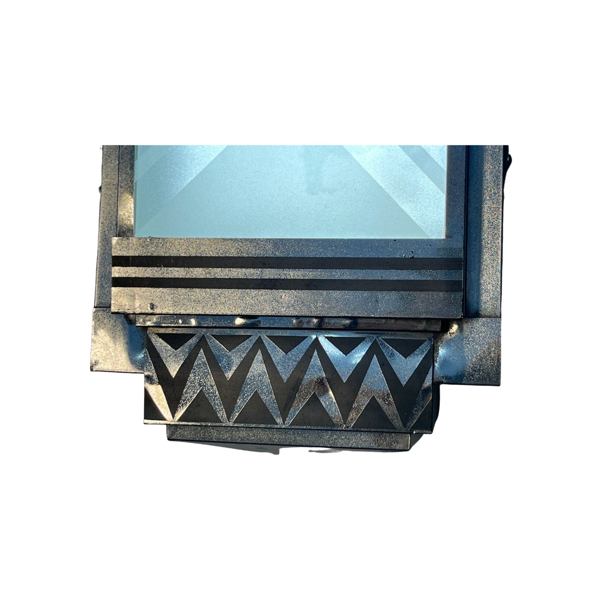 AMAZING and huge wall sconces from a vintage movie theatre.  These have their original stepped chevron design glass panels, but in side have been converted to sheet LEDs for high efficiency and the most even backlight. These have seen a lot of use and the original chrome is definitely pitted but replacing is not a good option here.  Imagine these flaking your home theatre screen!