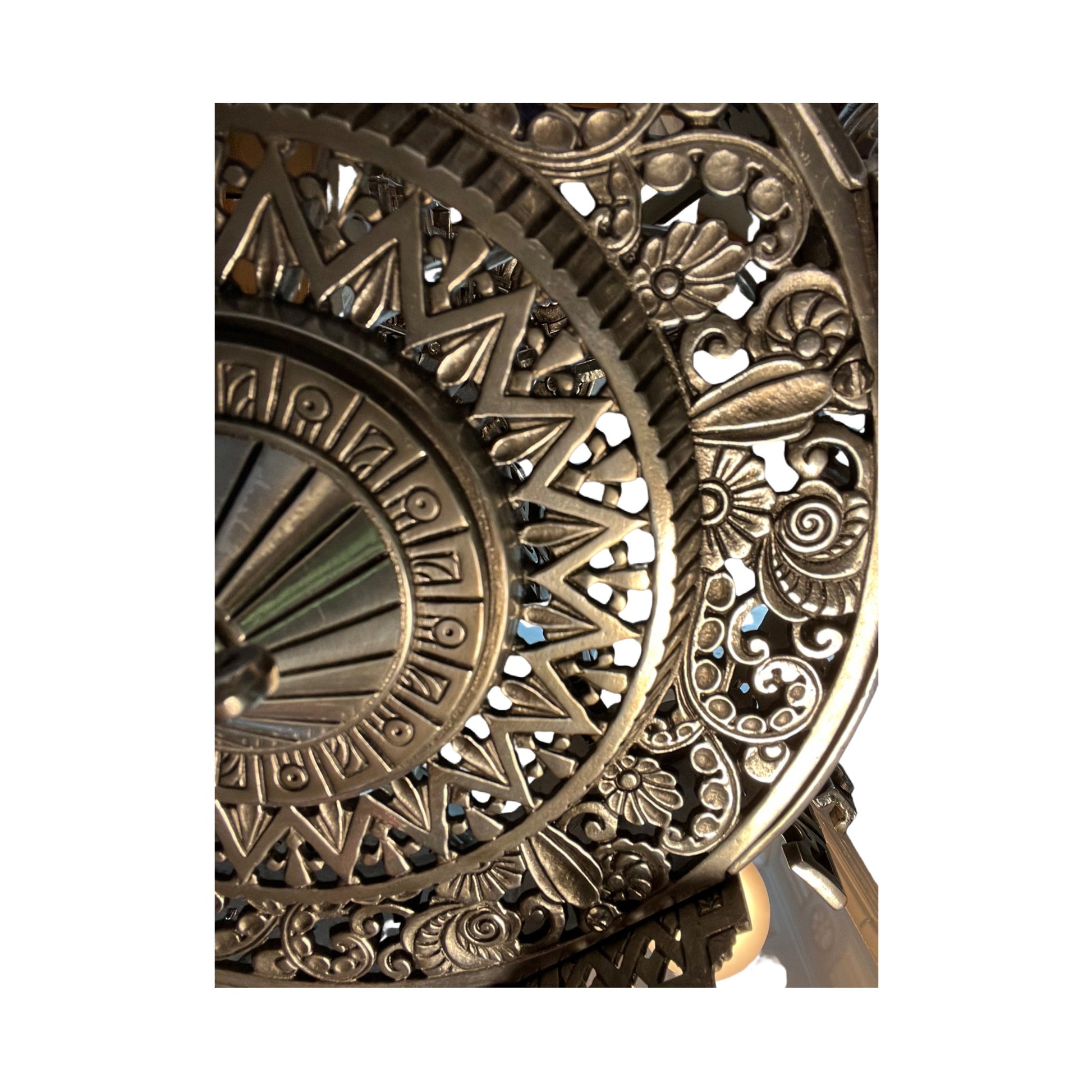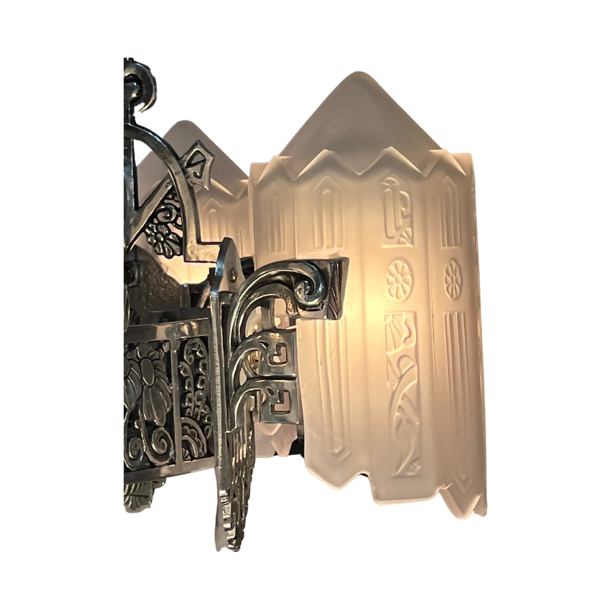 One of the most highly prized chandeliers of the 1930s! Made by Lincoln Manufacturing of Detroit, and the design was patented in 1931. This fixture has both the largest slip shades ever made and also the most detailed castings and biggest diameter of any slip shade chandelier. Here restored in polished aluminum, all new wiring, and original porcelain sockets. Glass shades are clear glass that has a frosted finish. Note one shade has a small repair and crack---see photos.