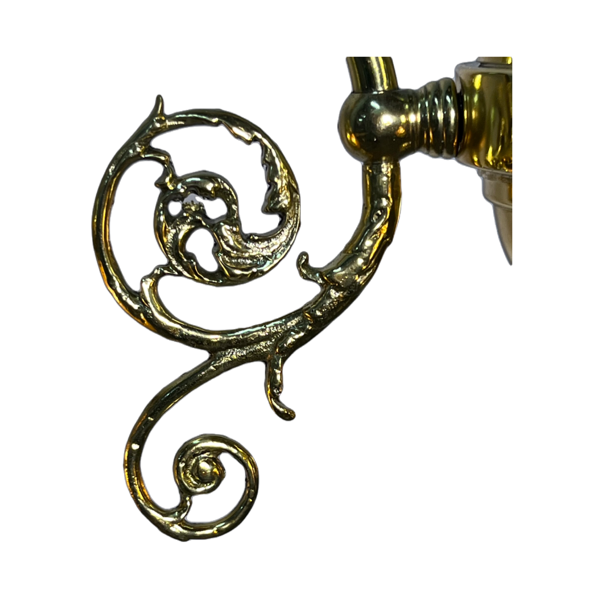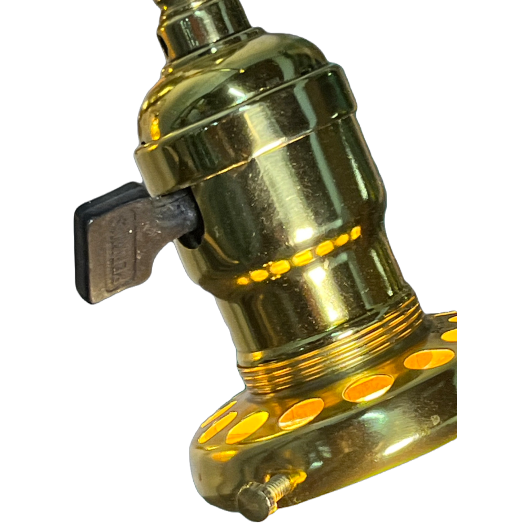 Lovely newly polished and lacquered brass three arm chandelier with amber glass shades with acid etched floral design. Original Paddle fatboy sockets.