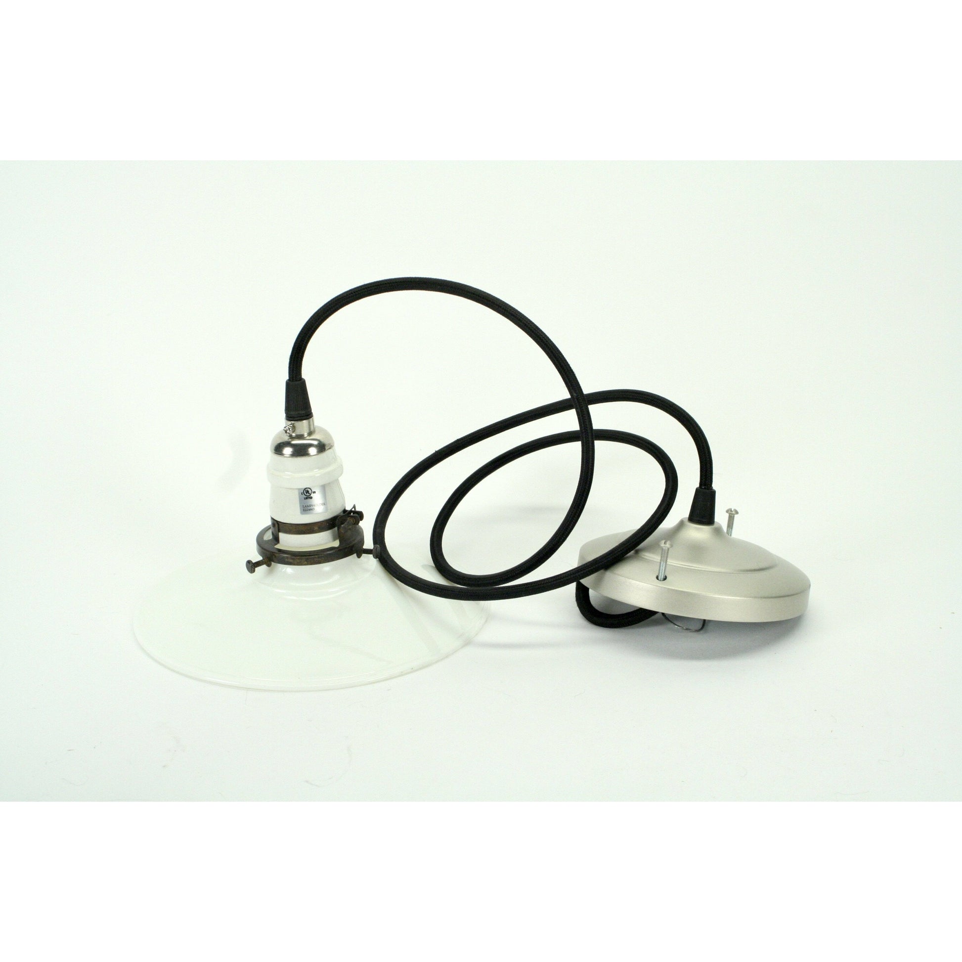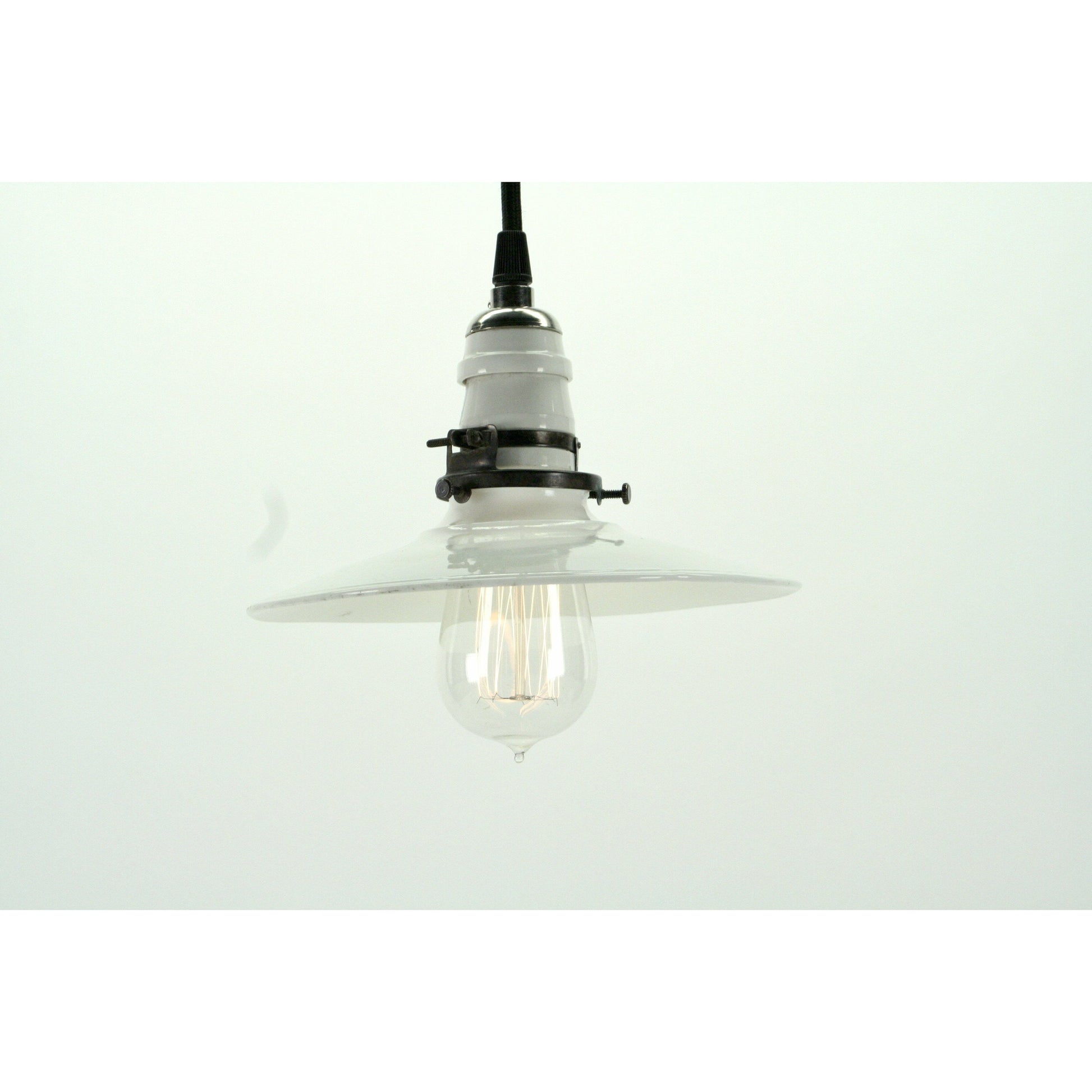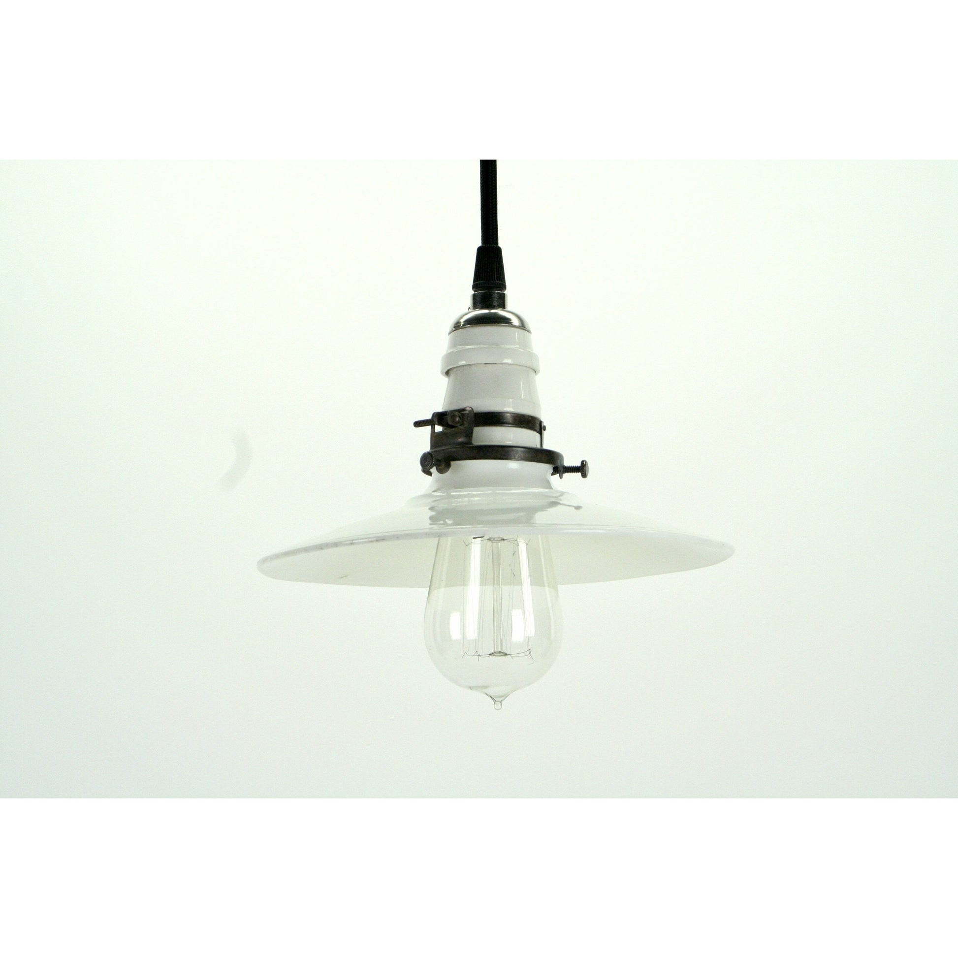 Small flat hand blown white shade suspended from black rayon covered wire, with an old style, but new porcelain socket and ceiling canopy. Shade is hand made and not perfectly round or flat.