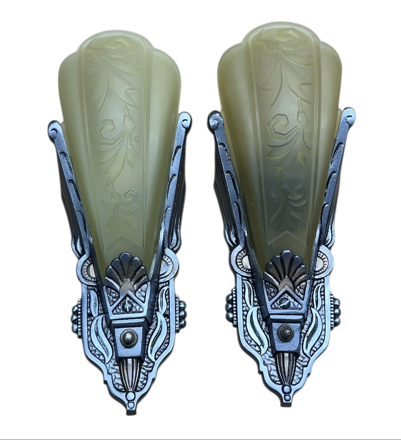 One Pair (of Two) Dark Silver and Gold Amber Slip Shade Wall Sconces #2583