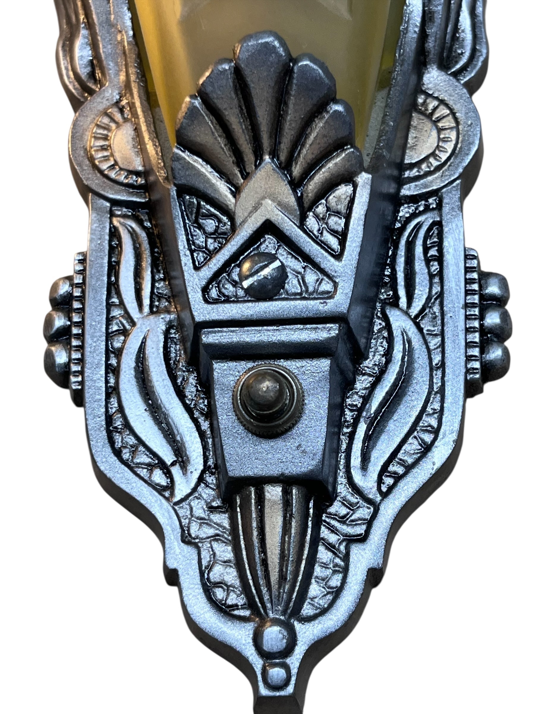 New silver and black paint on these wall sconces. Here is one pair, and we have two pair available. Amber glass shades slip over the socket with an open top to let light wash up the wall. On board switches have been refurbished. Priced per pair.