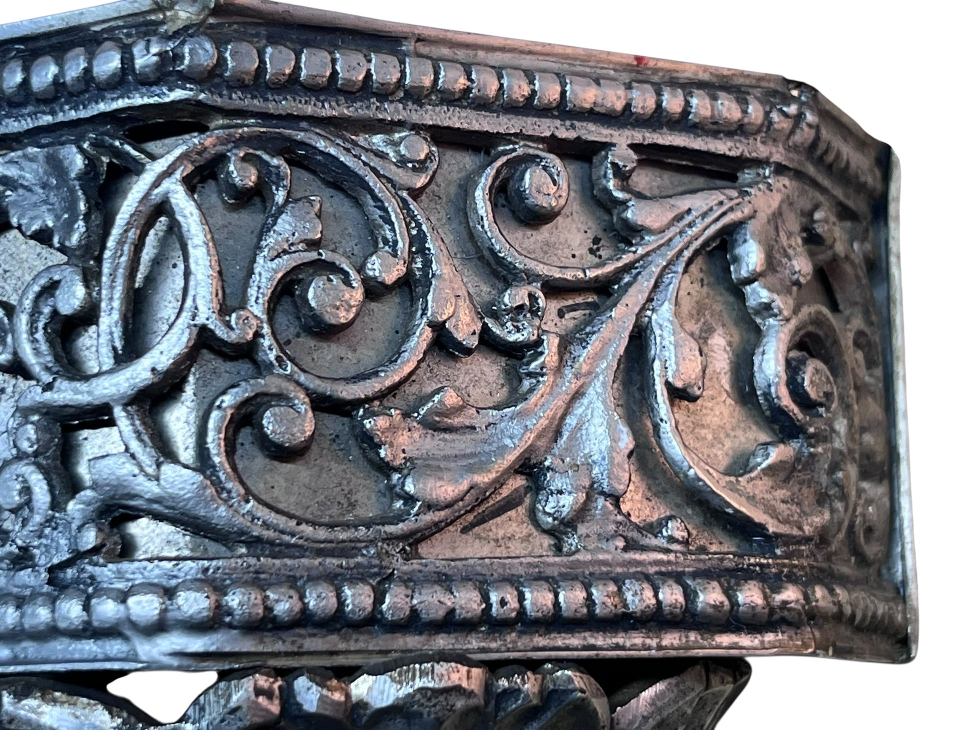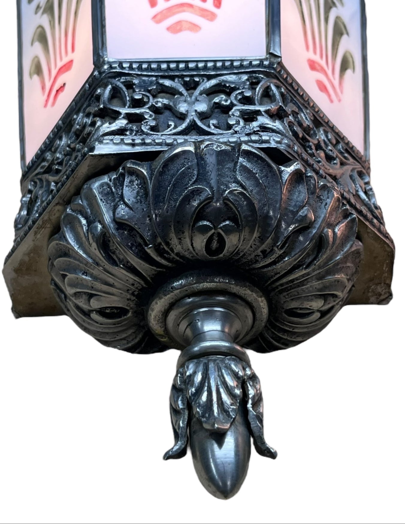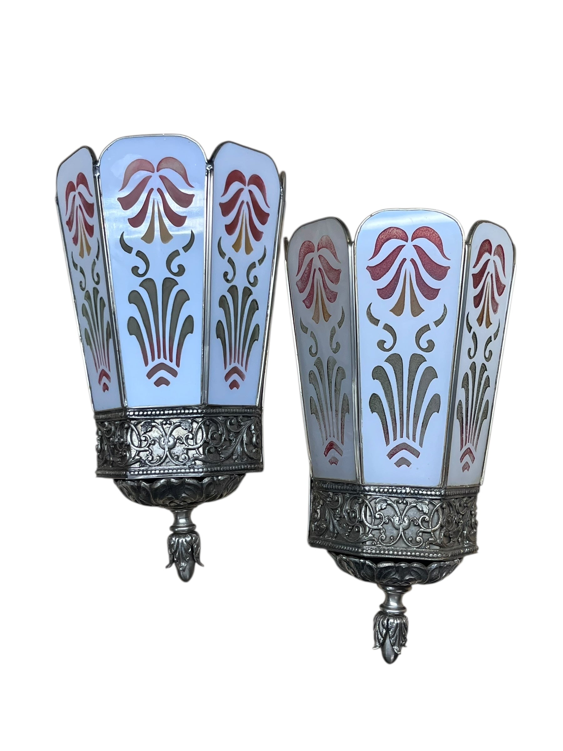 Unusually large and impressive sconces likely from the 1920s. These were made with panels of white and clear laminated glass with a pattern etched through one layer and red and green paint. Original finish to the metalwork. One of the sconces had some cracked panels and those have been replaced with very close matches. Separated by a few feet it’s hard to notice the difference. Each unit takes one bulb and has an open top. Comes with the original cracked panels in addition to the replacements installed in the fixture.