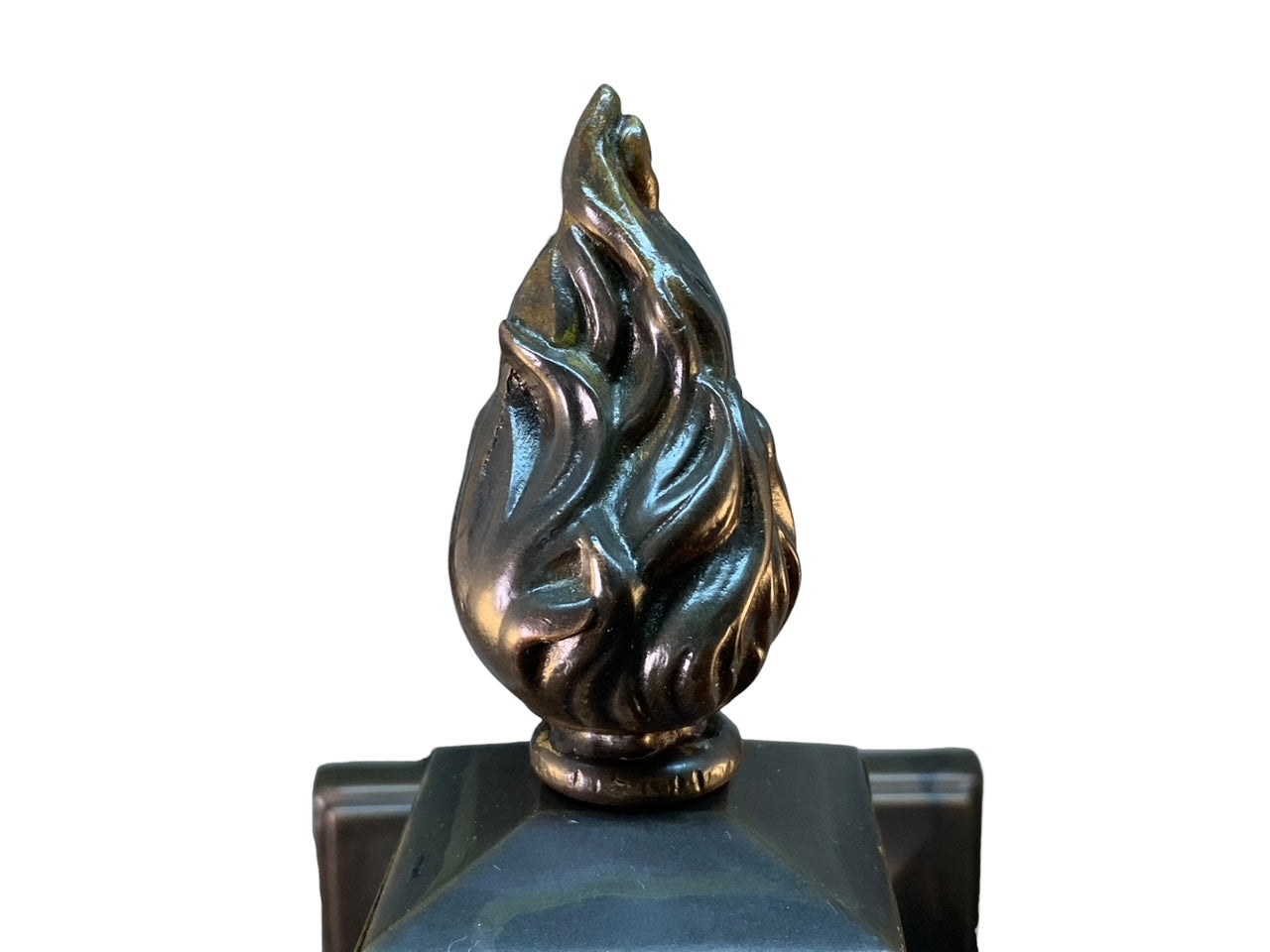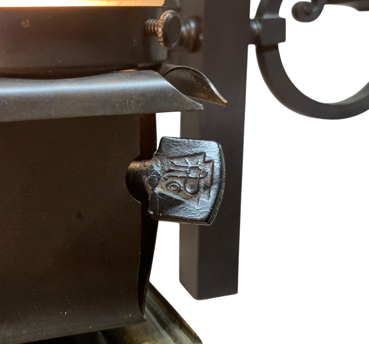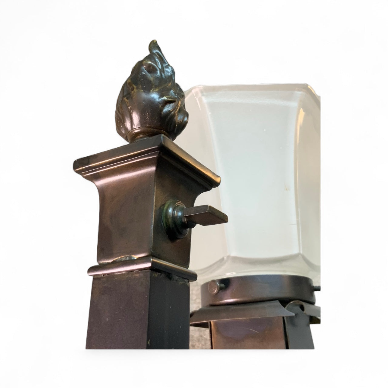 Fabulous solid brass sconces made by Beardslee. Designed to be both gas and electric when the new electric light was not entirely reliable ca 1900-1915. The center solid brass cast flame was removable (now fixed in place) to reveal the gas jet underneath. Two refurbished electric sockets with original turnkeys flank on both sides. Antique hexagonal frosted shades included.