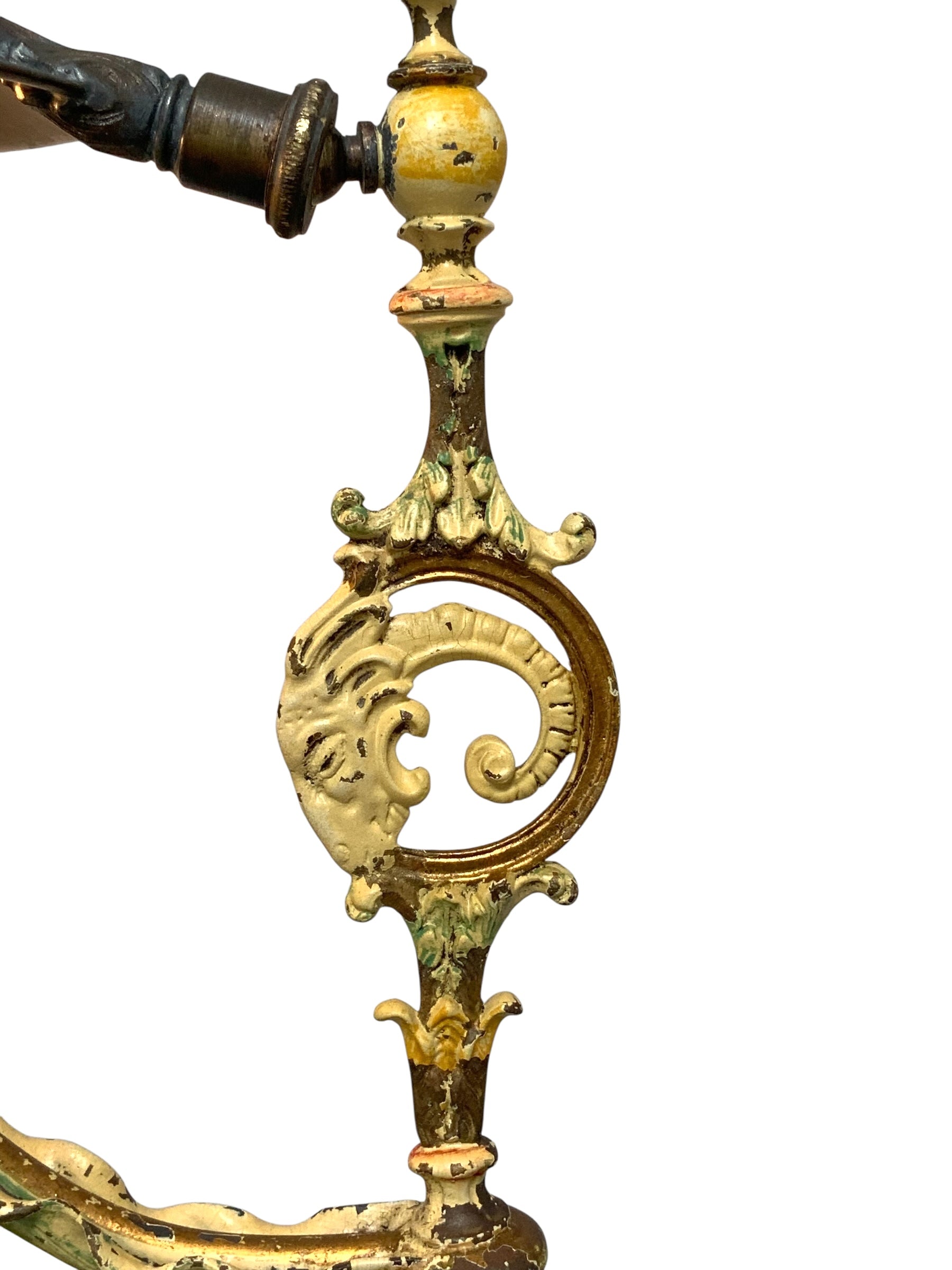 Very unusual lamp from the 1920s with the very worn but beautiful original paint finish. The brass shade is quite interesting--mounted to the body with a swivel. Pullchain on/off. Rewired with new candle cover and plug.