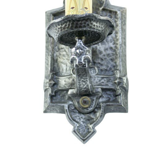 1920s wall sconces by Halcolite and signed on the reverse. Lovely hammered texture and new candle covers. Switch on bottom of fixture. Here shown with our painted Mazda bulbs!