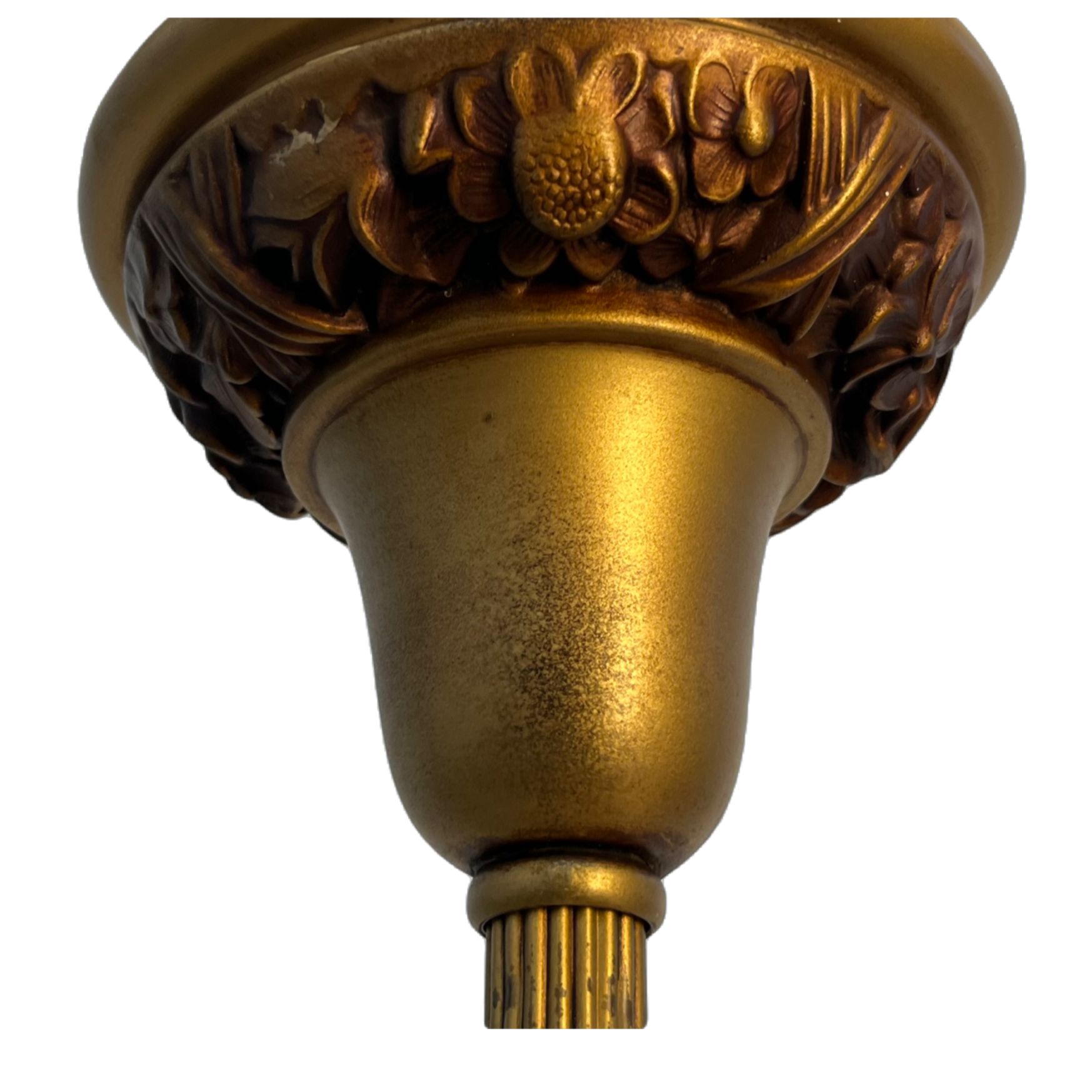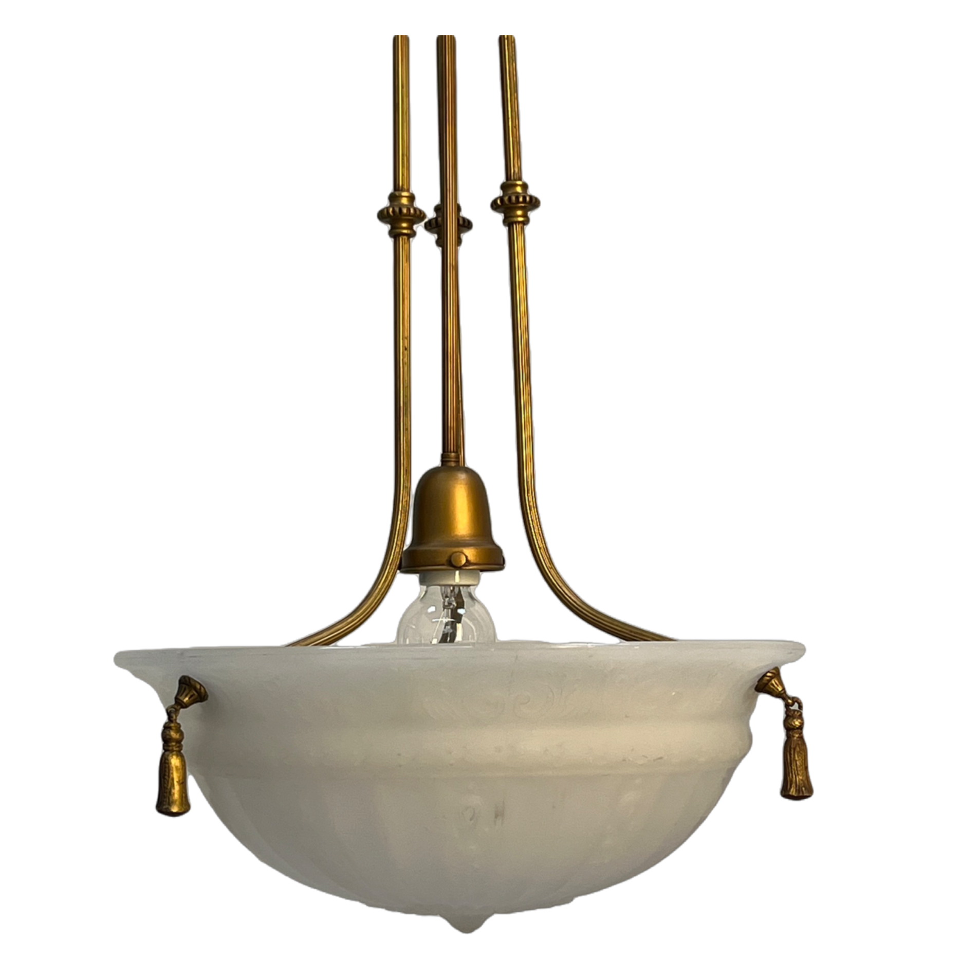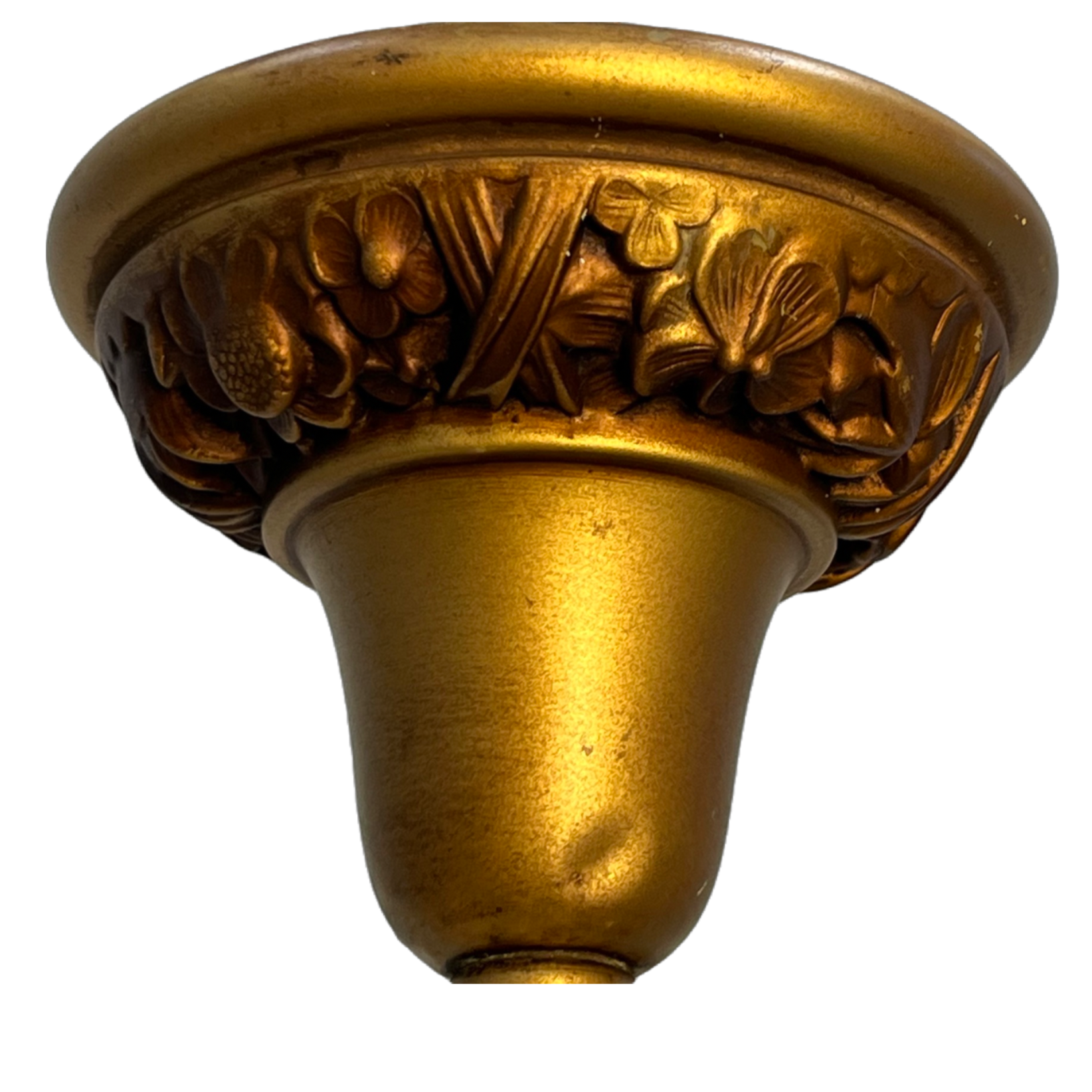 We personally removed these from a Long Beach home built in 1919. Beautiful original finish. Heavy cast glass bowls have leafy pattern and look beautiful when lit. These bowls will provide a soft overall light with light through the glass and reflected off your ceiling. These seem to have once had inner reflector shades but now long gone. Can add them back if desired. Each fixture takes one bulb. Note one small dent on canopy and one small repair to exterior tassle finial. See photos.