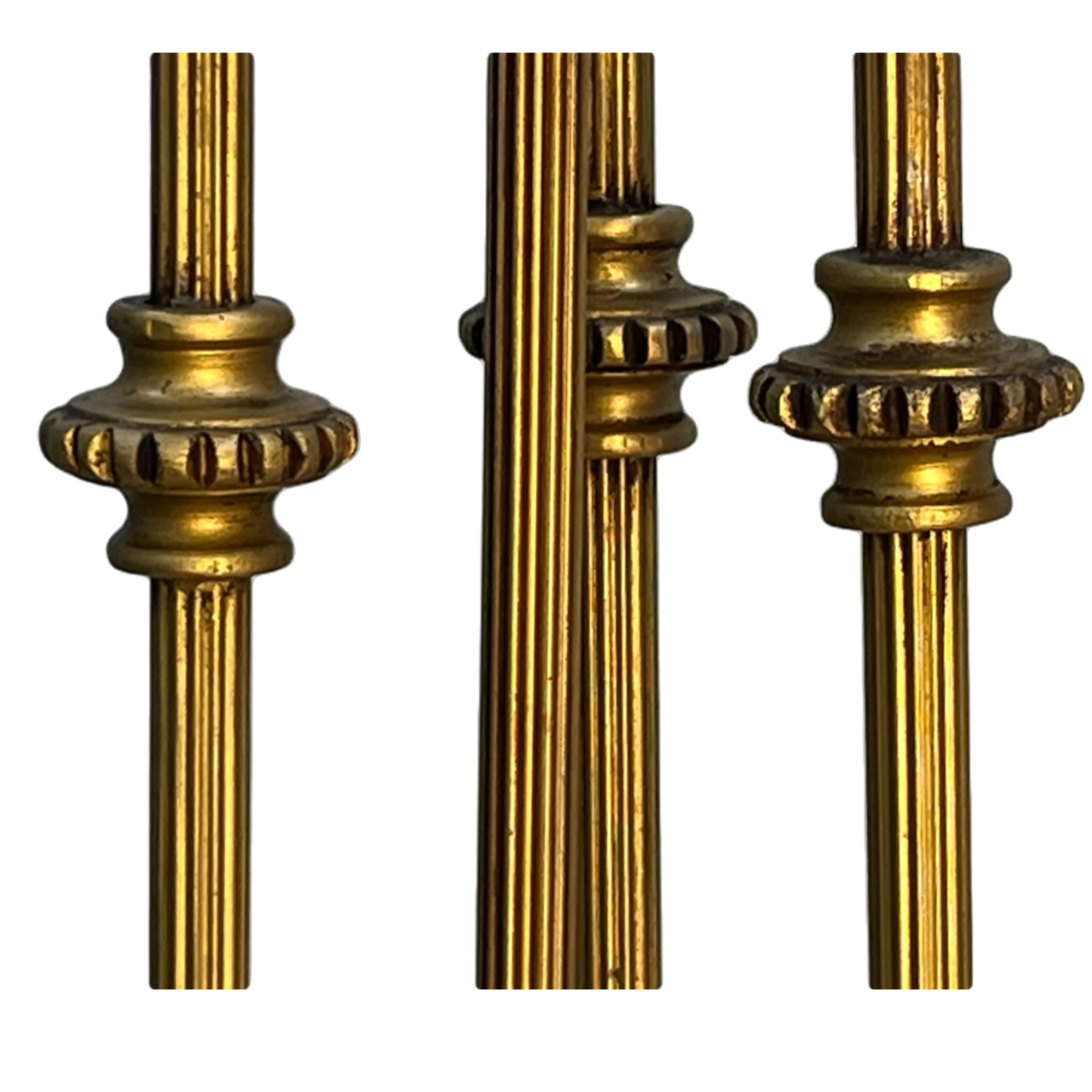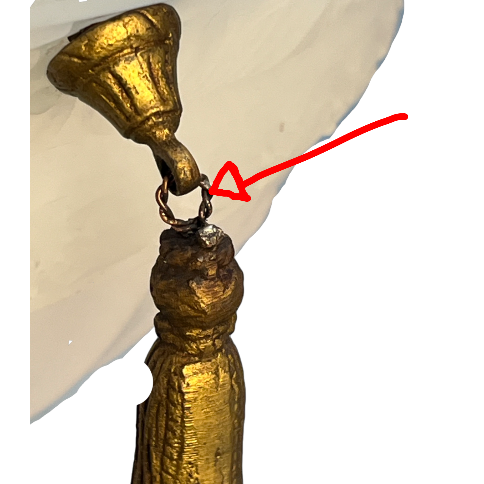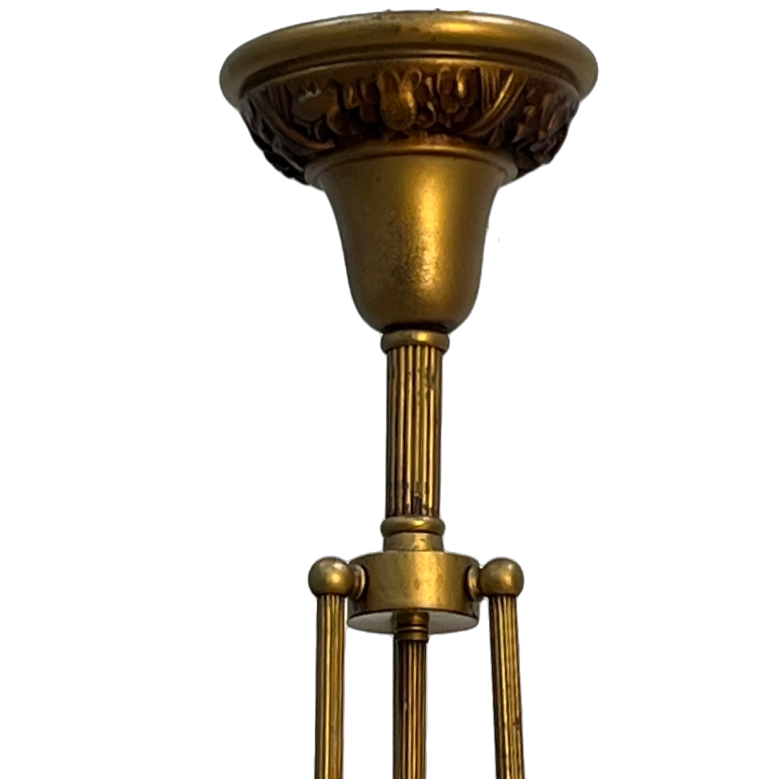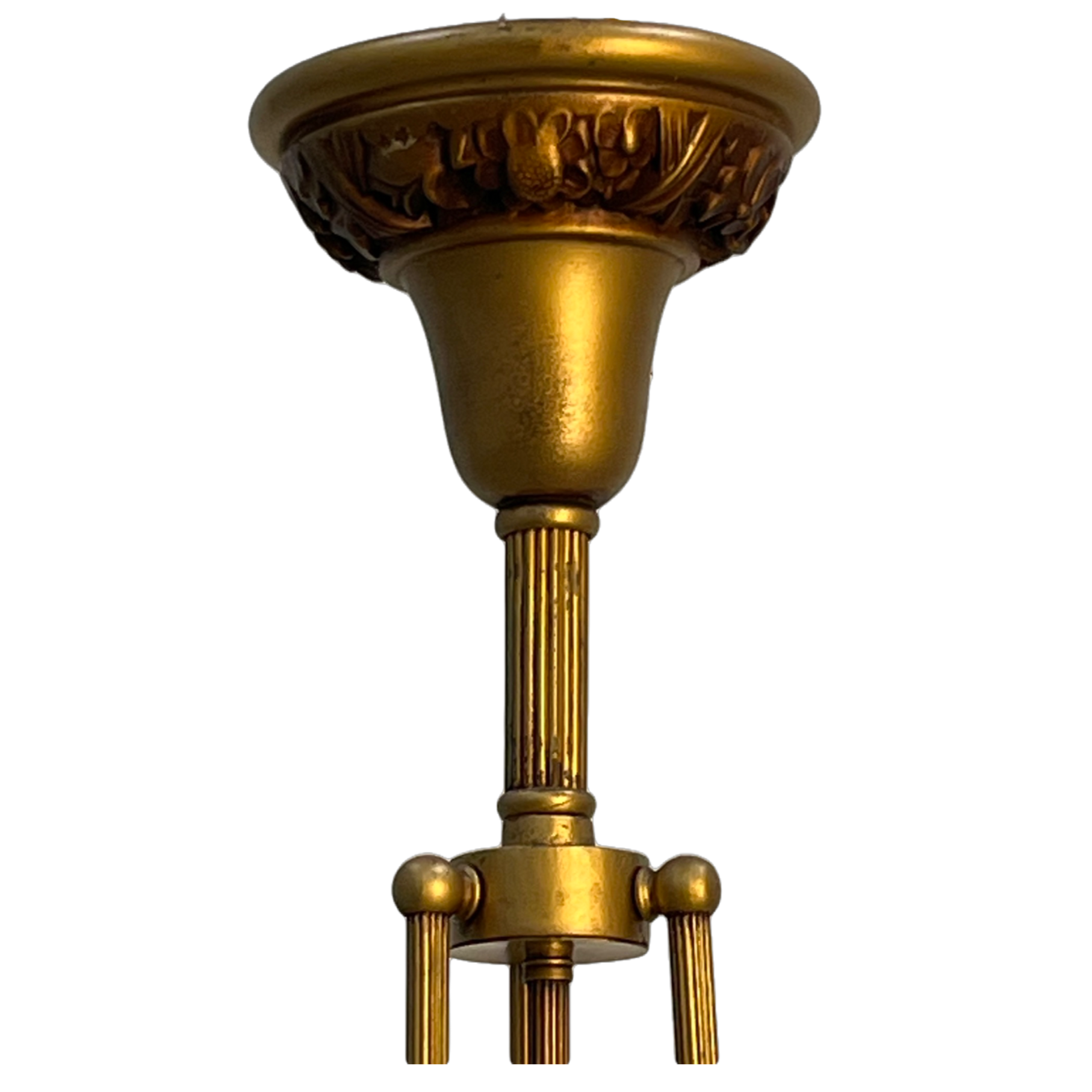 We personally removed these from a Long Beach home built in 1919. Beautiful original finish. Heavy cast glass bowls have leafy pattern and look beautiful when lit. These bowls will provide a soft overall light with light through the glass and reflected off your ceiling. These seem to have once had inner reflector shades but now long gone. Can add them back if desired. Each fixture takes one bulb. Note one small dent on canopy and one small repair to exterior tassle finial. See photos.