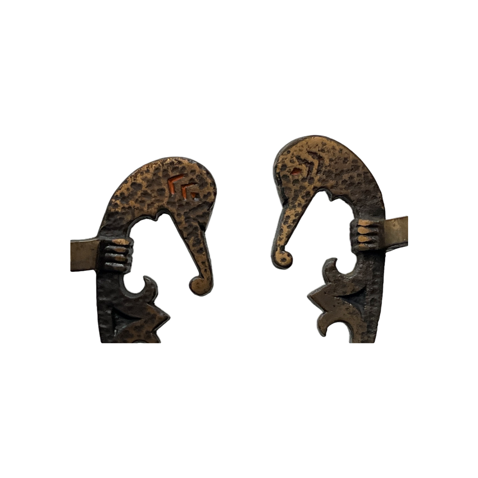 One pair small Spanish Revival table lamps in cast bronze with original finish. Probably 1920s or 1930s. The wall sconce and pendant lights with this design are much more commonly seen. These have their original finish with red and blue highlights. Shown here with one of our painted Mazda 25w incandescent flame bulbs.