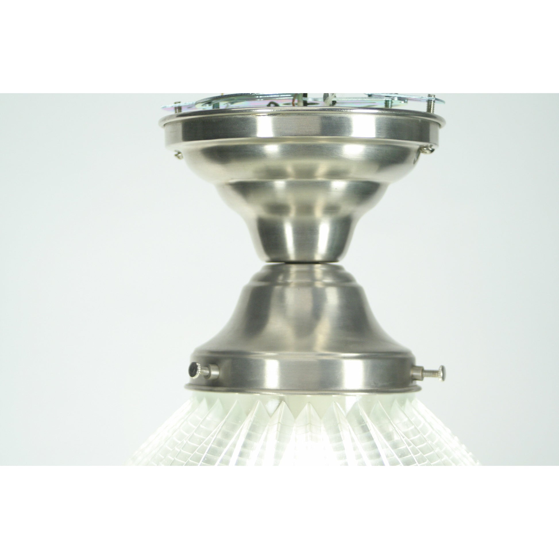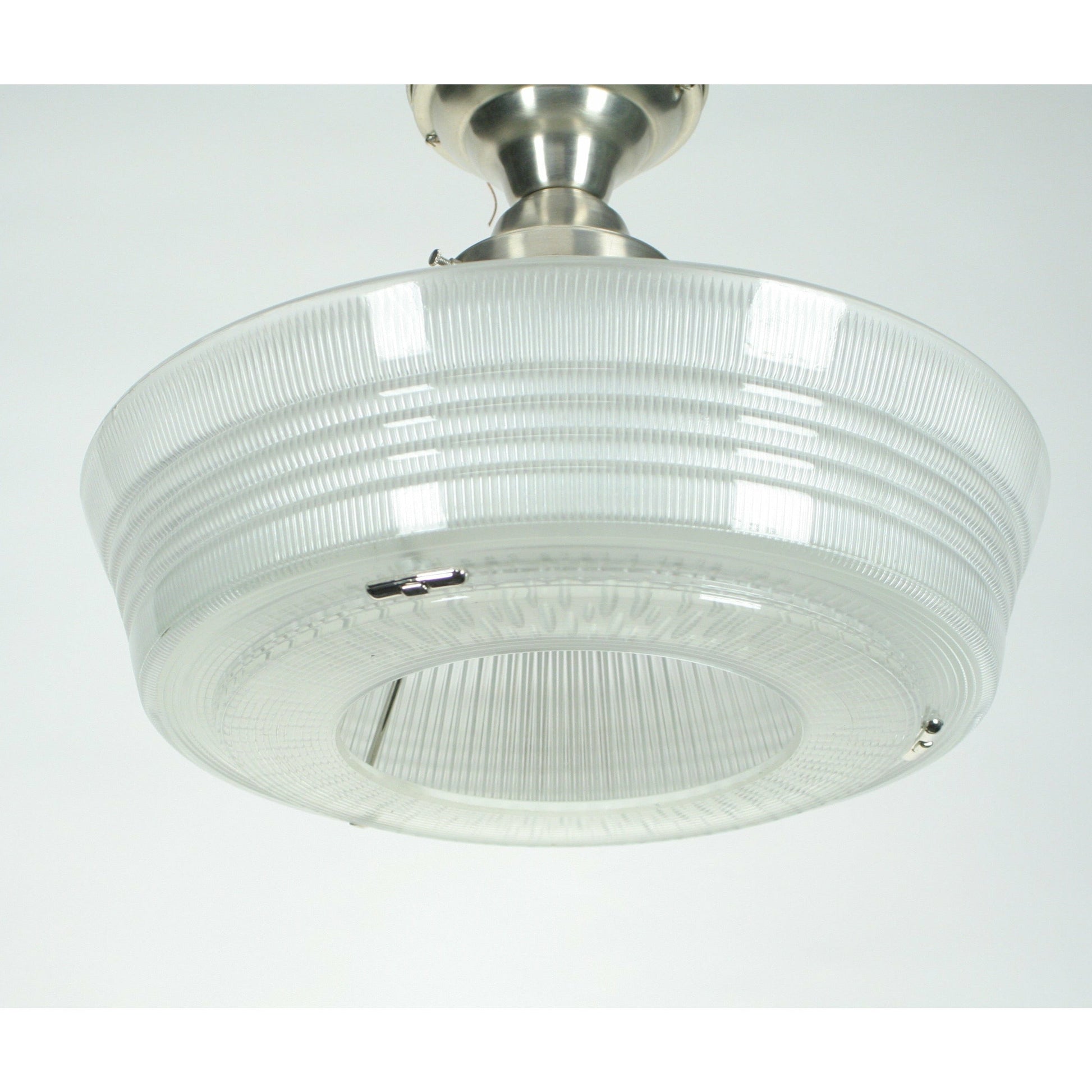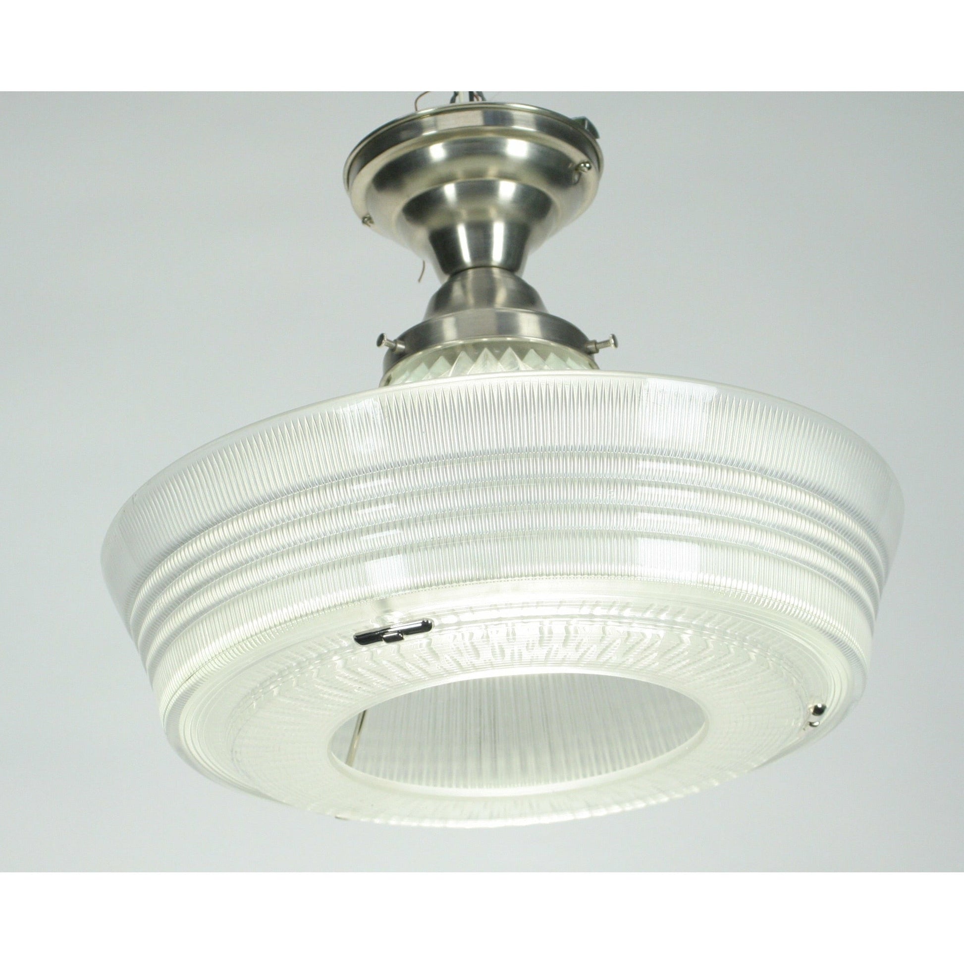 We've got several of these available, commonly known as "Sailor Hat" lights. Holophane lights are known for their prismatic glass shades that scatter the light. Two large solid glass shades hang from a metal fixture. Original patent filed in 1938 and granted in 1941 as shown. Here set up as a semi flush in brushed nickel but also can be supplied it in other finishes (polished nickel, brass, etc) and larger fixtures if you need more drop from a tall ceiling. We've also got a couple with the original diffuser that covers the hole in the bottom. New polished nickel plating on the lower shade holders seen from the bottom.