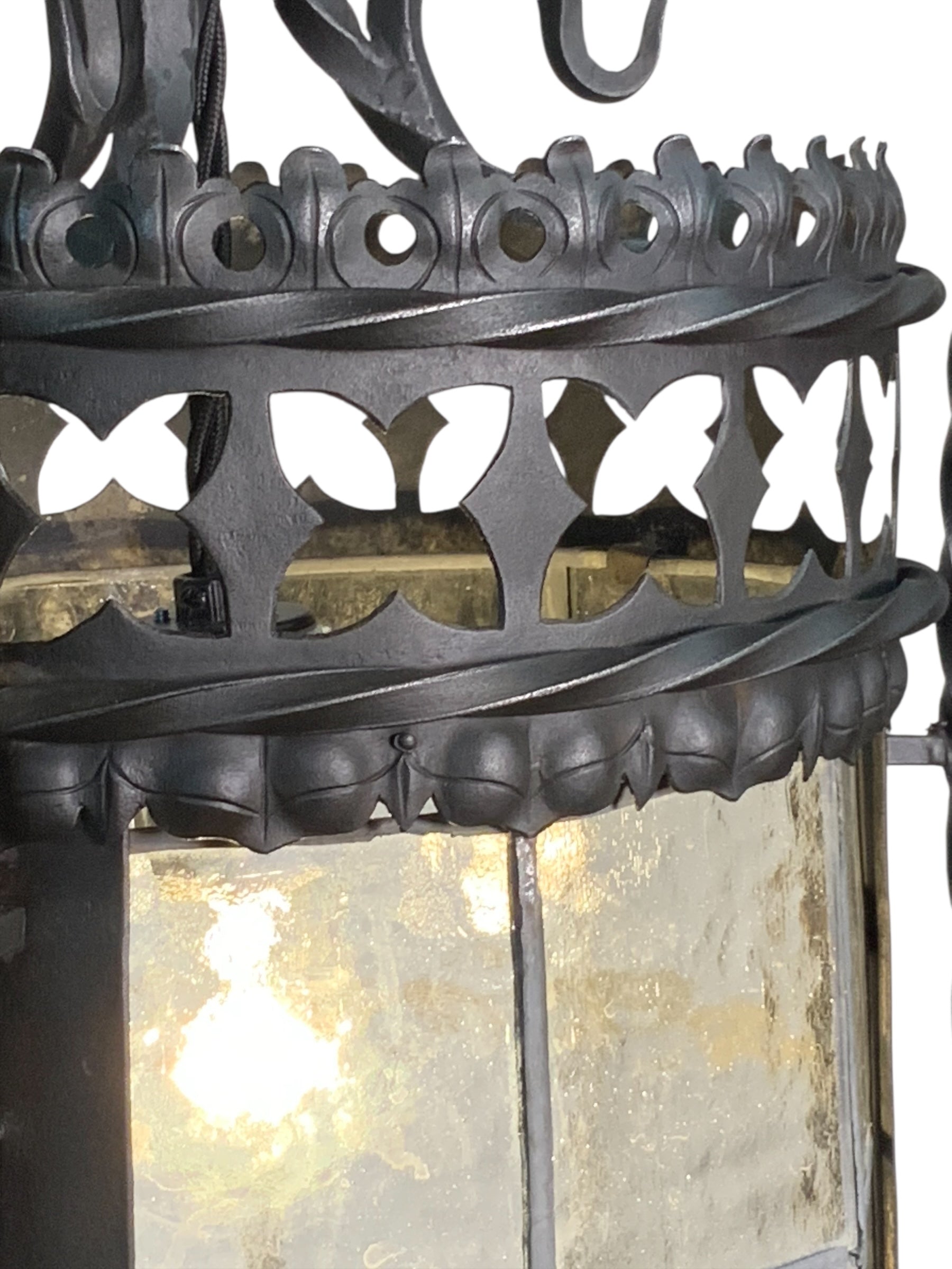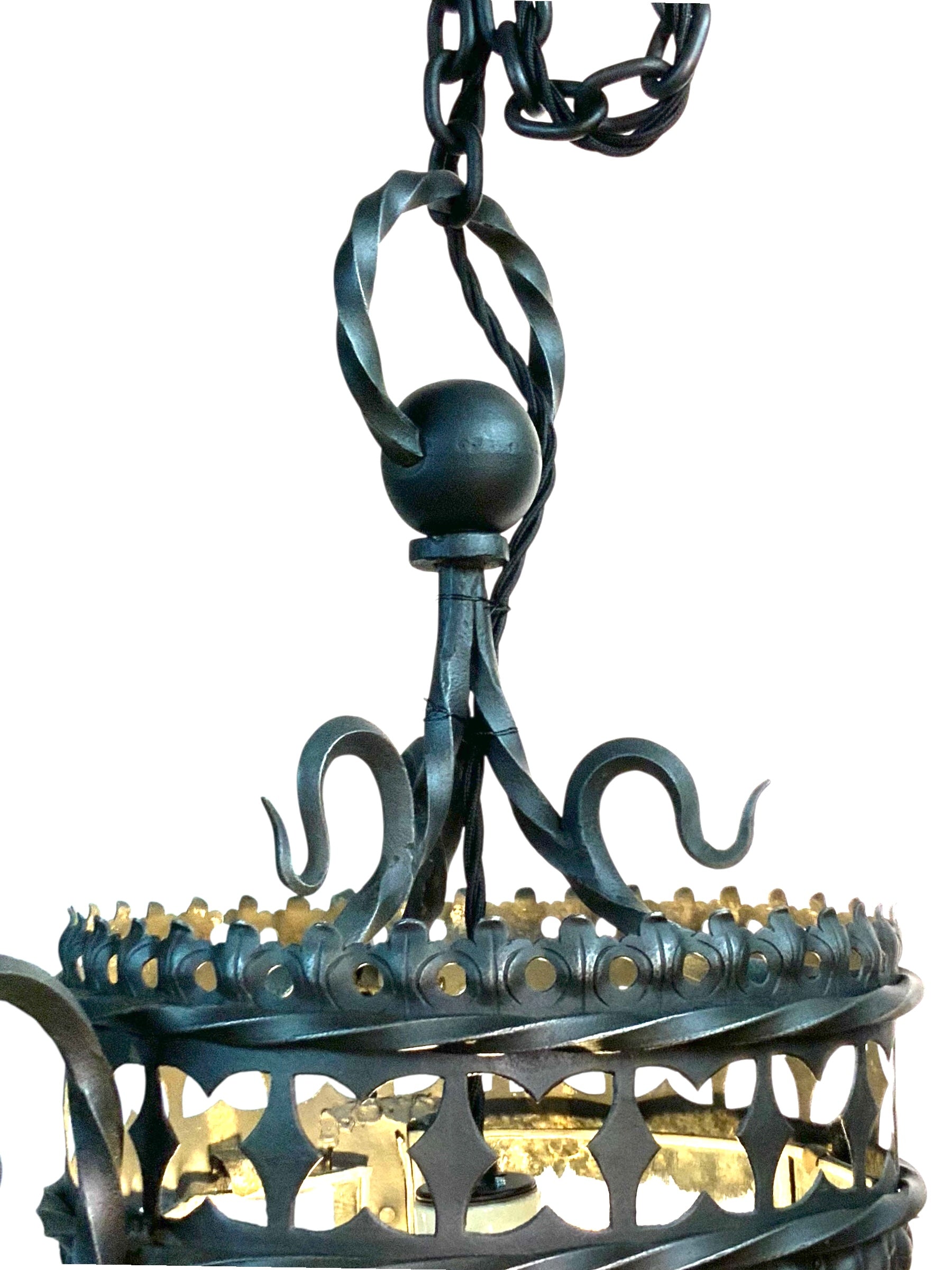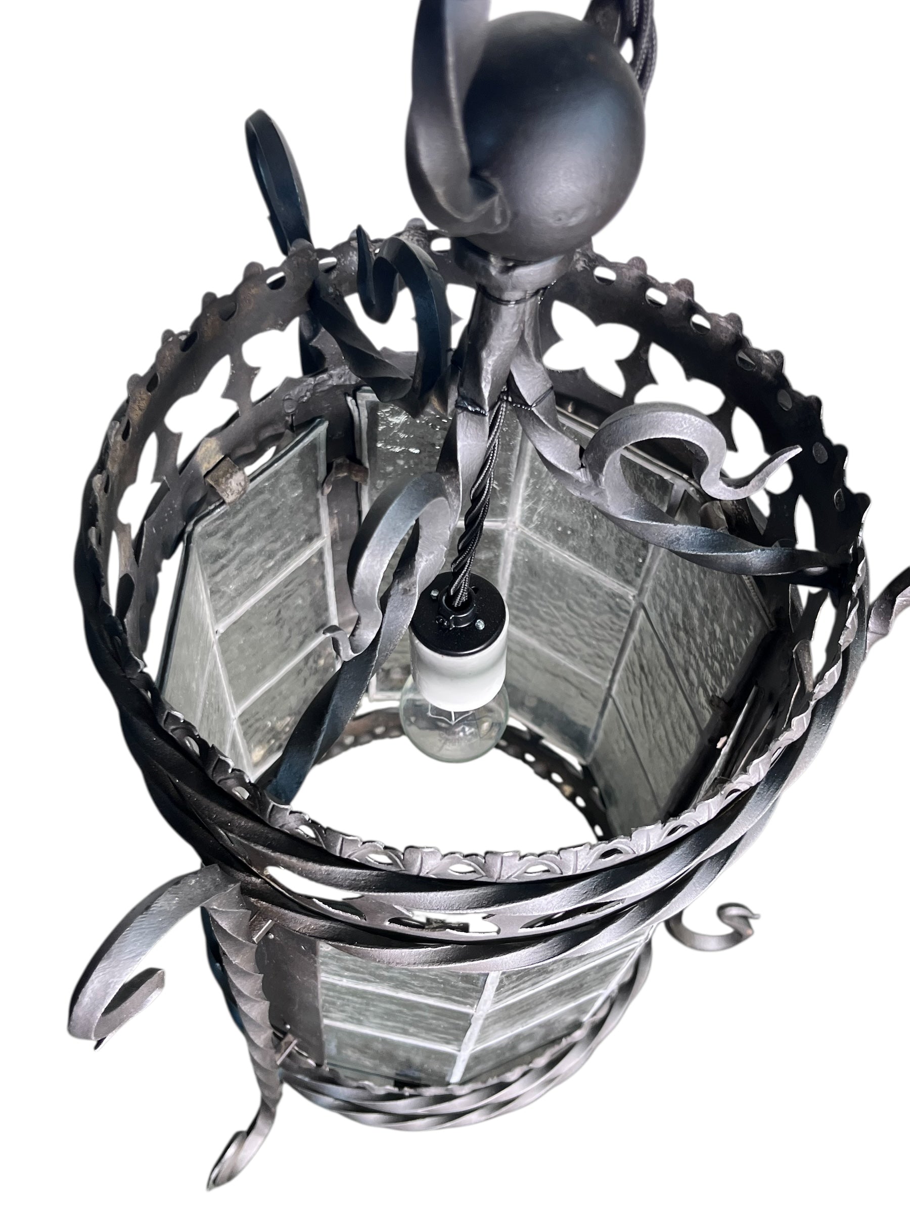 Fabulous Spanish Revival pendant with amazing hand hammered whiplash hooks and original clear leaded glass. New blackened finish on the steel and cast iron. Here shown with chain retracted. This light screws to ceiling. Can be shortened before shipping.
