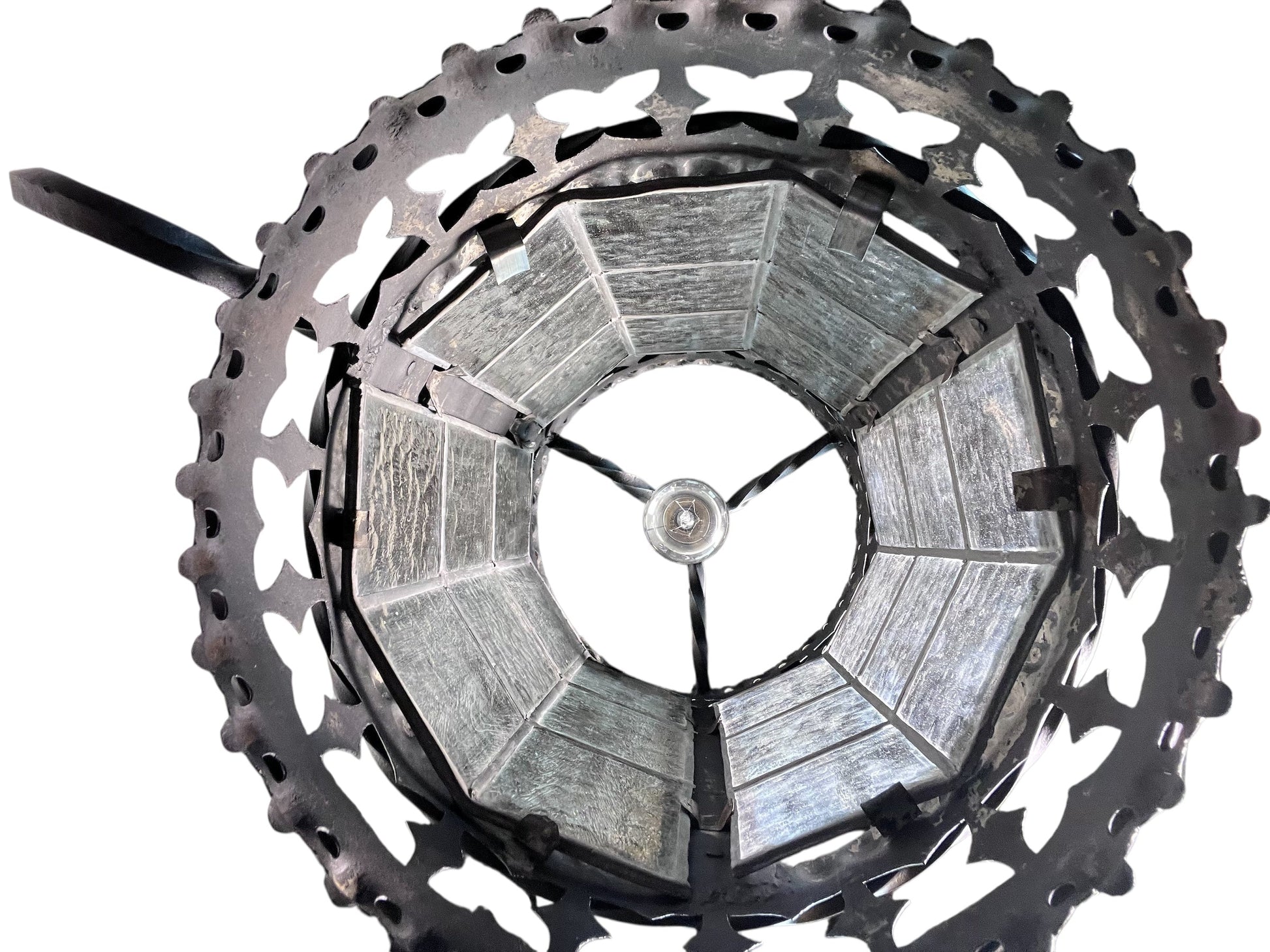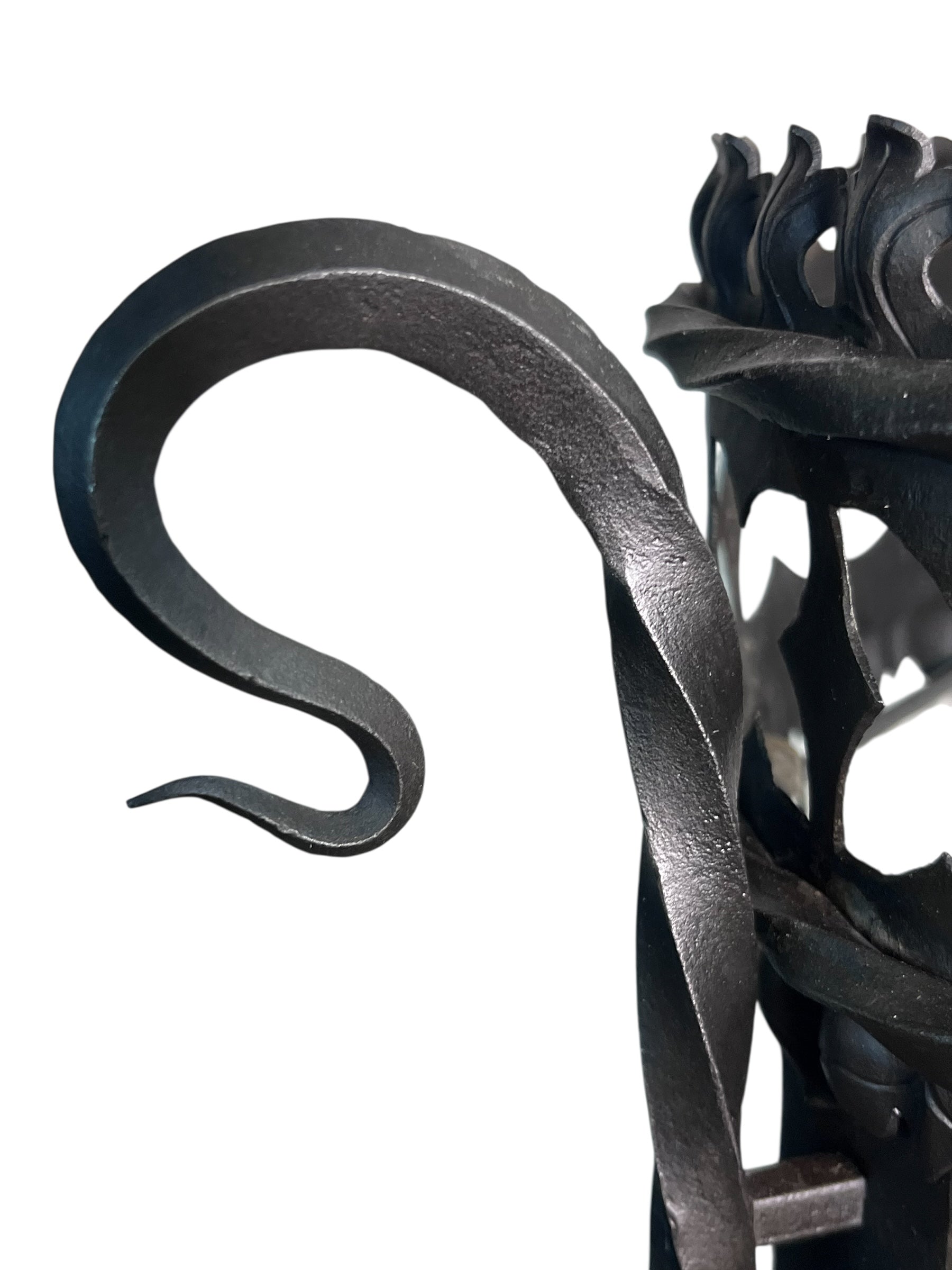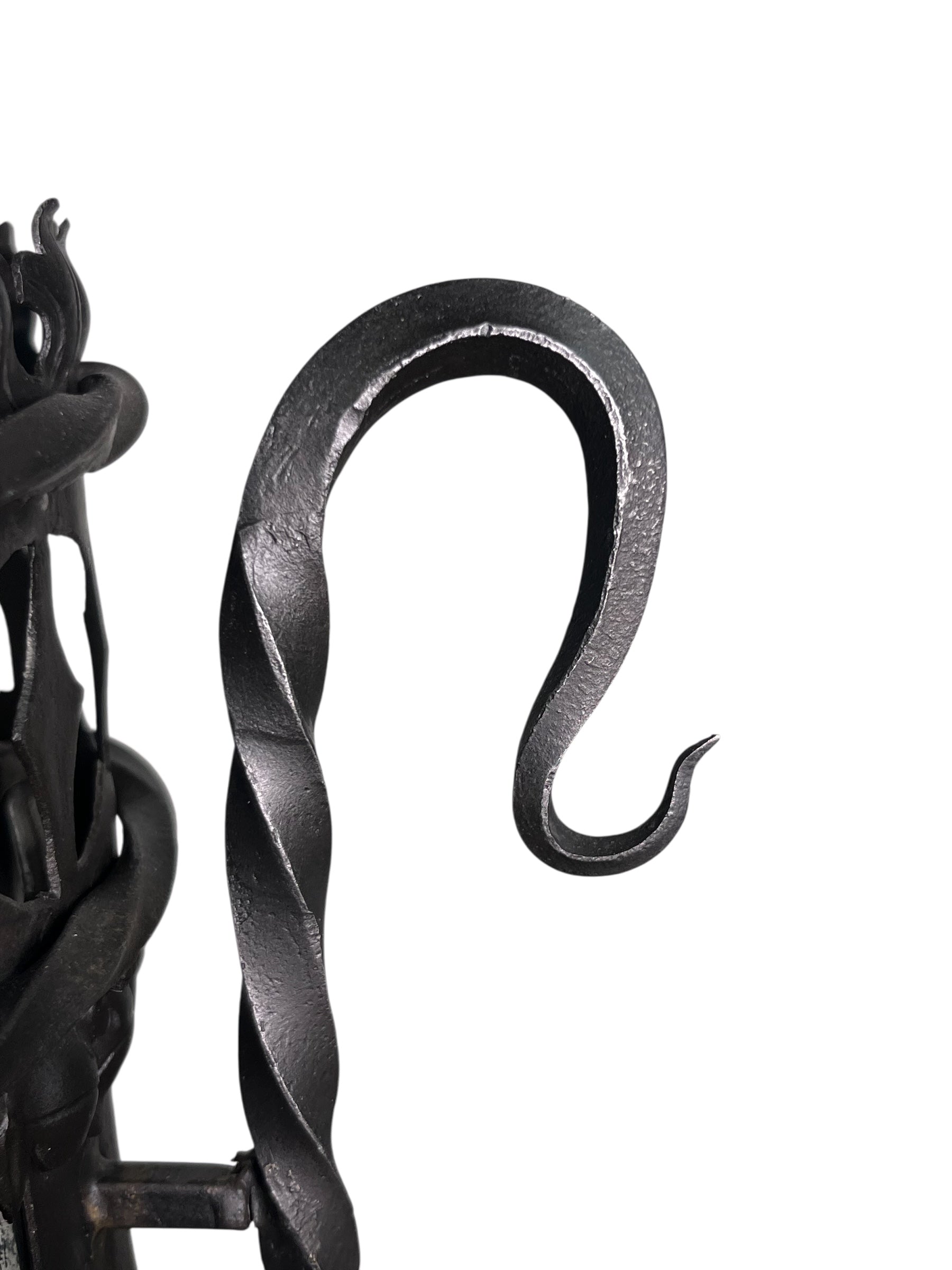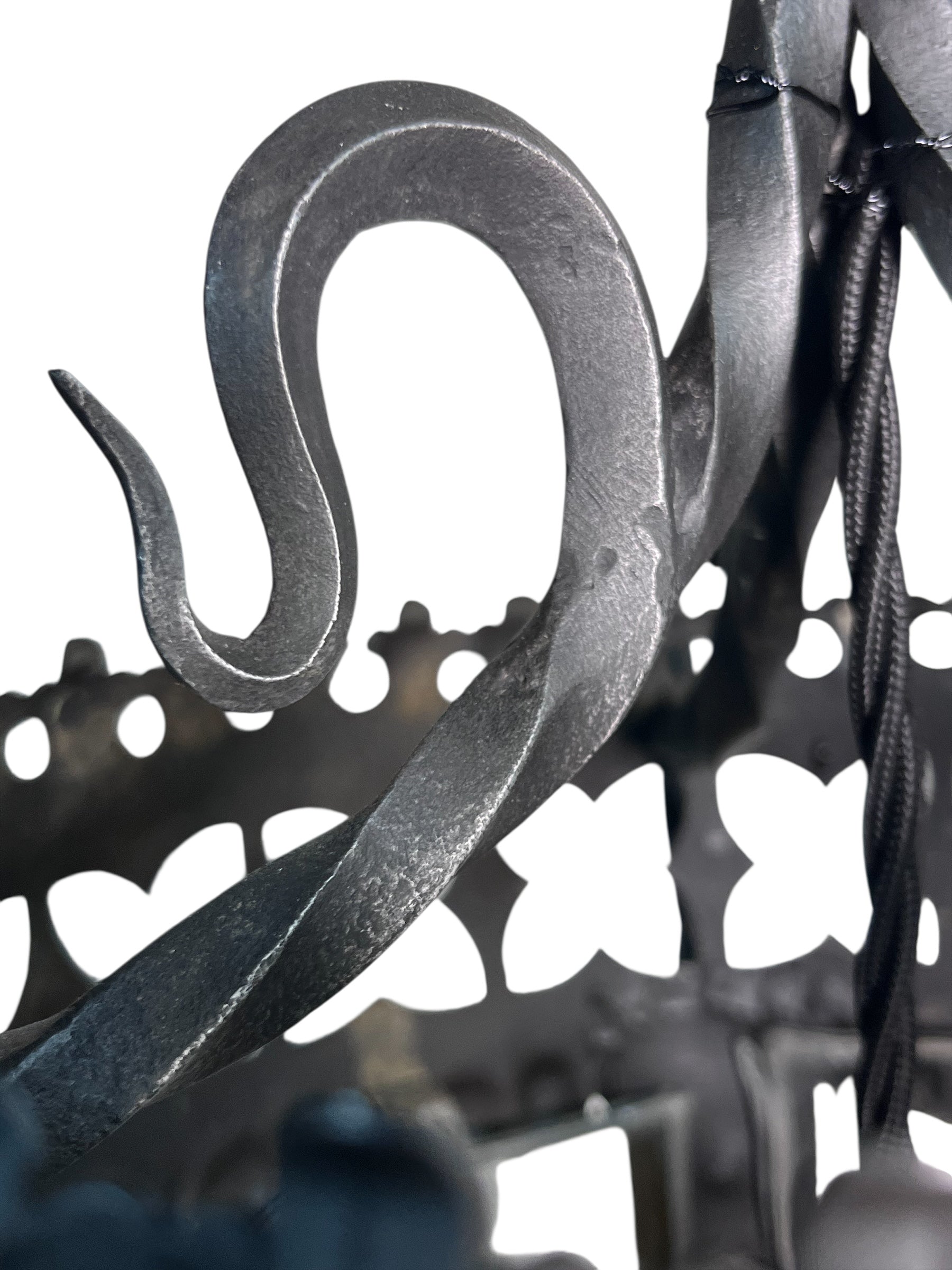 Fabulous Spanish Revival pendant with amazing hand hammered whiplash hooks and original clear leaded glass. New blackened finish on the steel and cast iron. Here shown with chain retracted. This light screws to ceiling. Can be shortened before shipping.