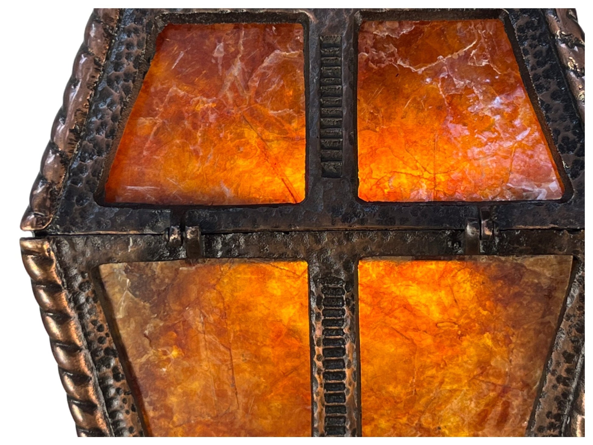 Hard to find a place to start describing this amazing lamp by Brady of Detroit. Cast in heavy solid bronze, and with revived original finish, plus a new coat of lacquer to keep it looking amazing. Deep hammered texture across the whole piece. We cleaned the original mica panels in the lamp and rebuilt the original lamp switch, added a new porcelain socket and vintage style double twist wire and button plug. Inside the lantern is a foldaway reading lamp (quite dim by modern standards) with focusing lens. The mid point of this piece contains smoking accessories--nickel ashtray, pullout electric lighter, and the lid to a cigarette jar. The jar is long gone but the lid remains. Inside the spring loaded retractor for the lighter remains but the lighter is no longer working. Plus--this piece has a built in swivel, so the lamp can sit between two leather easy chairs perhaps a Morris chairs? Note Charles Brady's patent for a nearly identical Combination Smoking Stand and Lamp. Same base, but lantern is different.