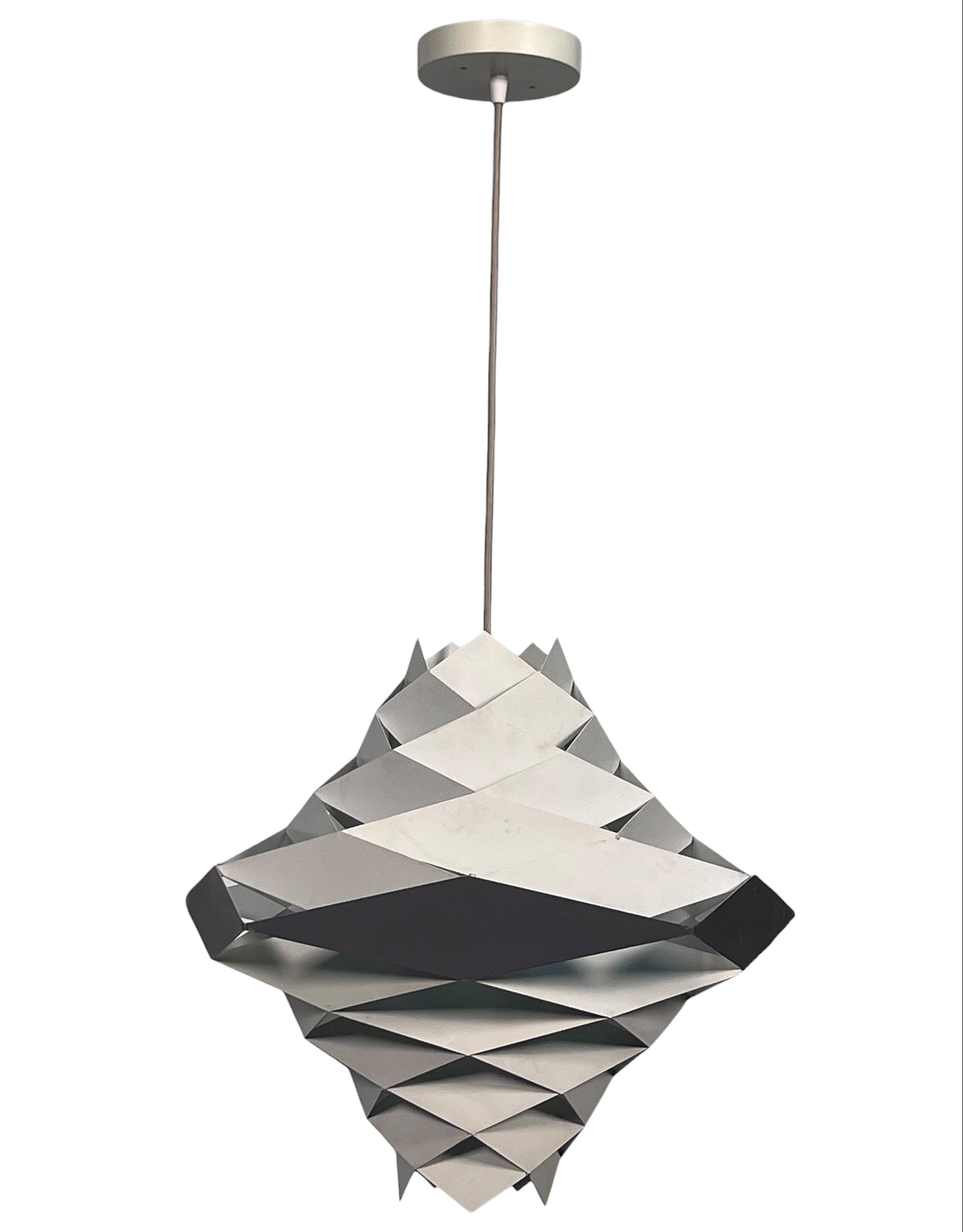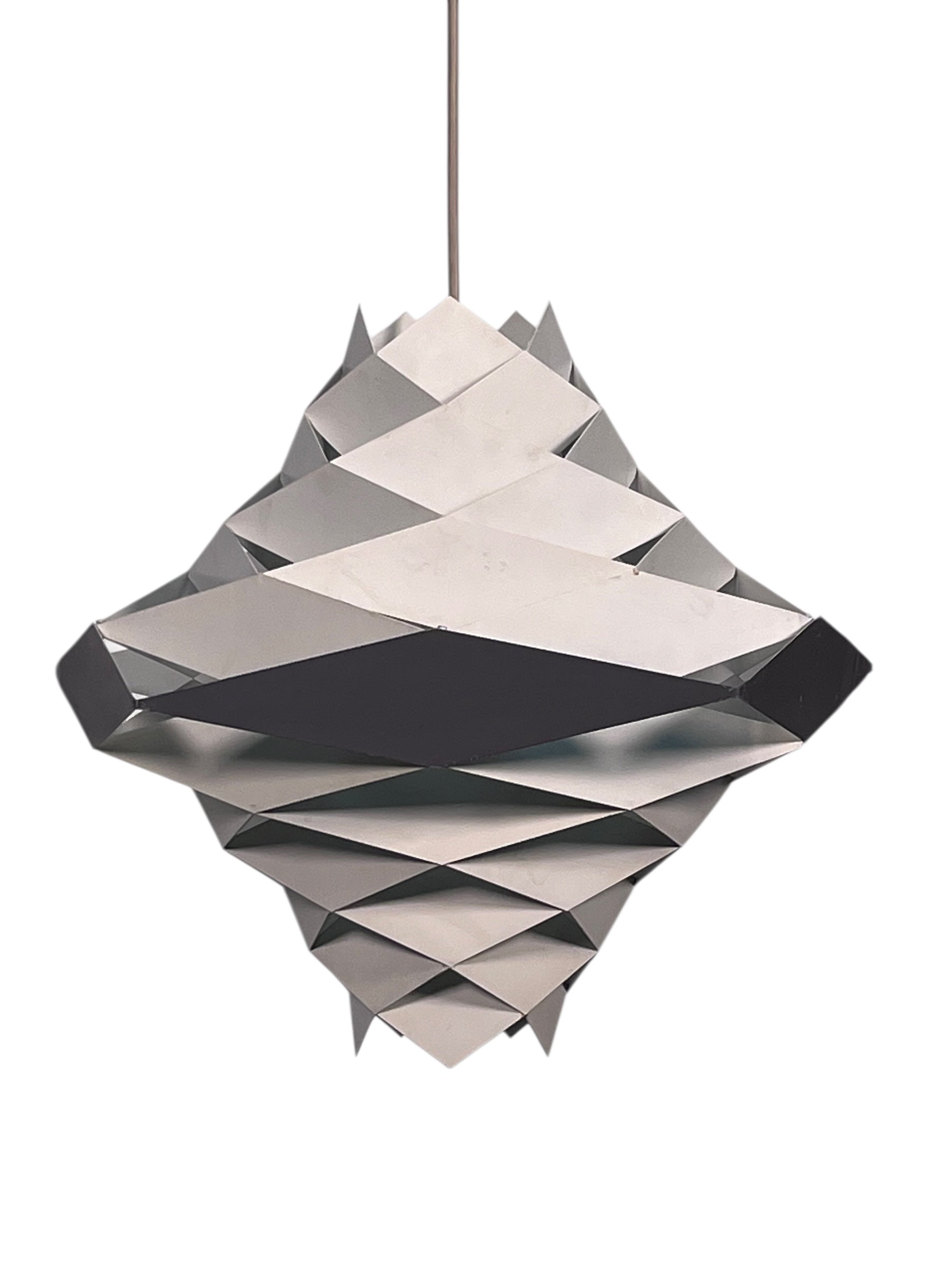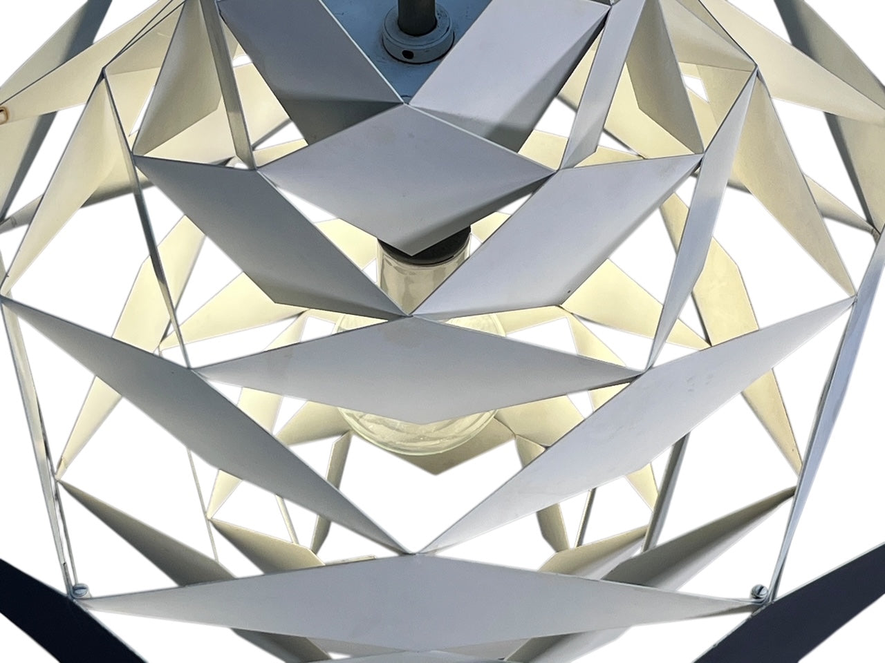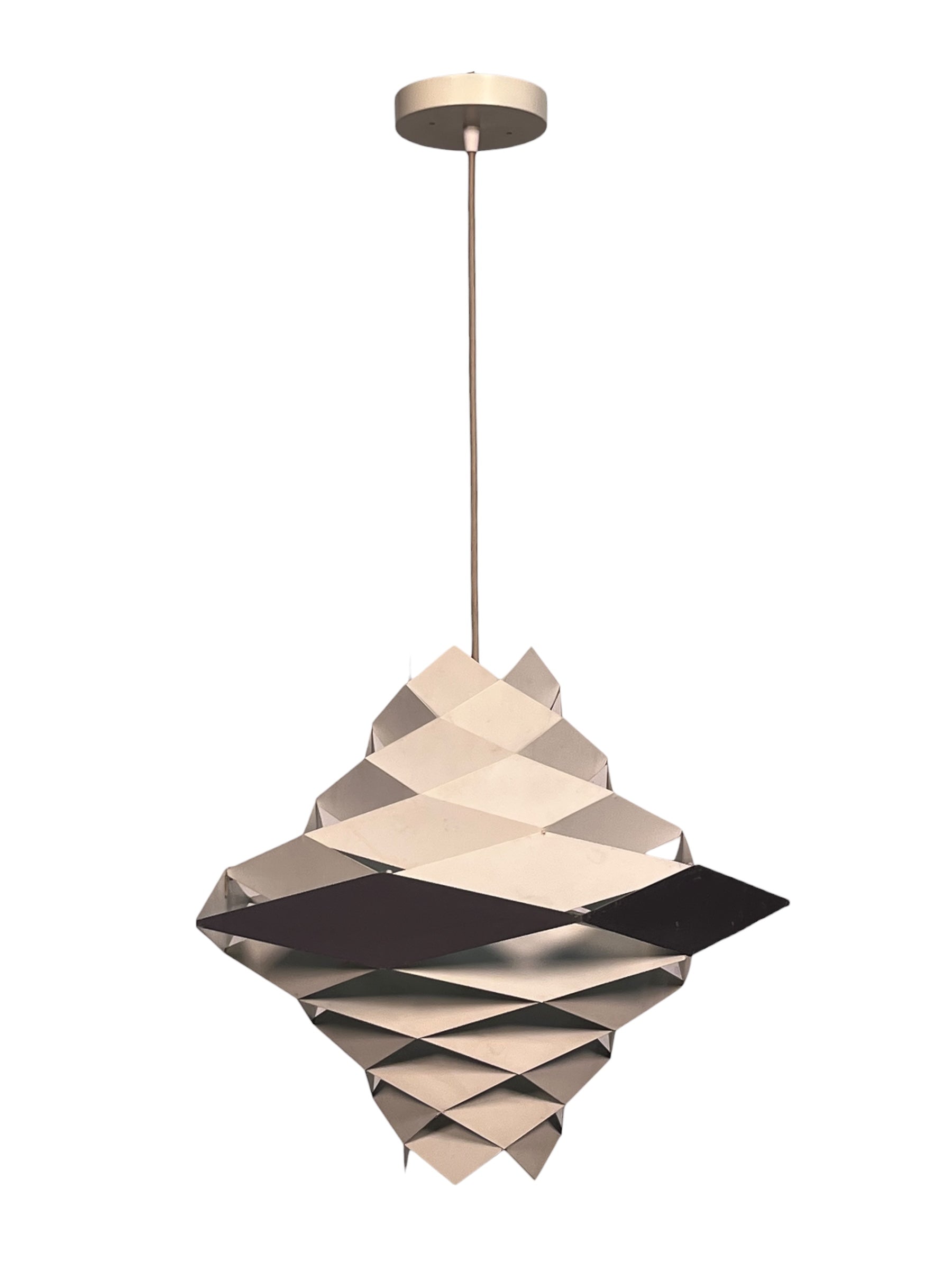 Here is an early 1960s pendant light fixture from Preban Dal's 'Symfoni' series, designed for Hans Følsgaard Elektro of Denmark. The steel frame is painted white and gray origami—like panels that diffuse the internal light and scatter it in visually interesting patterns. It is fully functional and in very good vintage condition, showing some age-appropriate wear and a limited amount of scratches to the piece's grey panels. These can be repainted if desired. New taupe colored cloth covered wiring and ceiling canopy.