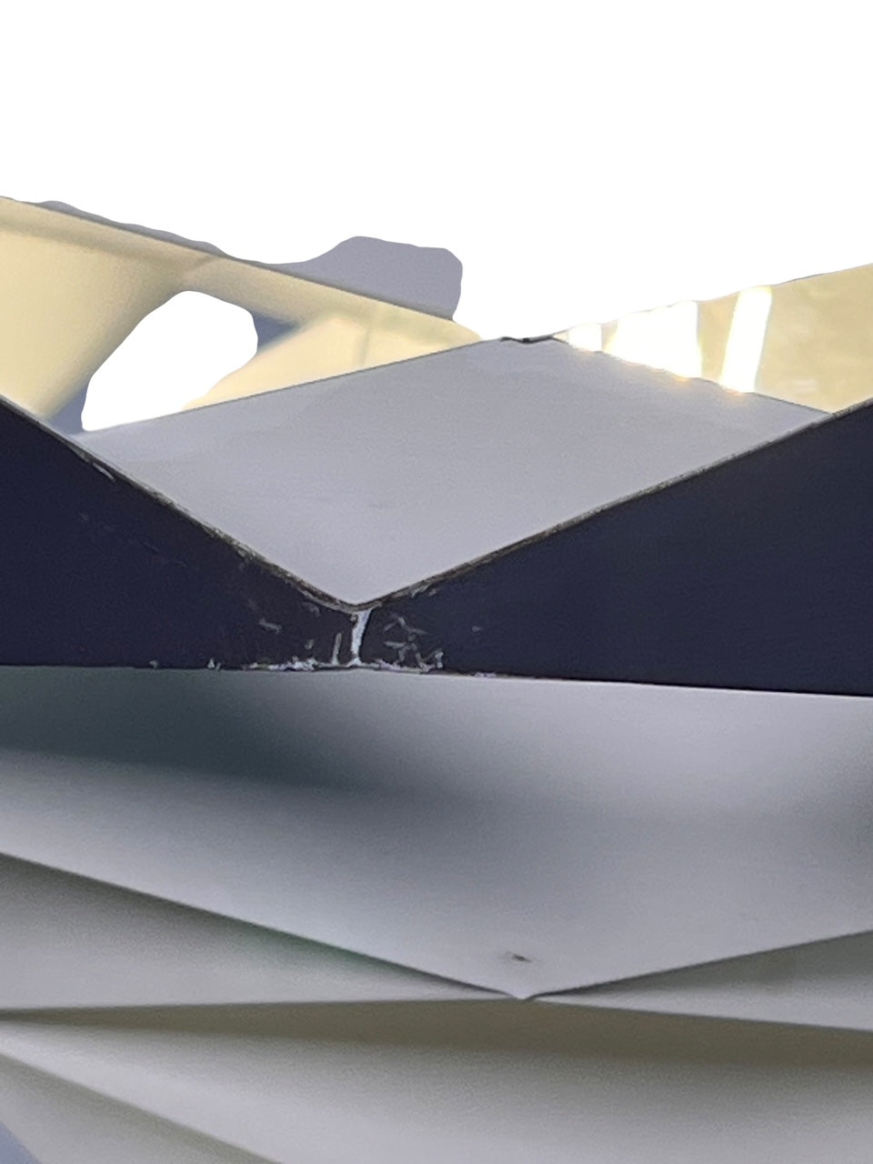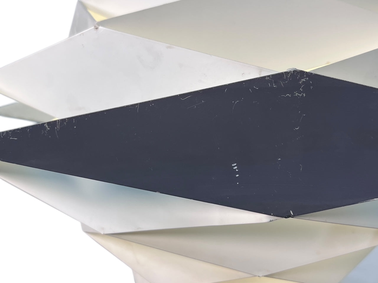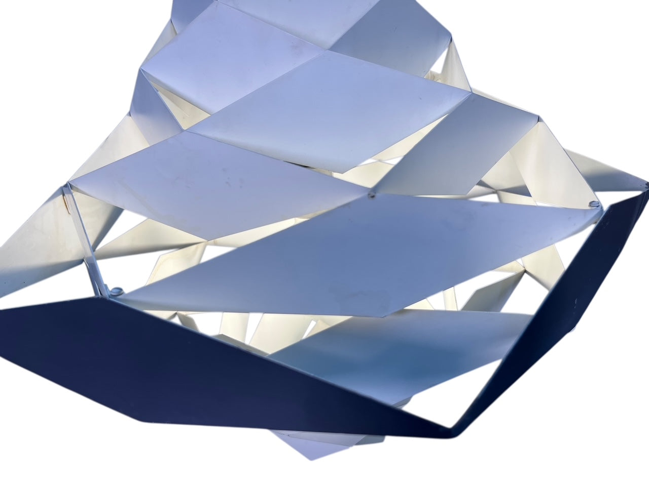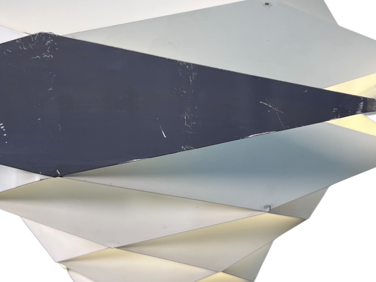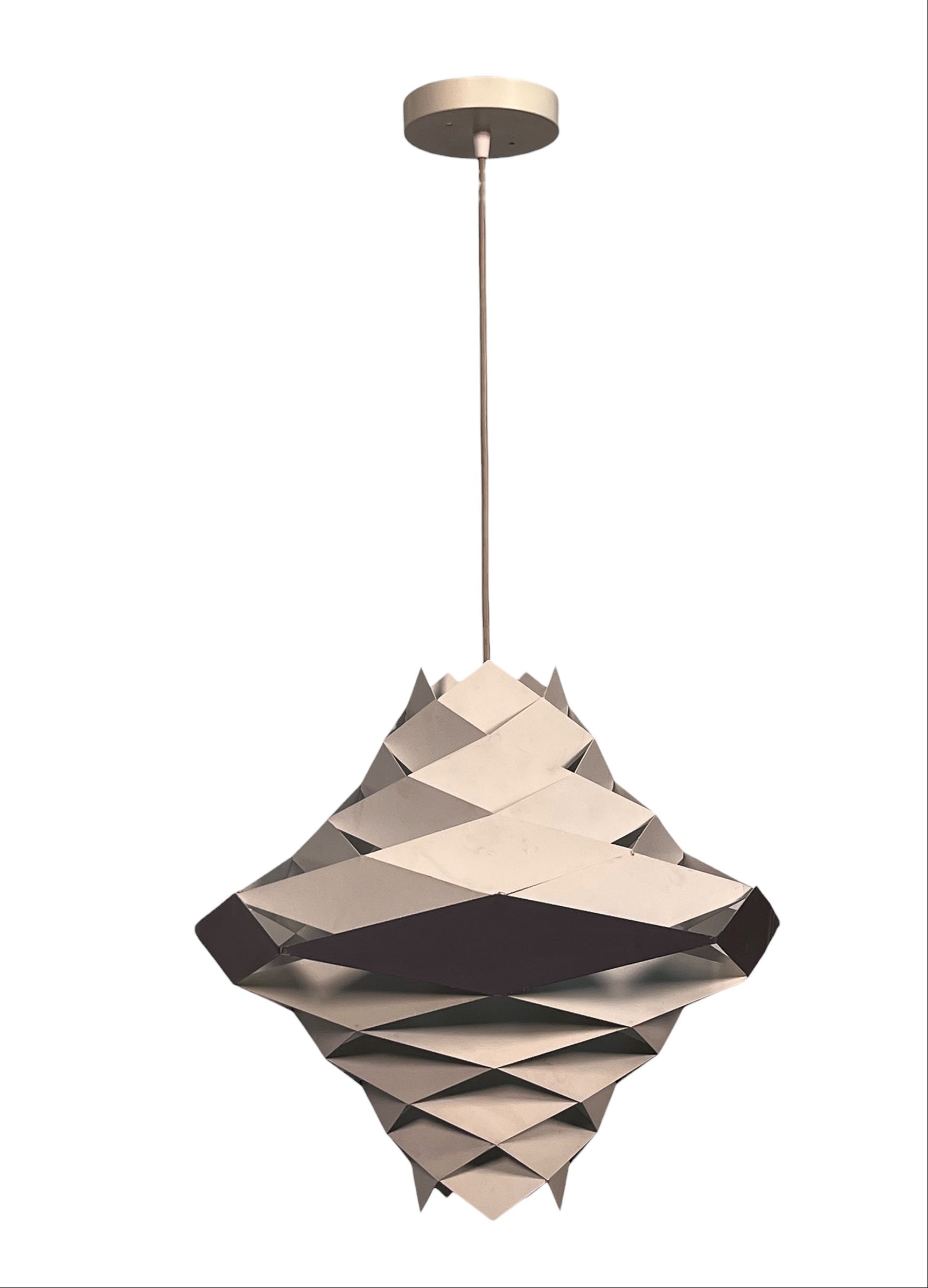 Here is an early 1960s pendant light fixture from Preban Dal's 'Symfoni' series, designed for Hans Følsgaard Elektro of Denmark. The steel frame is painted white and gray origami—like panels that diffuse the internal light and scatter it in visually interesting patterns. It is fully functional and in very good vintage condition, showing some age-appropriate wear and a limited amount of scratches to the piece's grey panels. These can be repainted if desired. New taupe colored cloth covered wiring and ceiling canopy.